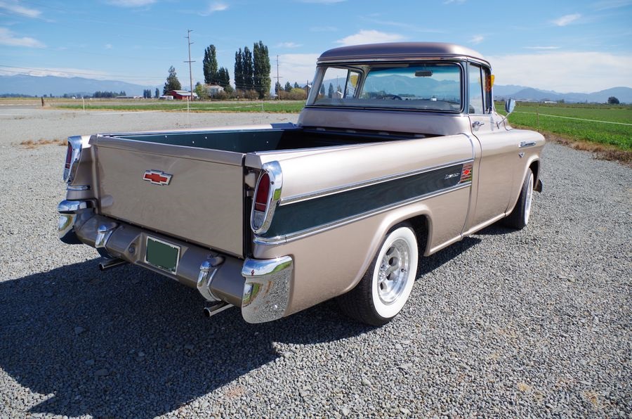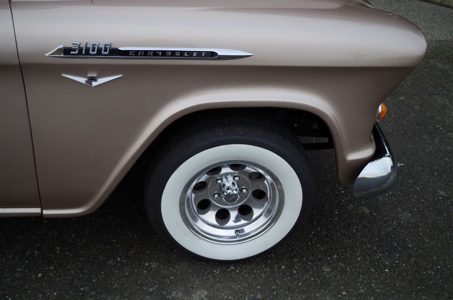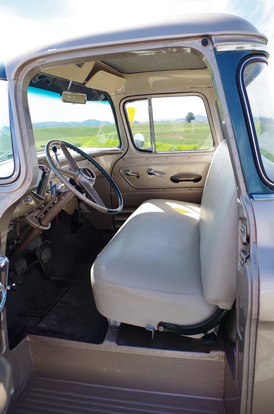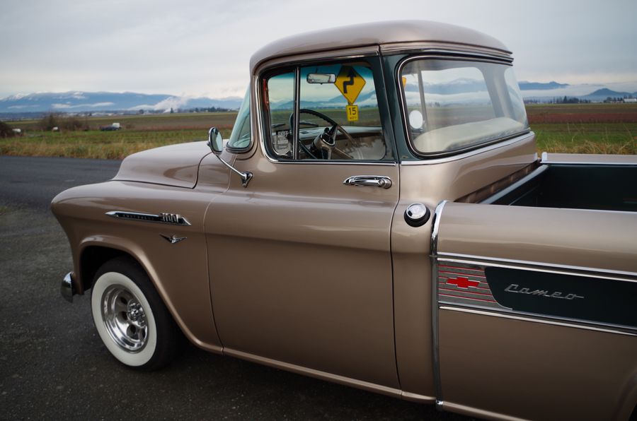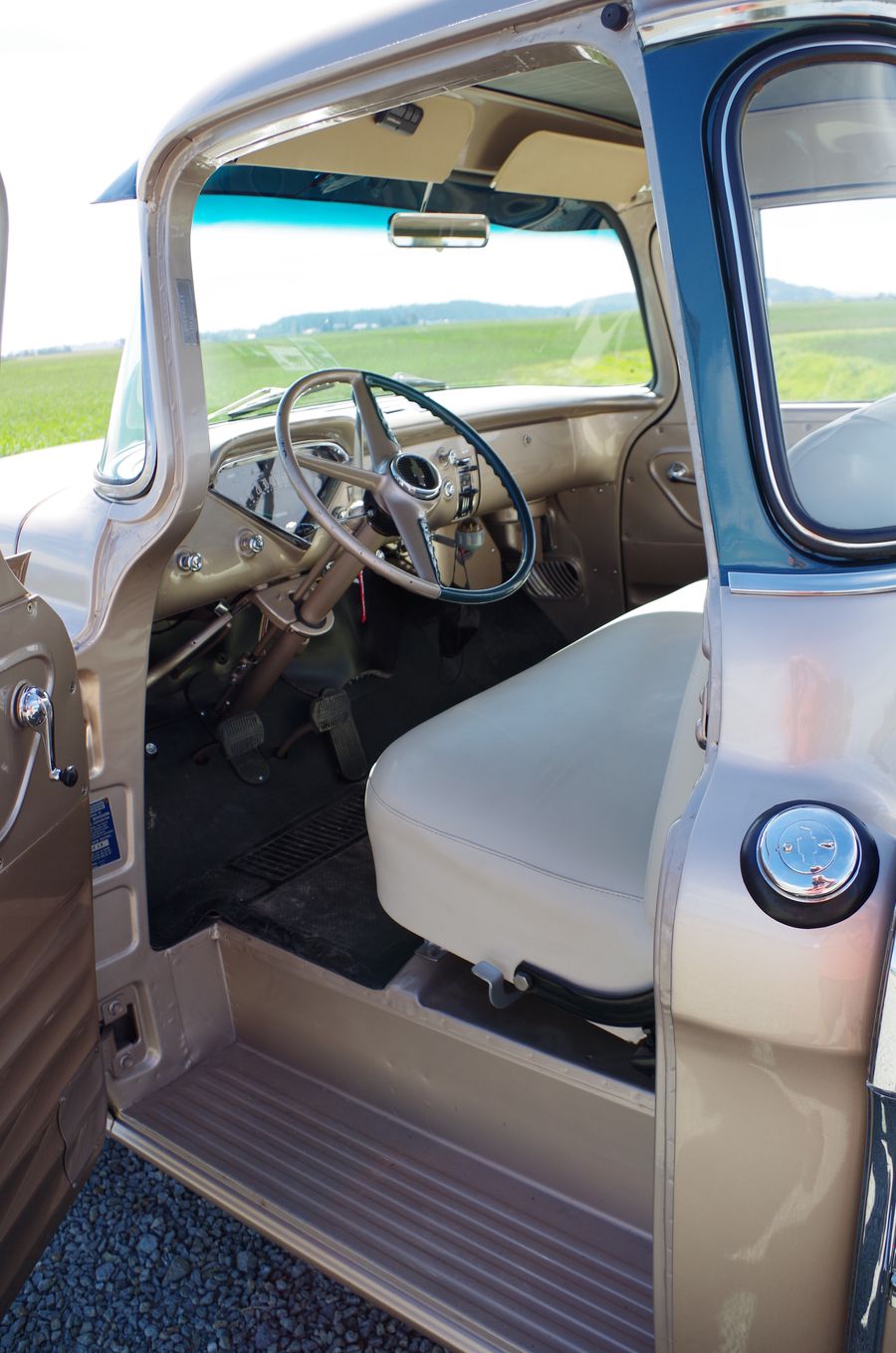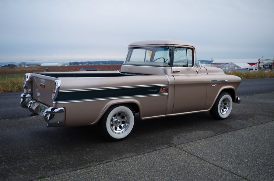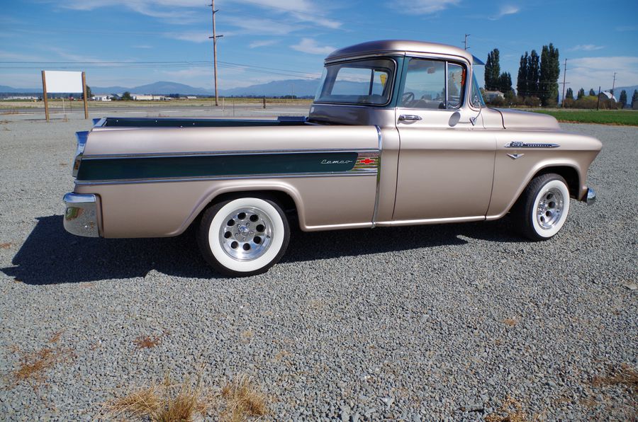 This has to be the nicest, most beautiful and well maintained 1956 Chevy Cameo in the state of Washington (and yes, that’s a ’57 bed). Powered by a fine running 283 sitting under the hood, a 3 speed on the column and dual exhaust that finish off the drive train package. New front disc brakes installed. Refurbed and repainted steering gear box installed. Rear main seal replaced. New B. F. Goodrich rubber and Ultra mags make up the stunning wheels. Paint and chrome really shine. Visor, posts and bed sport a beautiful deep green and offsets the sultry Frosted Mocha body. Standard issue interior for the 1950’s with beautiful white leather upholstery and vinyl floors.