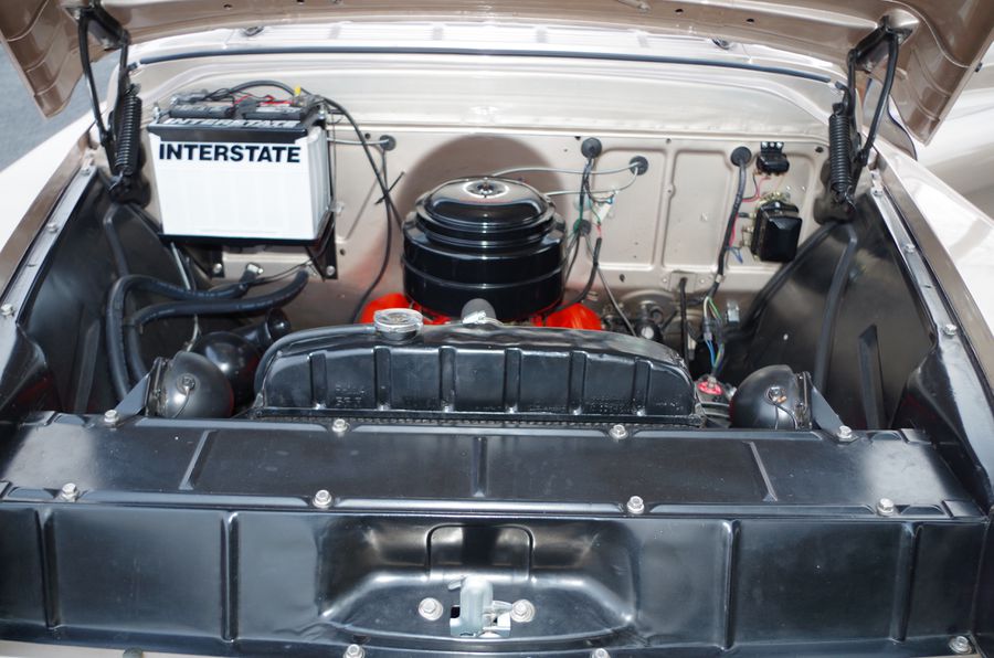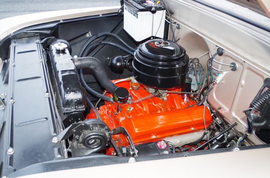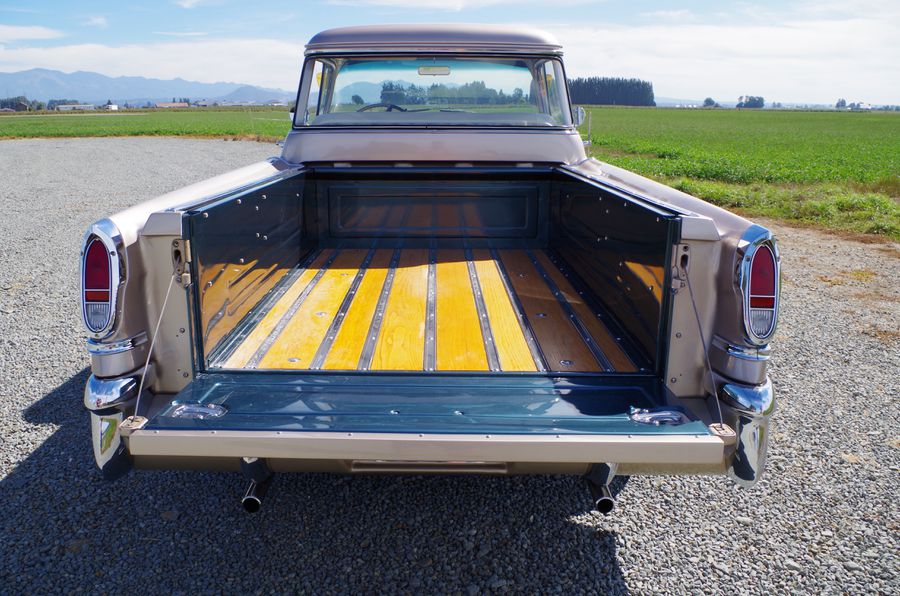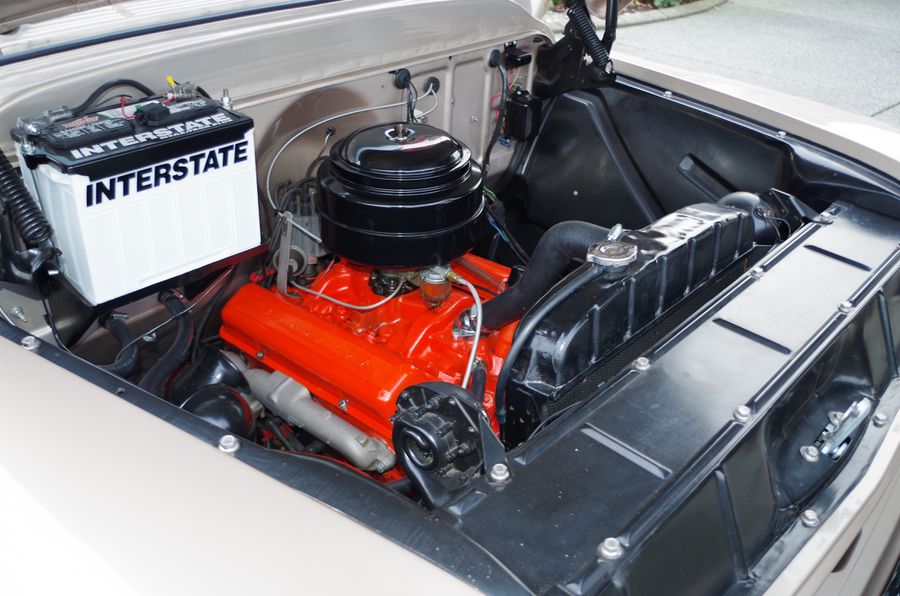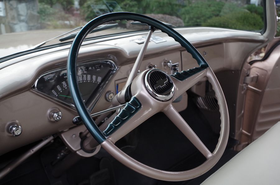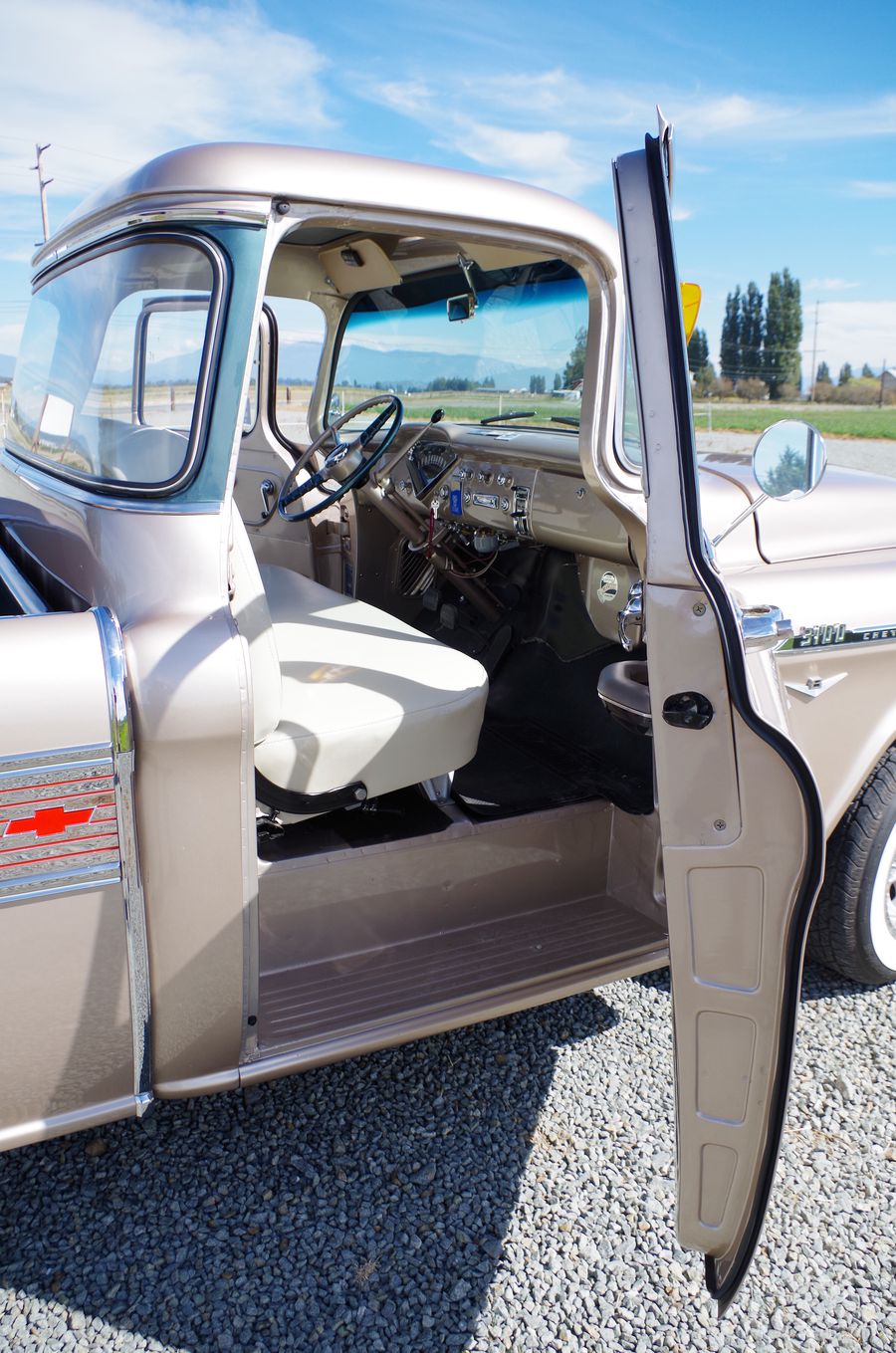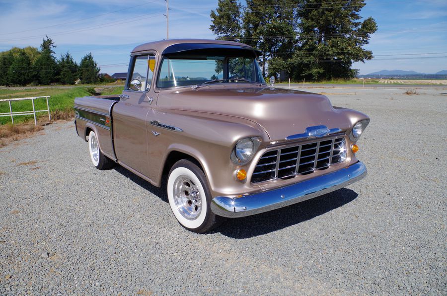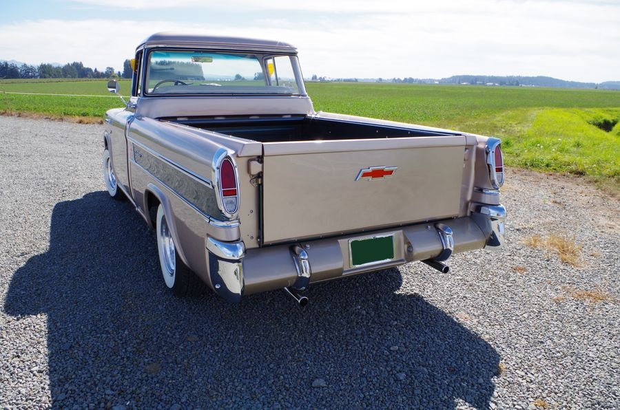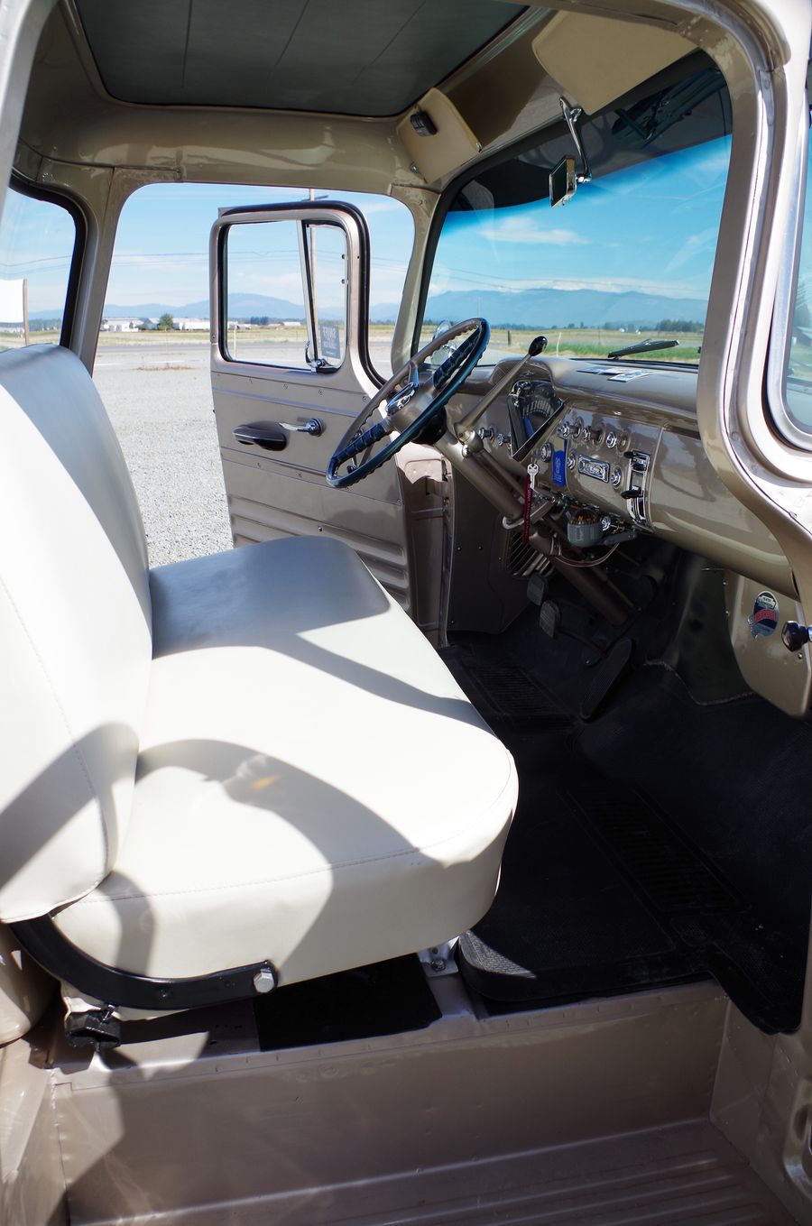 This has to be the nicest, most beautiful and well maintained 1956 Chevy Cameo in the state of Washington (and yes, that’s a ’57 bed). Powered by a fine running 283 sitting under the hood, a 3 speed on the column and dual exhaust that finish off the drive train package. New front disc brakes installed. Refurbed and repainted steering gear box installed. Rear main seal replaced. New B. F. Goodrich rubber and Ultra mags make up the stunning wheels. Paint and chrome really shine. Visor, posts and bed sport a beautiful deep green and offsets the sultry Frosted Mocha body. Standard issue interior for the 1950’s with beautiful white leather upholstery and vinyl floors.