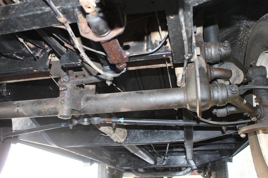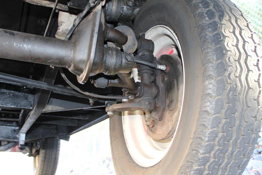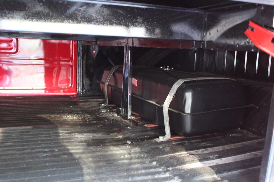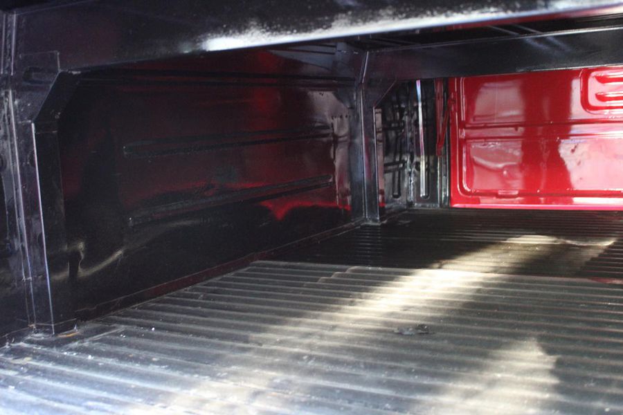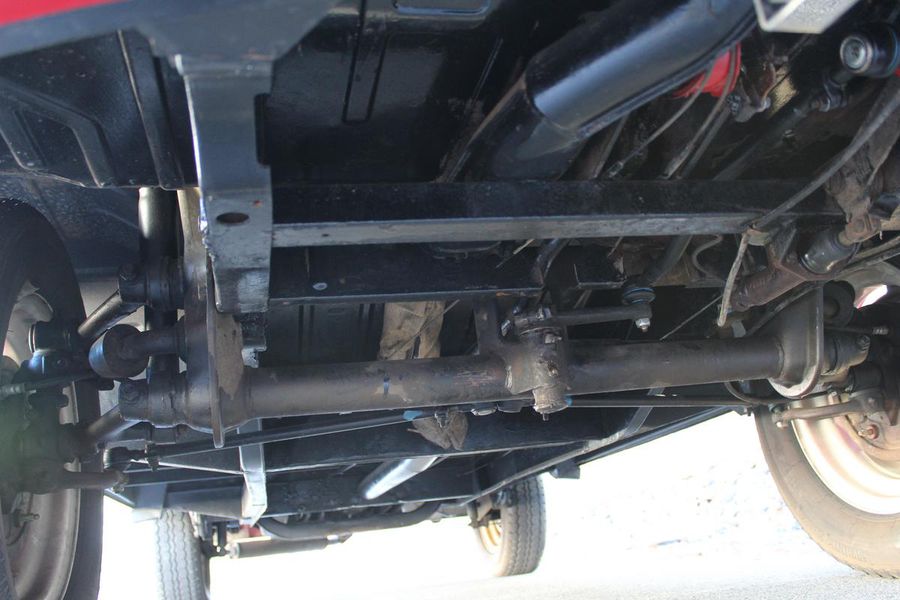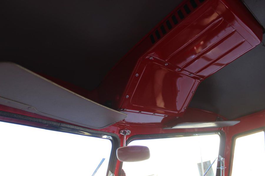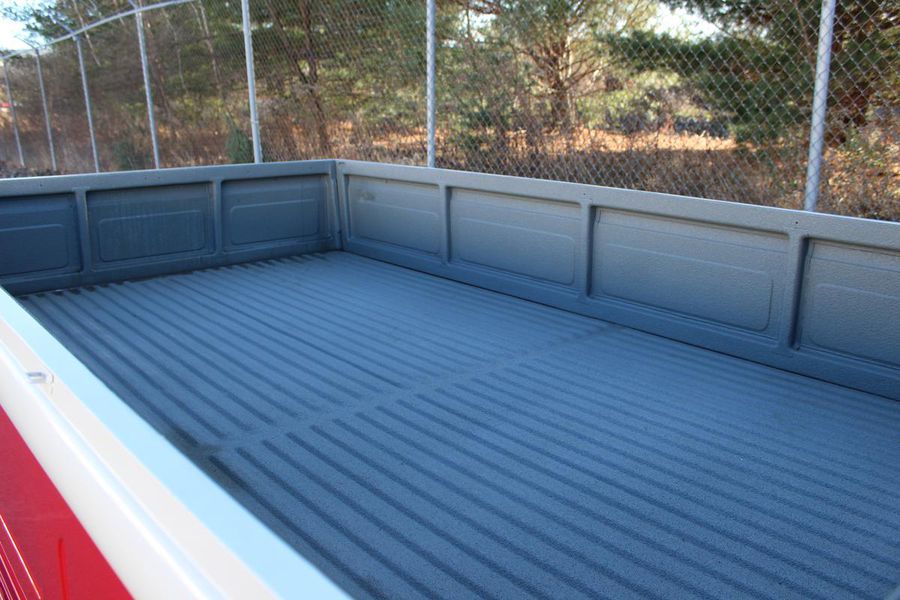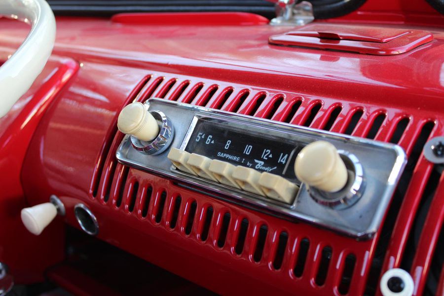 The interior of the cab is finished in red vinyl with complimentary white welting on the bench seat and a white steering wheel and gear shift knob. On the dash, a simple round gauge is the speedometer, and a working AM radio is to its right. Seat belts are included.