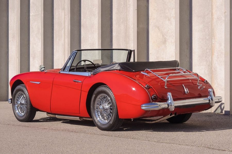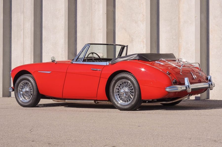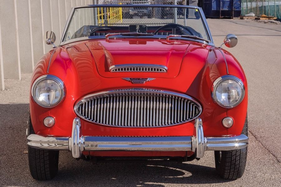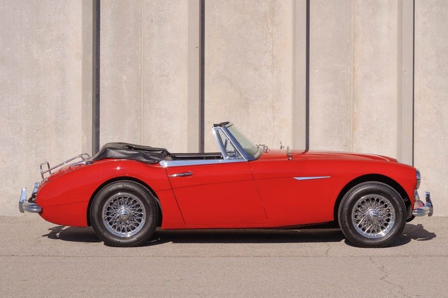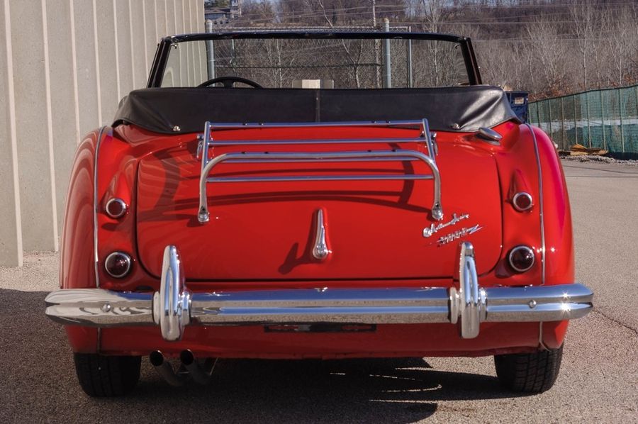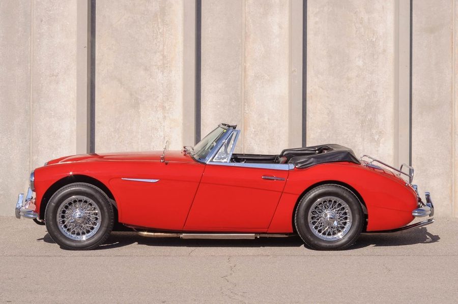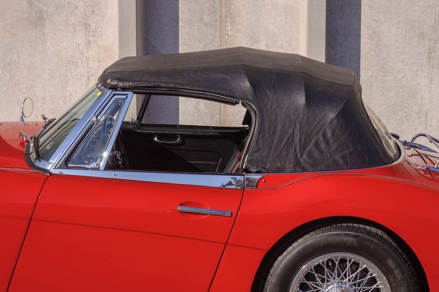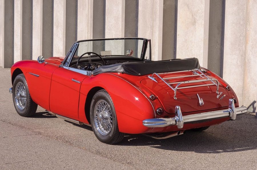 1963 Austin-Healey 3000 Mark II BJ7 2+2 Roadster. Older professional restoration that still shows beautifully today!. 1963 was the first year for curved windshields and roll-up side glass. One of only 6,113 BJ7 2+2s made in 1963. Left-hand drive. Signal Red exterior over black leather interior and black folding soft-top. 2.9L inline OHV six-cylinder engine with twin SU HS6 carburetors and 3.91 gearing. Four-speed manual transmission with optional overdrive. Aluminum radiator and stainless-steel exhausts. Newer battery and recent serviced. 60-spoke wire wheels and rear luggage rack Despite Chevrolet’s new Corvette in 1963. Dressed in Signal Red, the car’s paint and trim are all in overall excellent condition. The body is straight, the engine bay is extremely tidy and the cargo area is in very good order and include a spare tire and extra wire wheel. The chrome, wraparound bumpers look great and fit tightly to the body. The car has a new battery and was recently serviced. There’s a rear-mounted luggage rack for extra storage on those three-day weekend getaways or day trips. This roadster rolls on Nexen radials, size 165/80R15 at every corner and every tire is mounted to a 60-spoke wire wheel. The wheels are in excellent order while the tires are in very good condition. Under the hood is a 2.9L OHV six-cylinder engine with twin SU HS6 carburetors. The motor is linked to a four-speed manual transmission with overdrive for third and fourth gears and 3.91:1 rear end. There’s also an aluminum radiator to keep it running cool and stainless-steel exhausts for great sound and durability. The car has a newer battery and underwent a recent service. Inside, there are black leather seats with red piping that are in great shape. The complementing black carpet is in similar shape. A three-spoke steering wheel faces the driver while the inner door panels and instrument panel are in very good order. The floor-mounted shift lever has an oaken shift knob and completes the interior.