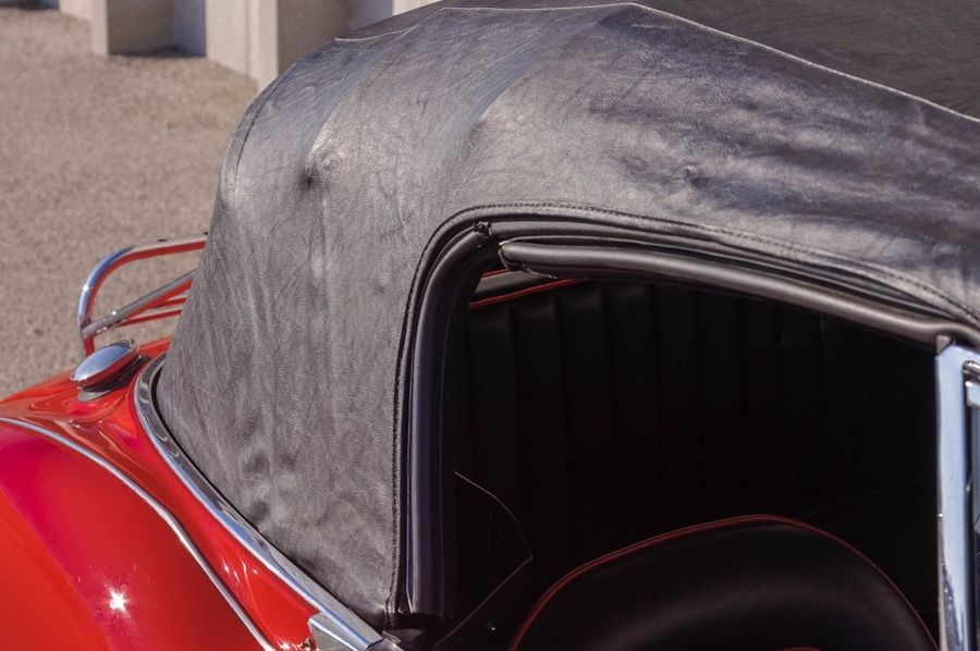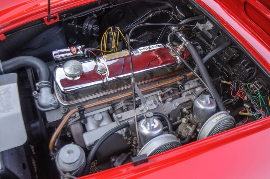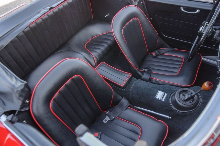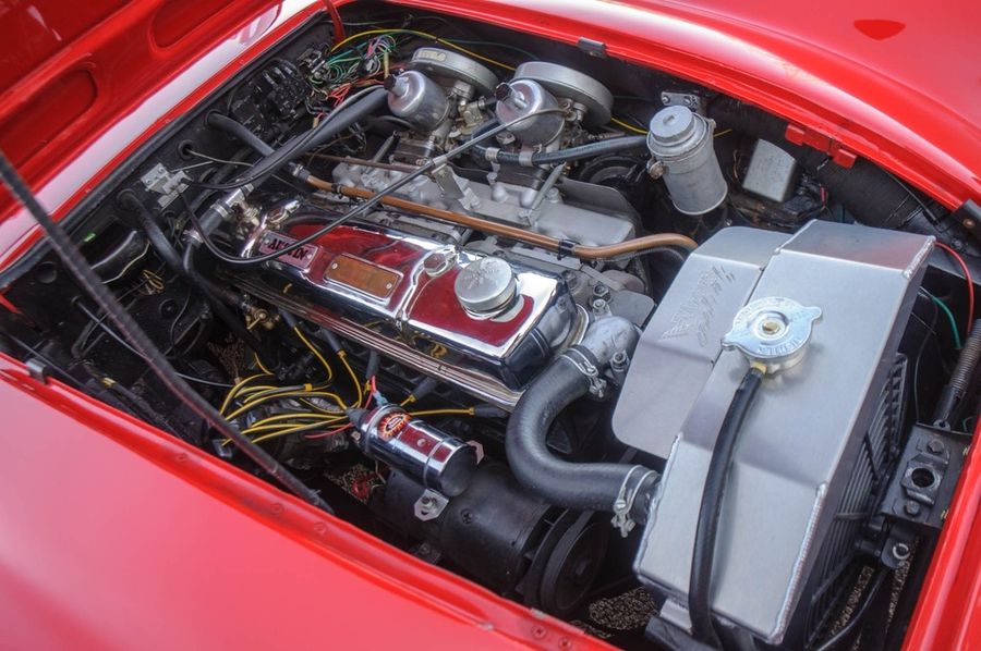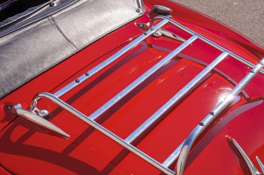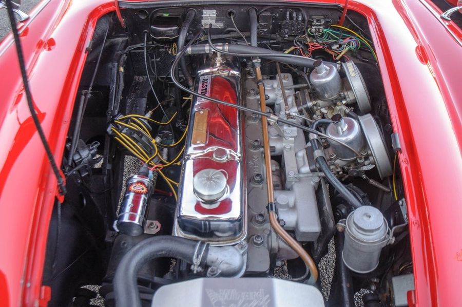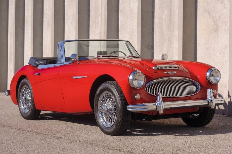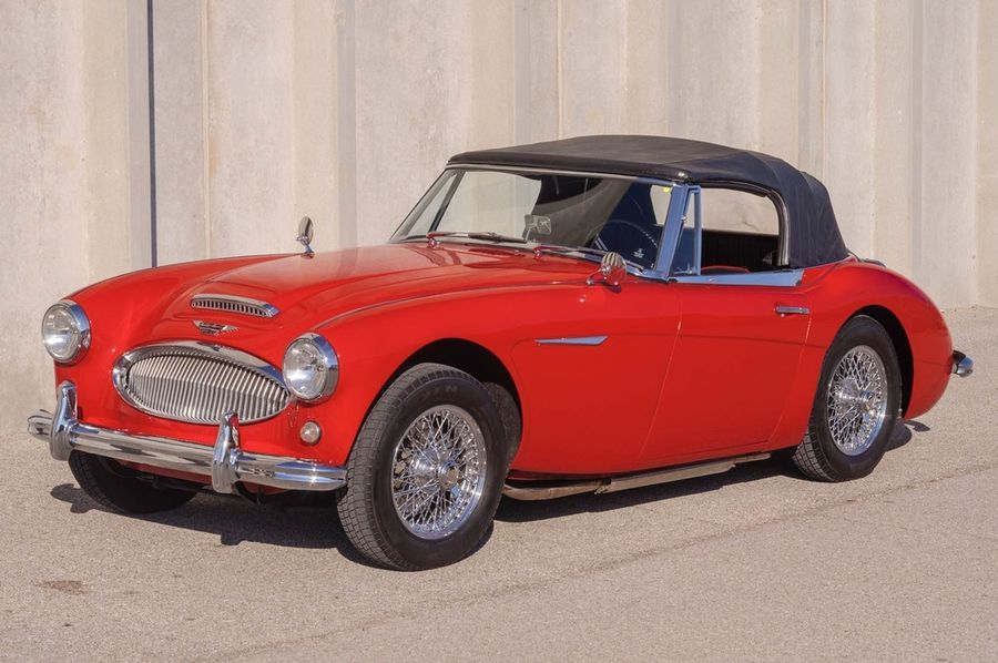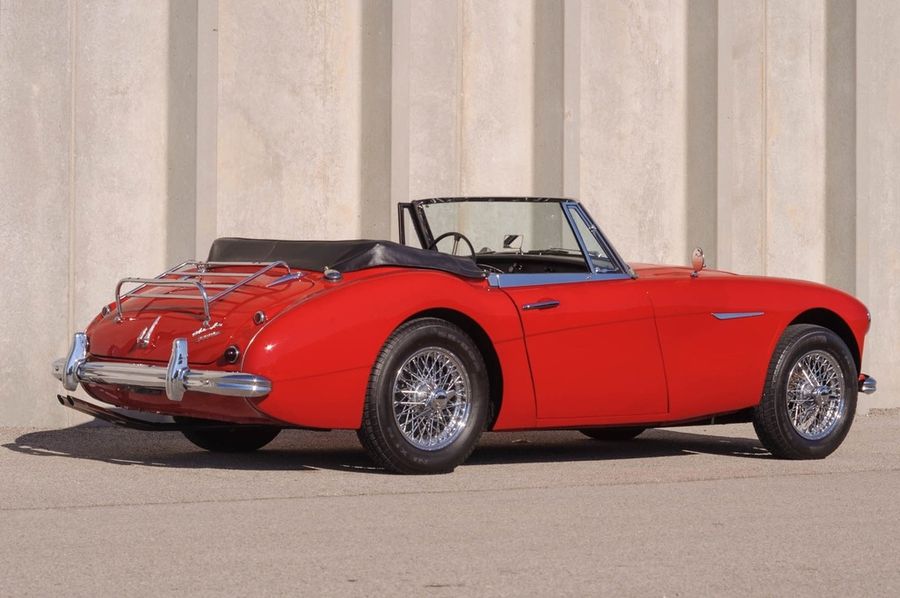 1963 Austin-Healey 3000 Mark II BJ7 2+2 Roadster. Older professional restoration that still shows beautifully today!. 1963 was the first year for curved windshields and roll-up side glass. One of only 6,113 BJ7 2+2s made in 1963. Left-hand drive. Signal Red exterior over black leather interior and black folding soft-top. 2.9L inline OHV six-cylinder engine with twin SU HS6 carburetors and 3.91 gearing. Four-speed manual transmission with optional overdrive. Aluminum radiator and stainless-steel exhausts. Newer battery and recent serviced. 60-spoke wire wheels and rear luggage rack Despite Chevrolet’s new Corvette in 1963. Dressed in Signal Red, the car’s paint and trim are all in overall excellent condition. The body is straight, the engine bay is extremely tidy and the cargo area is in very good order and include a spare tire and extra wire wheel. The chrome, wraparound bumpers look great and fit tightly to the body. The car has a new battery and was recently serviced. There’s a rear-mounted luggage rack for extra storage on those three-day weekend getaways or day trips. This roadster rolls on Nexen radials, size 165/80R15 at every corner and every tire is mounted to a 60-spoke wire wheel. The wheels are in excellent order while the tires are in very good condition. Under the hood is a 2.9L OHV six-cylinder engine with twin SU HS6 carburetors. The motor is linked to a four-speed manual transmission with overdrive for third and fourth gears and 3.91:1 rear end. There’s also an aluminum radiator to keep it running cool and stainless-steel exhausts for great sound and durability. The car has a newer battery and underwent a recent service. Inside, there are black leather seats with red piping that are in great shape. The complementing black carpet is in similar shape. A three-spoke steering wheel faces the driver while the inner door panels and instrument panel are in very good order. The floor-mounted shift lever has an oaken shift knob and completes the interior.