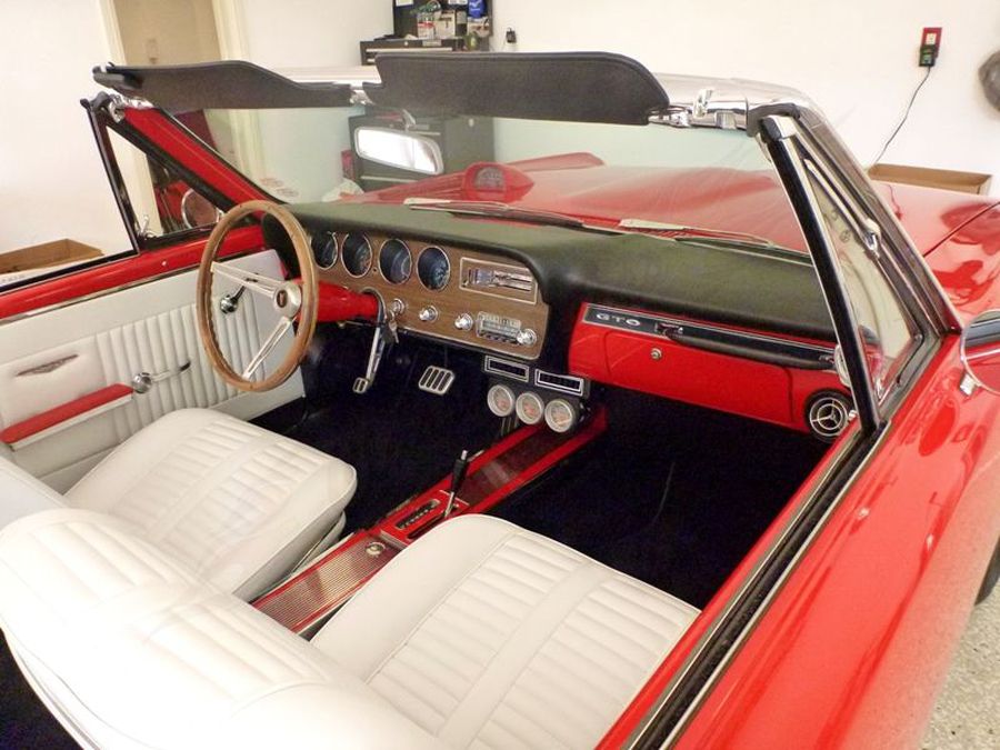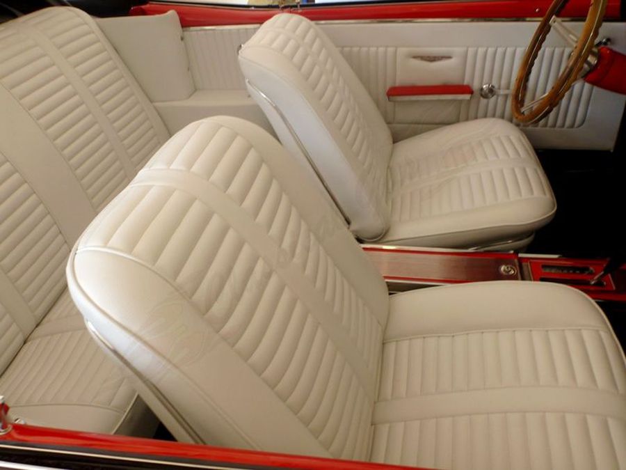 The White interior on the car is in excellent shape and was entirely redone 3 years ago by Keith Kirk Interiors. The upholstery work, carpet, door panels, and dash all look great. It has dual bucket seats with a Red center console and nice polished trim. It has a custom shifter plate to house the automatic shifter which moves through the gears smoothly. Just above where the center console runs under the dash is an Auxiliary gauge cluster that houses Autometer Pro Comp Ultralight gauges for Volt/Water Temp/Oil Pressure. The rest of the dash features the original style gauges inset into the original style Woodgrain trim. The Classic AC/Heat system utilizes the factory AC ducts which are adjustable. Other nice features include the Woodgrain wheel, AM/FM stereo, and the Lokar pedals. The trunk of the car is all nicely upholstered as well in White with Black carpet.
