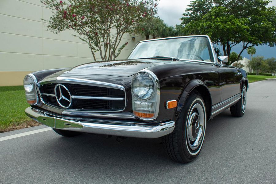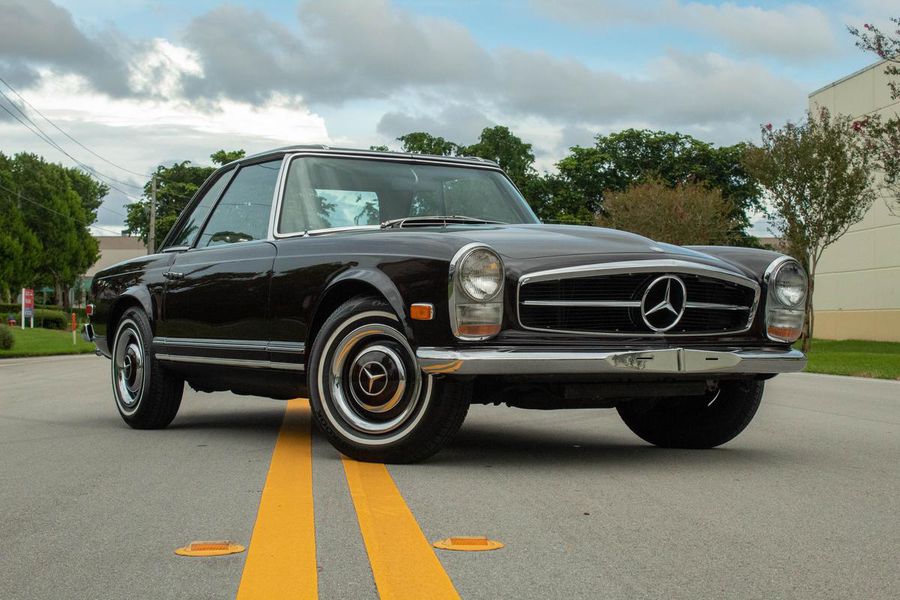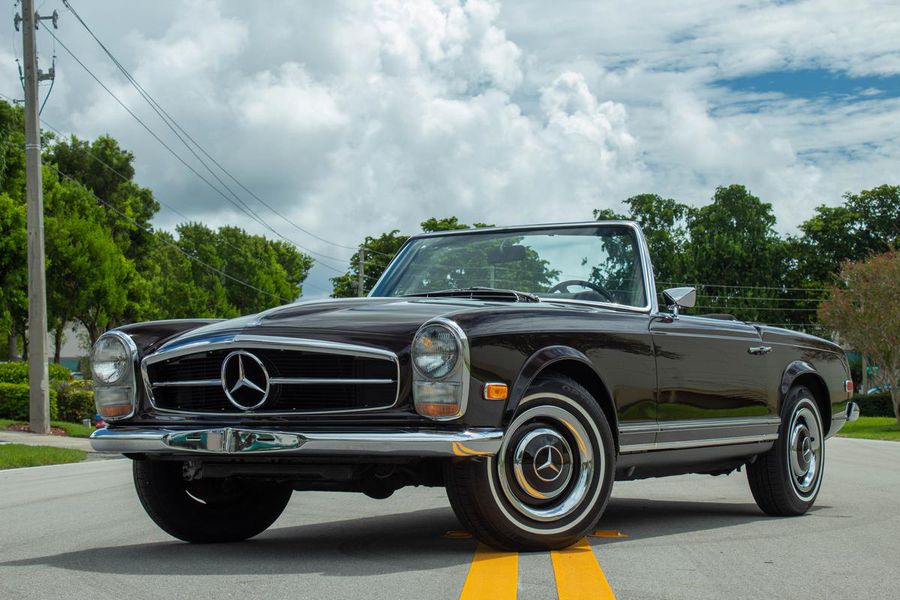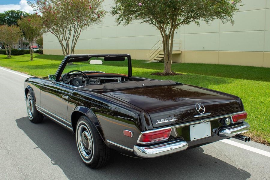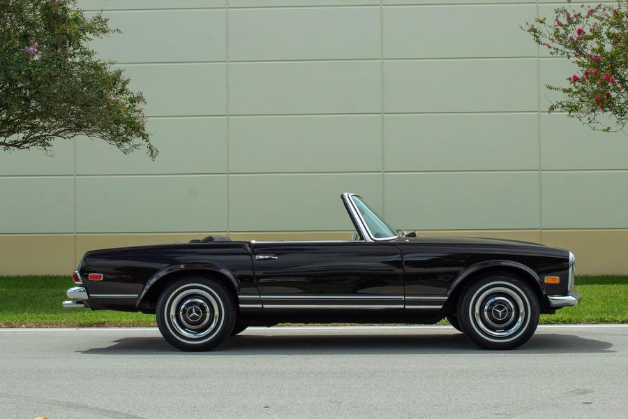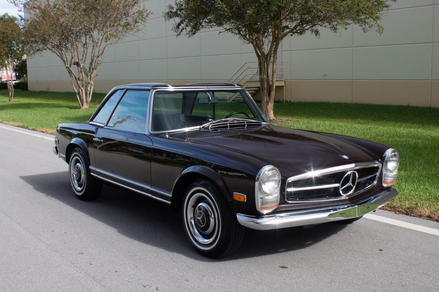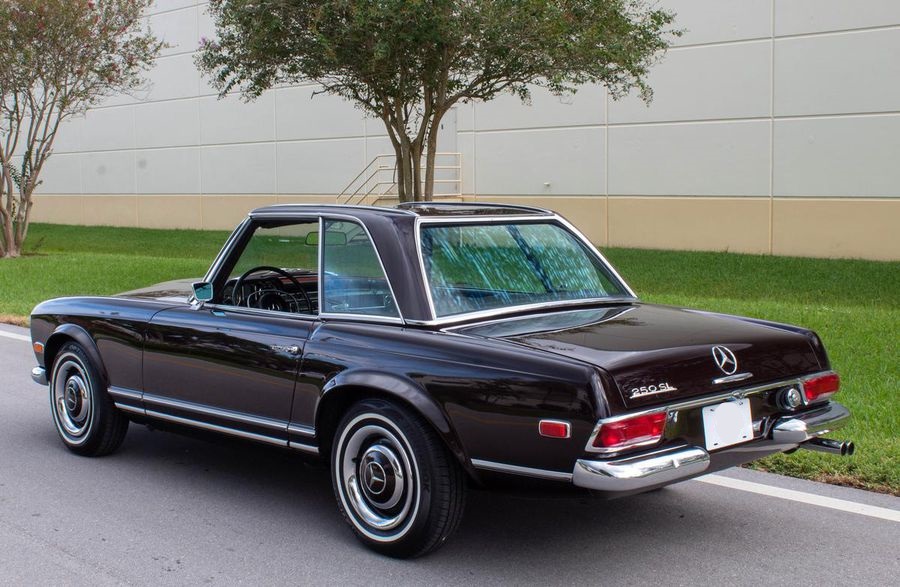 1968 Mercedes-Benz 250sl California Coupe in 450G “Dark Maroon” with Dark Brown leather interior. 64501 original miles based on its history. The paint shows wonderfully well with excellent integrity. Interior was completely redone less than a year ago with new loop carpeting, leather upholstery and new wood trim. New seatbelts and sun visors were added in June of this year. The car comes with new Coco mats and a second pair of plush carpets, also new. Tool kit is complete and still has original spare tire. Engine bay has been kept original with all the components working as they should. Current on all services and maintenance including new brakes and tires. Engine is strong with excellent compression. Transmission shifts smoothly up and down, including last down shift that is rough on most pagodas if they have the venturi out of adjustment. Zero rust and no previous bodywork with all original weld points and bodystyle markings. Car comes with original books.