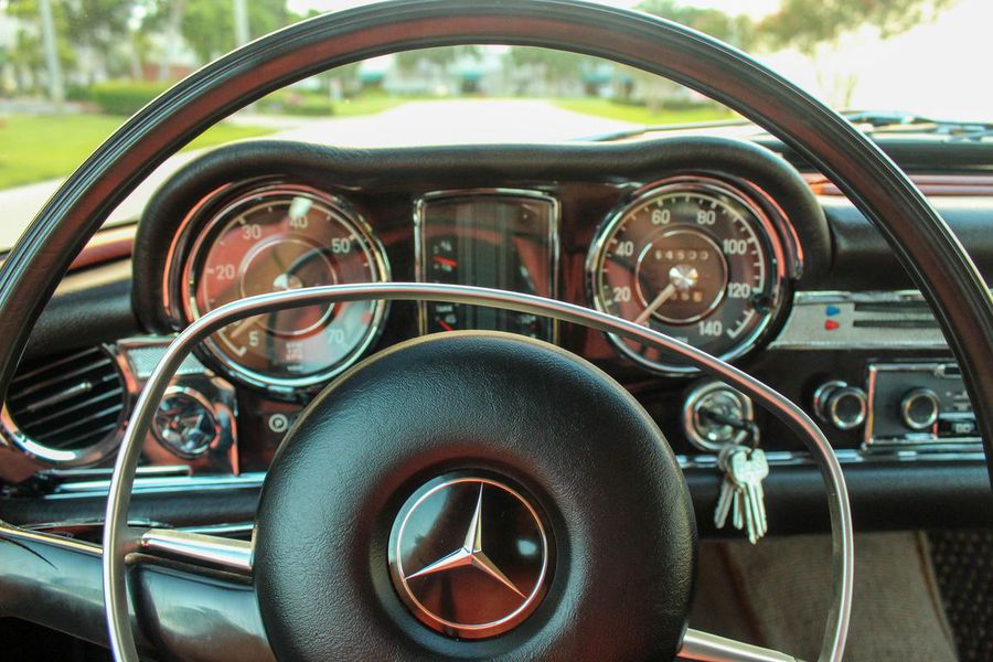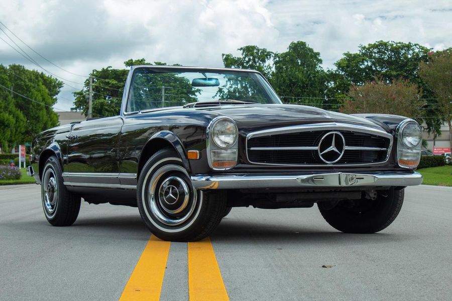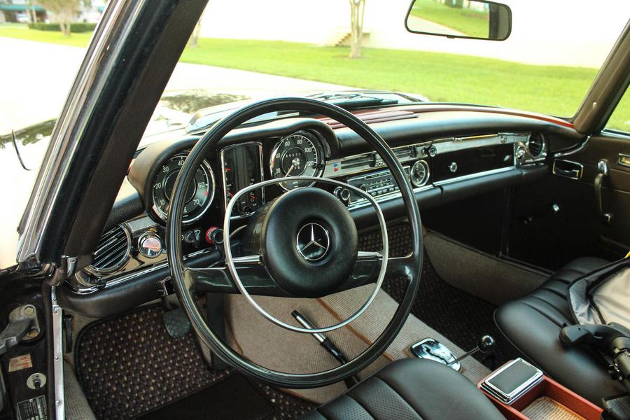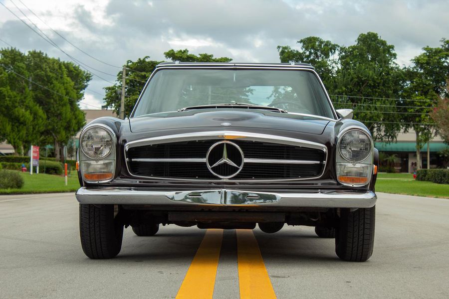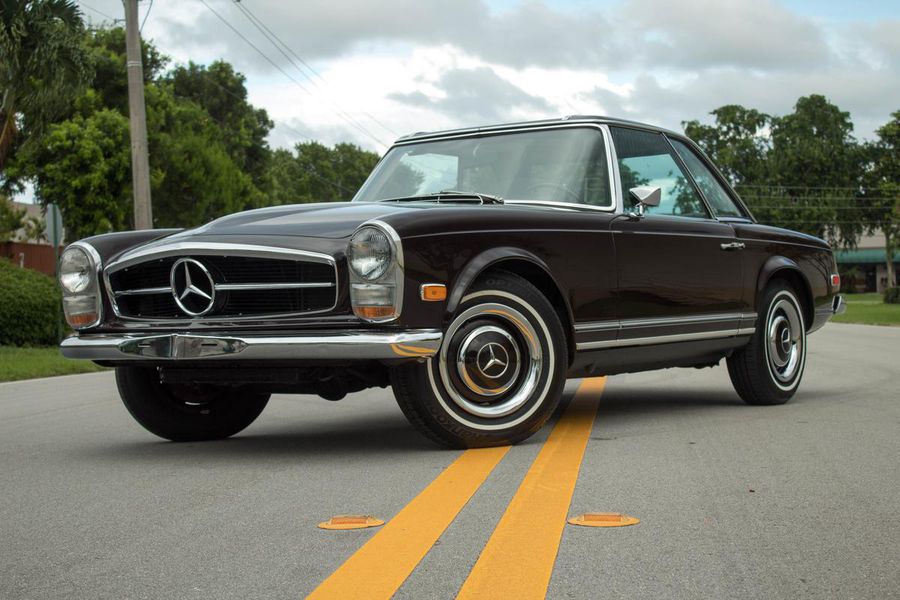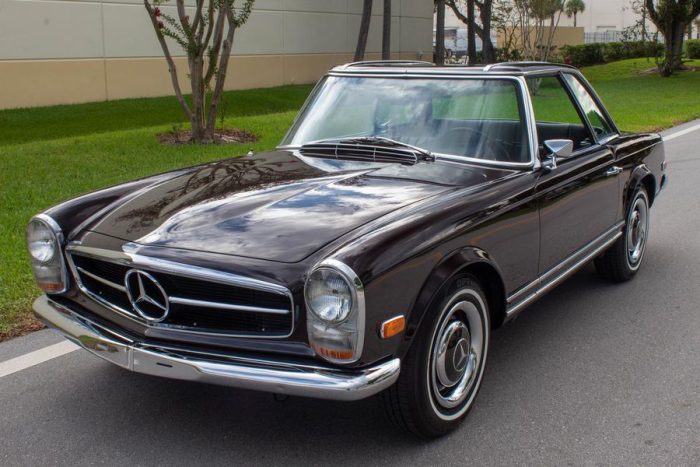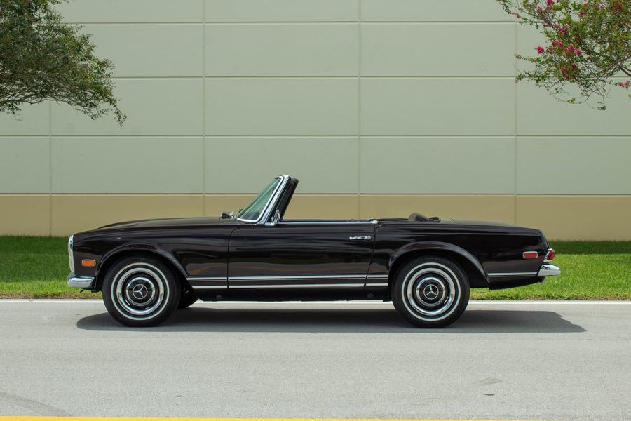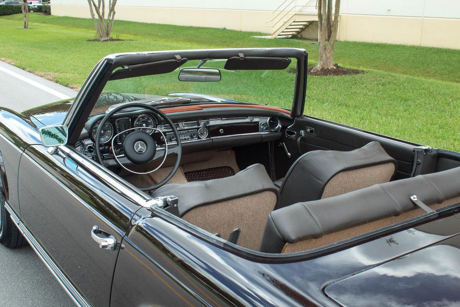 1968 Mercedes-Benz 250sl California Coupe in 450G “Dark Maroon” with Dark Brown leather interior. 64501 original miles based on its history. The paint shows wonderfully well with excellent integrity. Interior was completely redone less than a year ago with new loop carpeting, leather upholstery and new wood trim. New seatbelts and sun visors were added in June of this year. The car comes with new Coco mats and a second pair of plush carpets, also new. Tool kit is complete and still has original spare tire. Engine bay has been kept original with all the components working as they should. Current on all services and maintenance including new brakes and tires. Engine is strong with excellent compression. Transmission shifts smoothly up and down, including last down shift that is rough on most pagodas if they have the venturi out of adjustment. Zero rust and no previous bodywork with all original weld points and bodystyle markings. Car comes with original books.