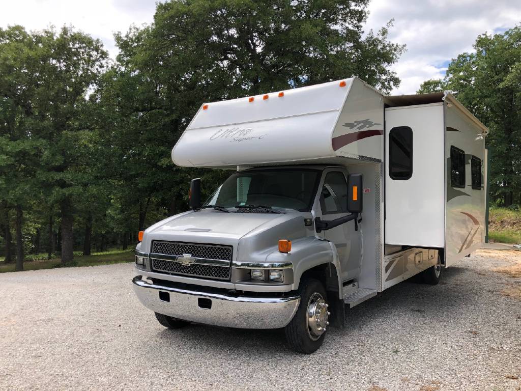 This Ultra Super C motorhome, by Gulf Stream, is in excellent condition and has a single super slide, queen bed in the rear with a wardrobe, custom dual leather recliners across from the swivel chair. Next to that is a 4 seat dinette. The overhead bunk area has a queen size sleep by number bed. The kitchen offers a stove, microwave with convection, refrigerator, and plenty of storage!
