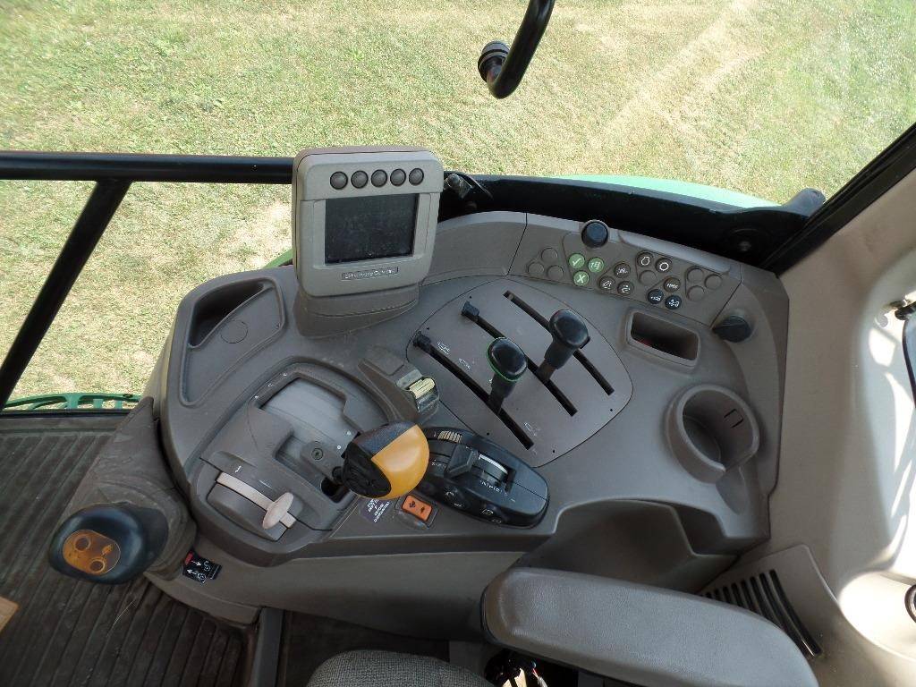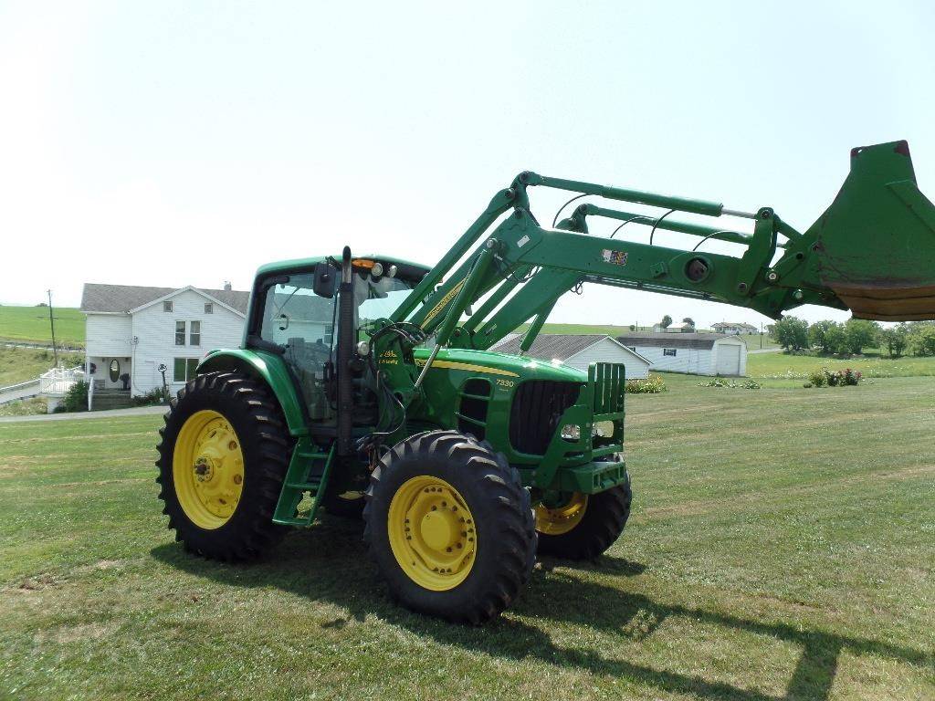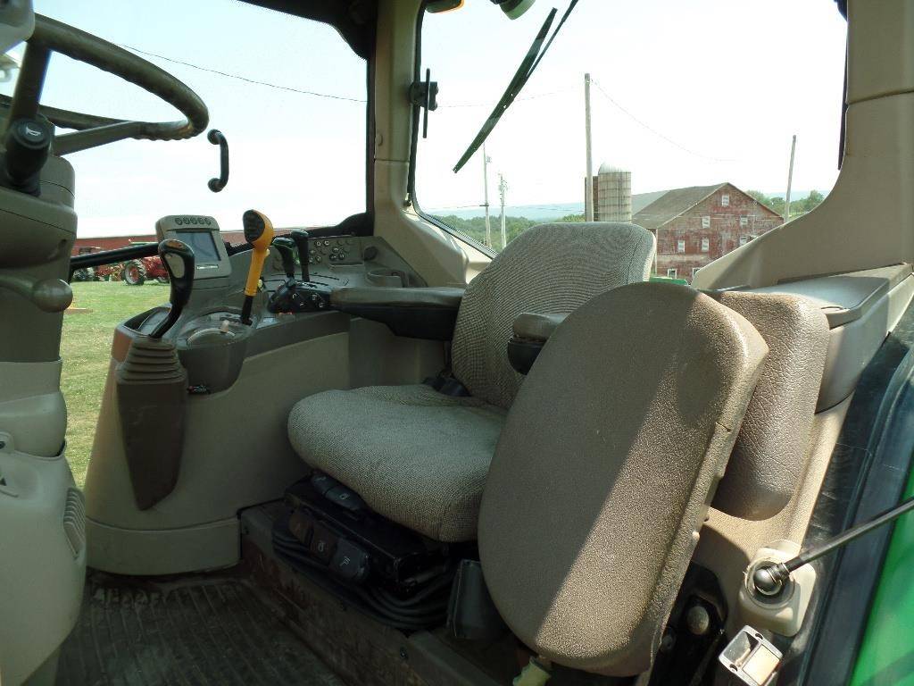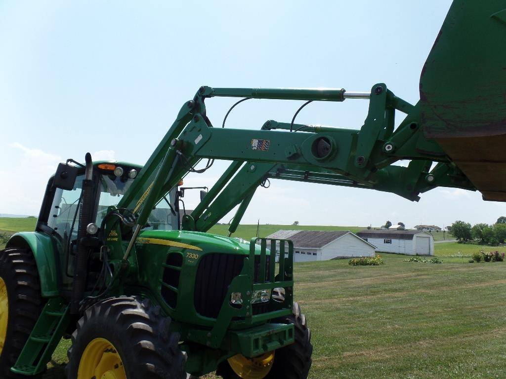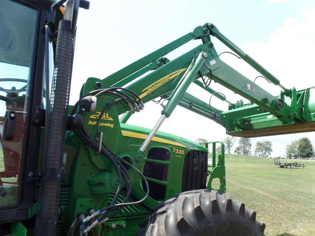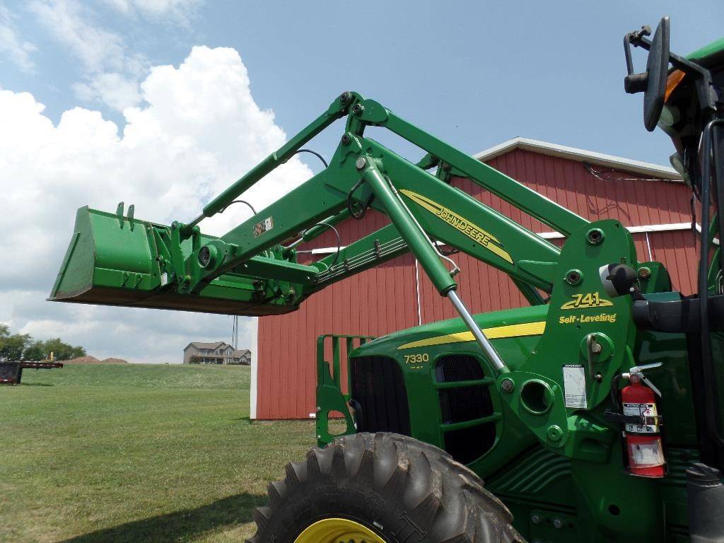 2008 John Deere 7330 Premium. 2,744 hours. Cab with ac and heat, 20 speed auto-quad ,john deere 741 self leveling loader, 7′ bucket with john deere quick attach, rack and pinion bar axle with cast centers, corner exhaust, rear wiper, mirrors, rear work lights, grill guard, fender mounted 3pt hitch controls, extendable 3pt hitch arms, front weight bracket, fire extinguisher, belt line lights, buddy seat, radio, sun visor 450 lbs rear wheel weights, panorama doors.