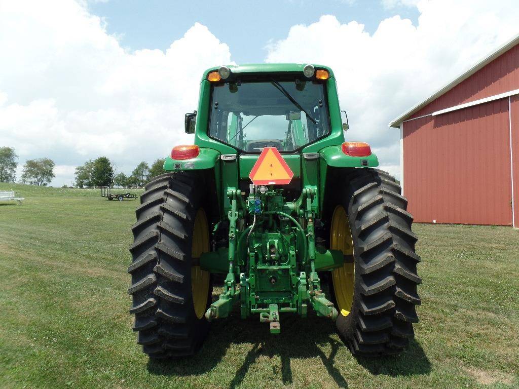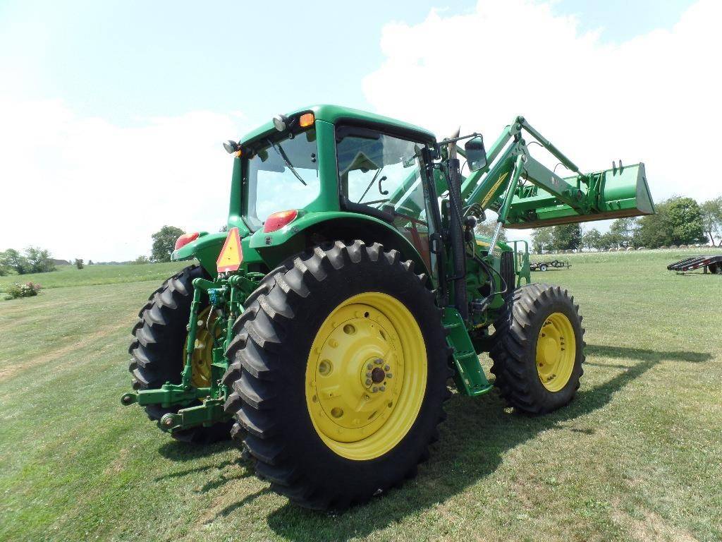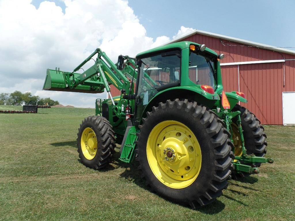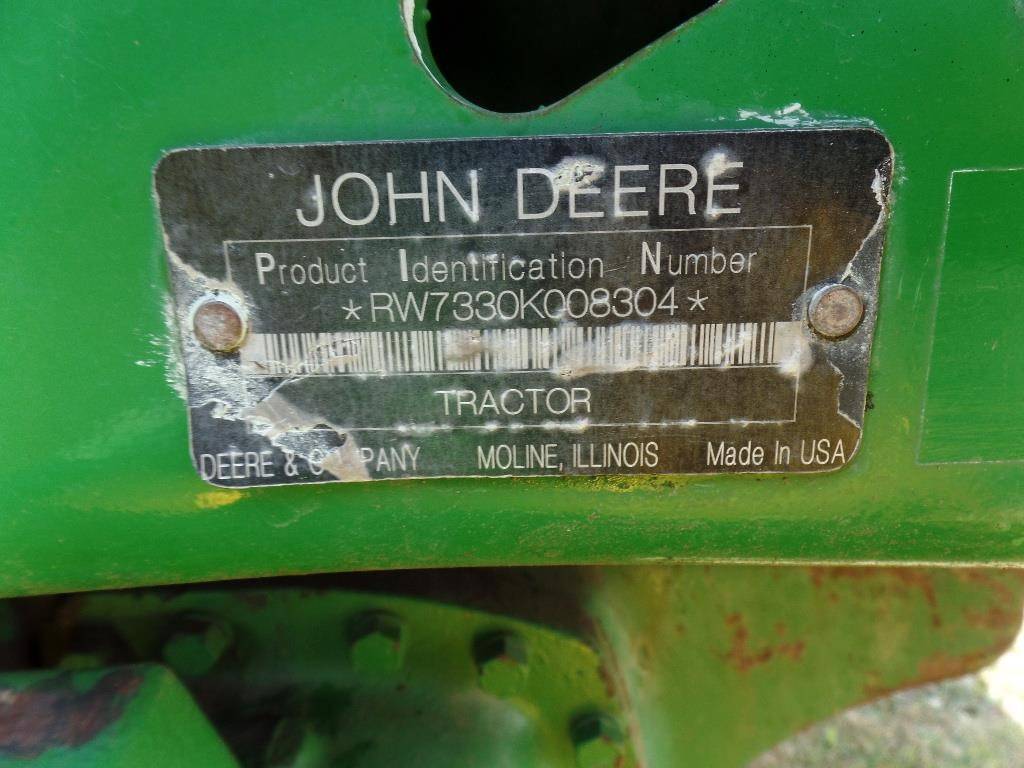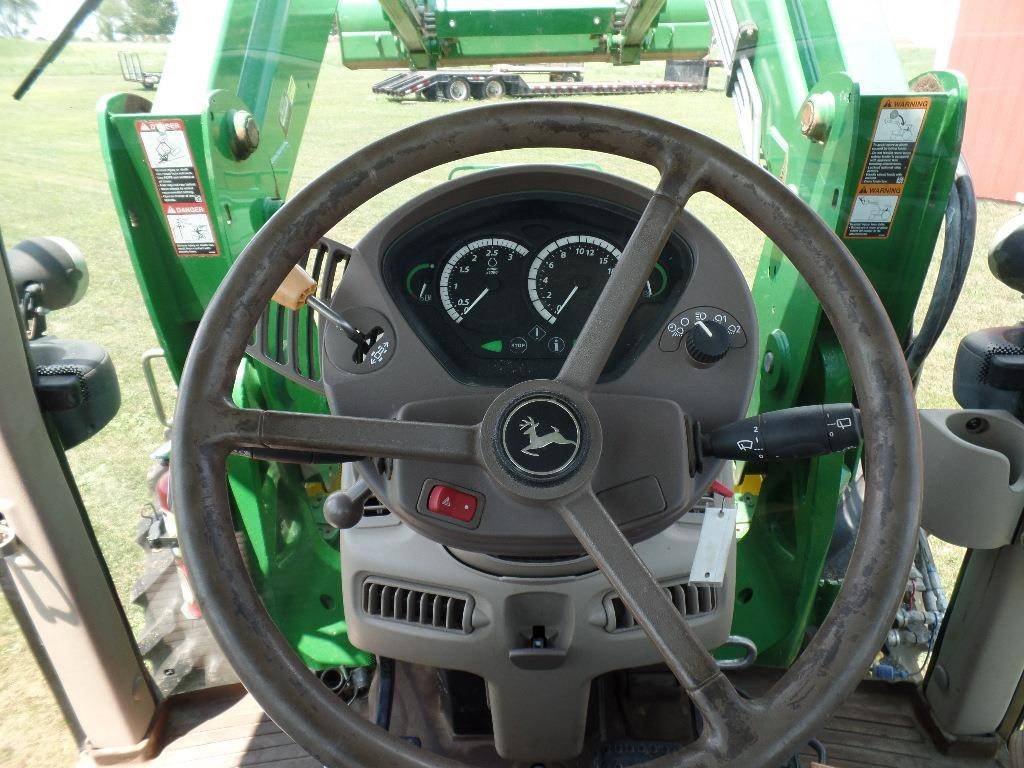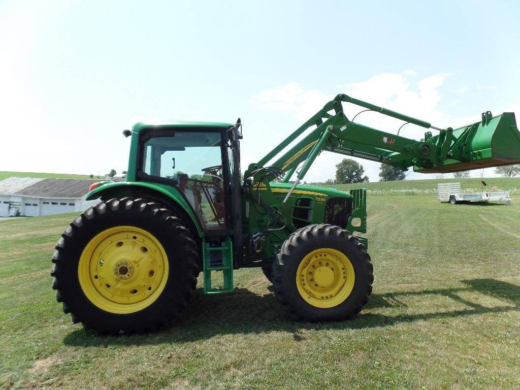 2008 John Deere 7330 Premium. 2,744 hours. Cab with ac and heat, 20 speed auto-quad ,john deere 741 self leveling loader, 7′ bucket with john deere quick attach, rack and pinion bar axle with cast centers, corner exhaust, rear wiper, mirrors, rear work lights, grill guard, fender mounted 3pt hitch controls, extendable 3pt hitch arms, front weight bracket, fire extinguisher, belt line lights, buddy seat, radio, sun visor 450 lbs rear wheel weights, panorama doors.