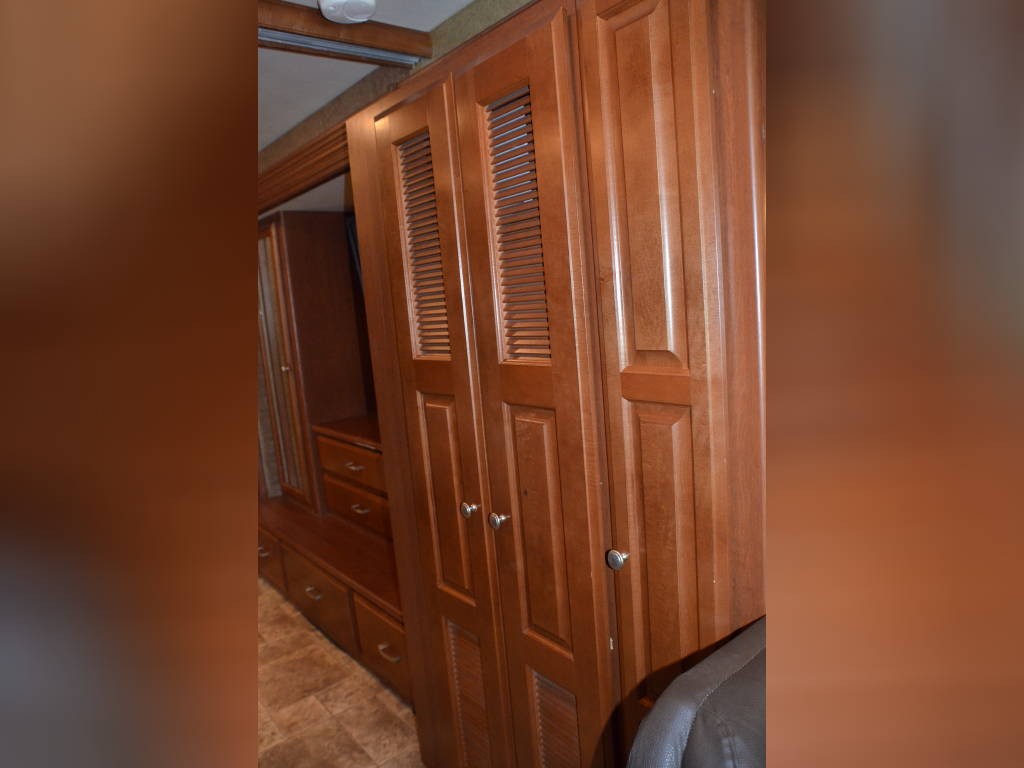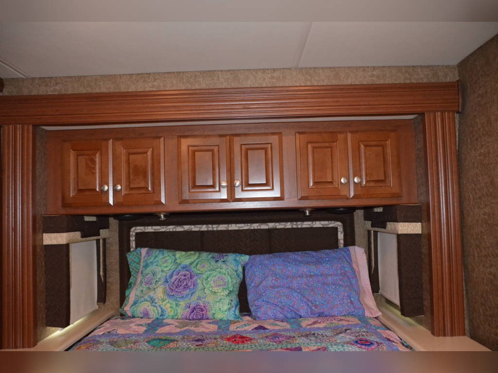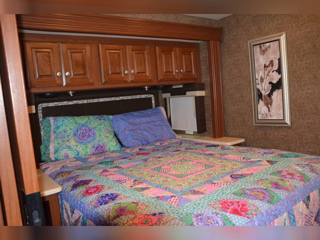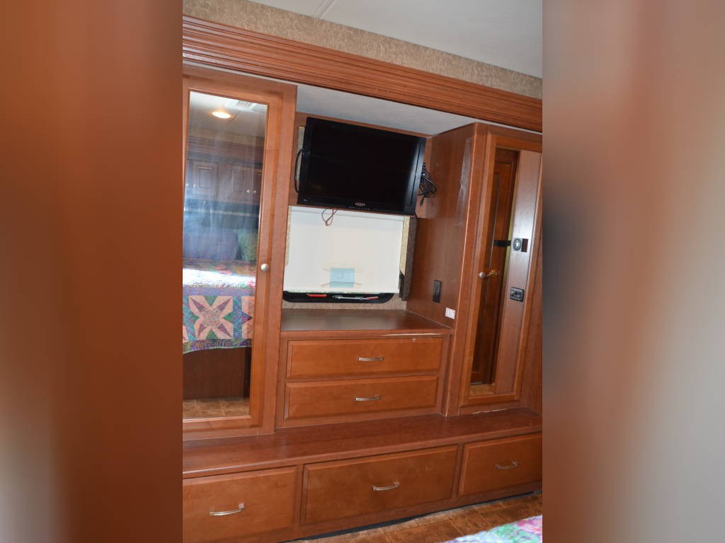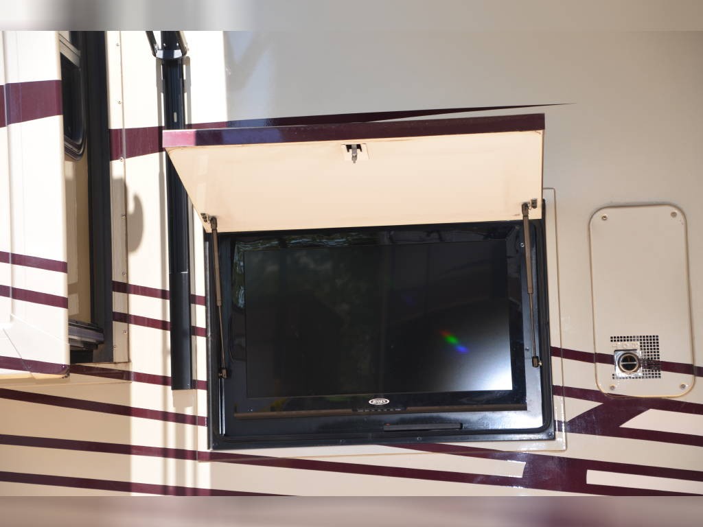 Beautiful inside and out! Very well taken care of! Tons of storage inside and out! 3 tv’s (one outside); 3-burner gas stove; large double sink with residential faucet; 1/2 bath close to the front so you don’t have to climb over a bed to get there while traveling; washer and dryer; fold out computer table on rider’s side; all new upholstery on both captain’s chairs, couch and dining couches; dining cushions lift up to reveal two large storage areas; custom mattress for child bed; drop down queen bed over the two captain’s chairs; large residential refrigerator; microwave / convection oven; wonderfully comfortable bamboo mattress on queen bed (pillows and spread in pictures not included); two large closets in the bedroom, as well as storage under the bed, over the bed and along the wall opposite the bed. always in covered storage; new a/c and heat; shower head outside for those beach vacations; tv satellite; lots of electric plugs for all your devices; back up camera; back camera to always have your tow vehicle in your sight; Blue Ox trailer hitch; new tires.