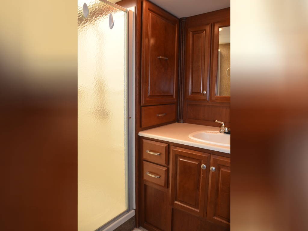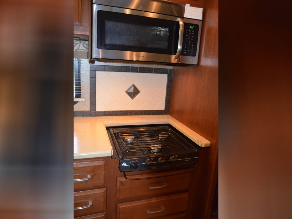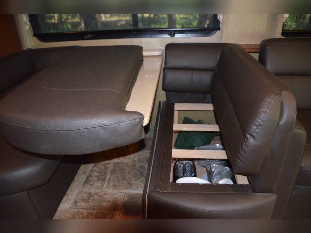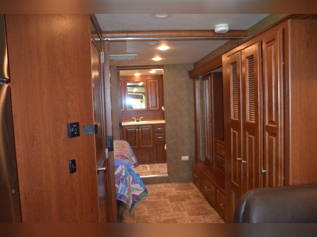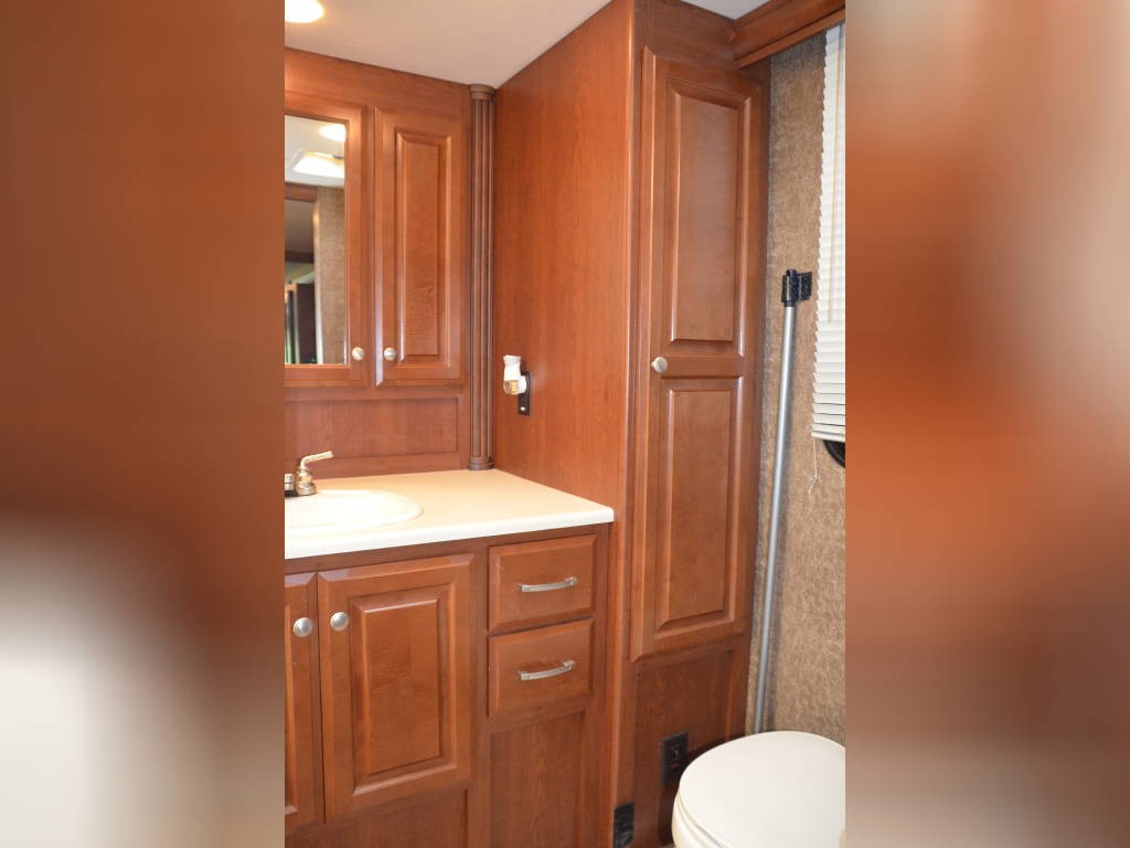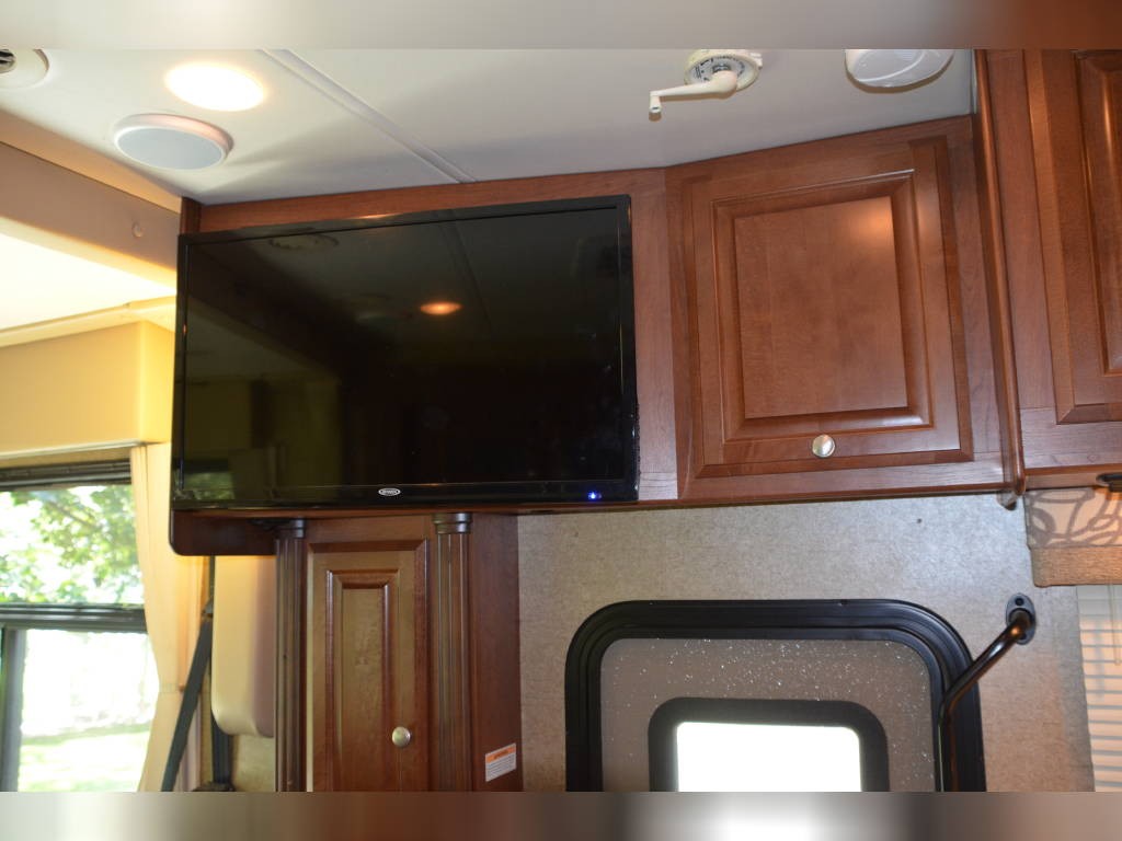 Beautiful inside and out! Very well taken care of! Tons of storage inside and out! 3 tv’s (one outside); 3-burner gas stove; large double sink with residential faucet; 1/2 bath close to the front so you don’t have to climb over a bed to get there while traveling; washer and dryer; fold out computer table on rider’s side; all new upholstery on both captain’s chairs, couch and dining couches; dining cushions lift up to reveal two large storage areas; custom mattress for child bed; drop down queen bed over the two captain’s chairs; large residential refrigerator; microwave / convection oven; wonderfully comfortable bamboo mattress on queen bed (pillows and spread in pictures not included); two large closets in the bedroom, as well as storage under the bed, over the bed and along the wall opposite the bed. always in covered storage; new a/c and heat; shower head outside for those beach vacations; tv satellite; lots of electric plugs for all your devices; back up camera; back camera to always have your tow vehicle in your sight; Blue Ox trailer hitch; new tires.