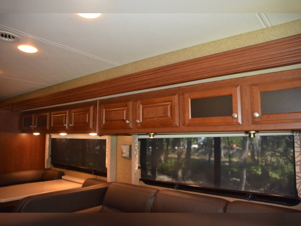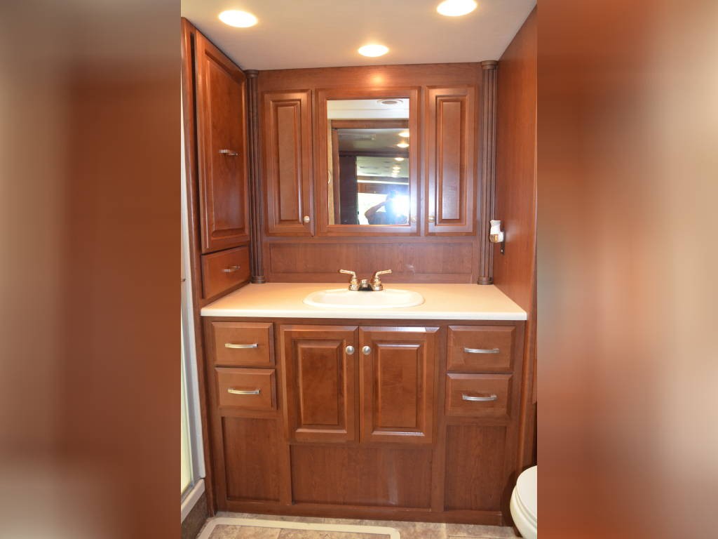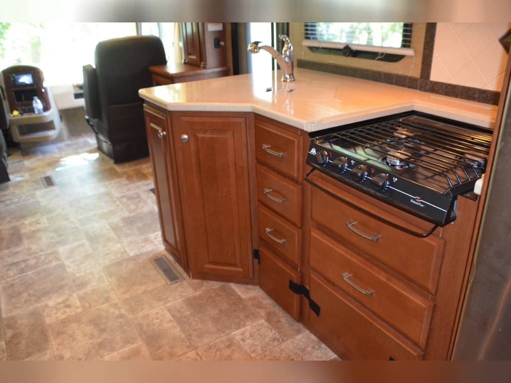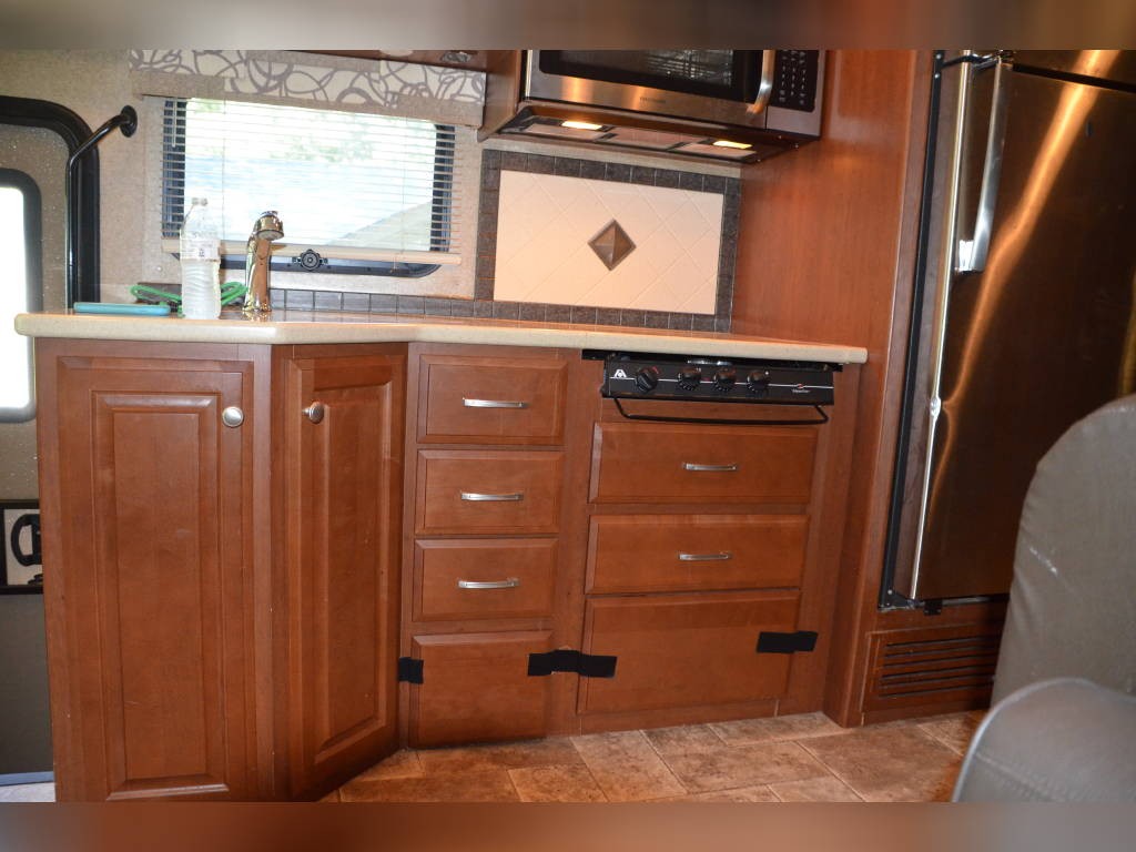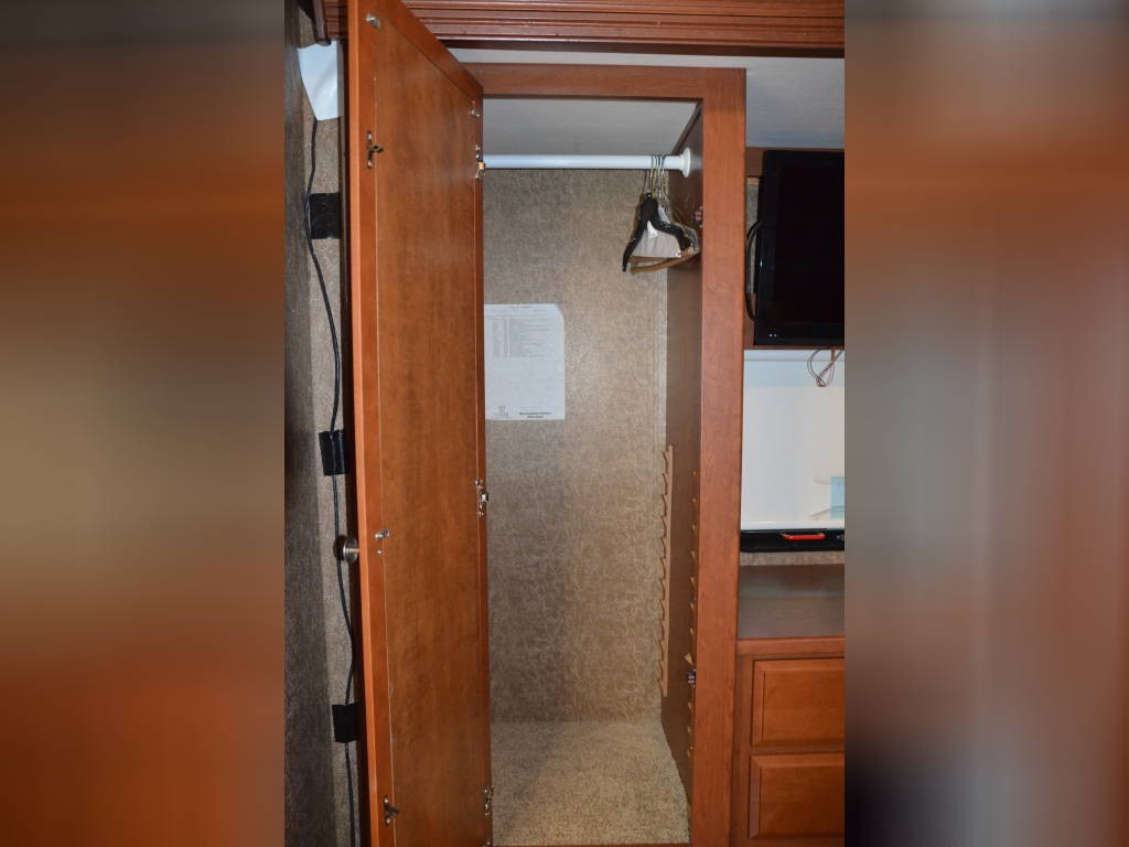 Beautiful inside and out! Very well taken care of! Tons of storage inside and out! 3 tv’s (one outside); 3-burner gas stove; large double sink with residential faucet; 1/2 bath close to the front so you don’t have to climb over a bed to get there while traveling; washer and dryer; fold out computer table on rider’s side; all new upholstery on both captain’s chairs, couch and dining couches; dining cushions lift up to reveal two large storage areas; custom mattress for child bed; drop down queen bed over the two captain’s chairs; large residential refrigerator; microwave / convection oven; wonderfully comfortable bamboo mattress on queen bed (pillows and spread in pictures not included); two large closets in the bedroom, as well as storage under the bed, over the bed and along the wall opposite the bed. always in covered storage; new a/c and heat; shower head outside for those beach vacations; tv satellite; lots of electric plugs for all your devices; back up camera; back camera to always have your tow vehicle in your sight; Blue Ox trailer hitch; new tires.