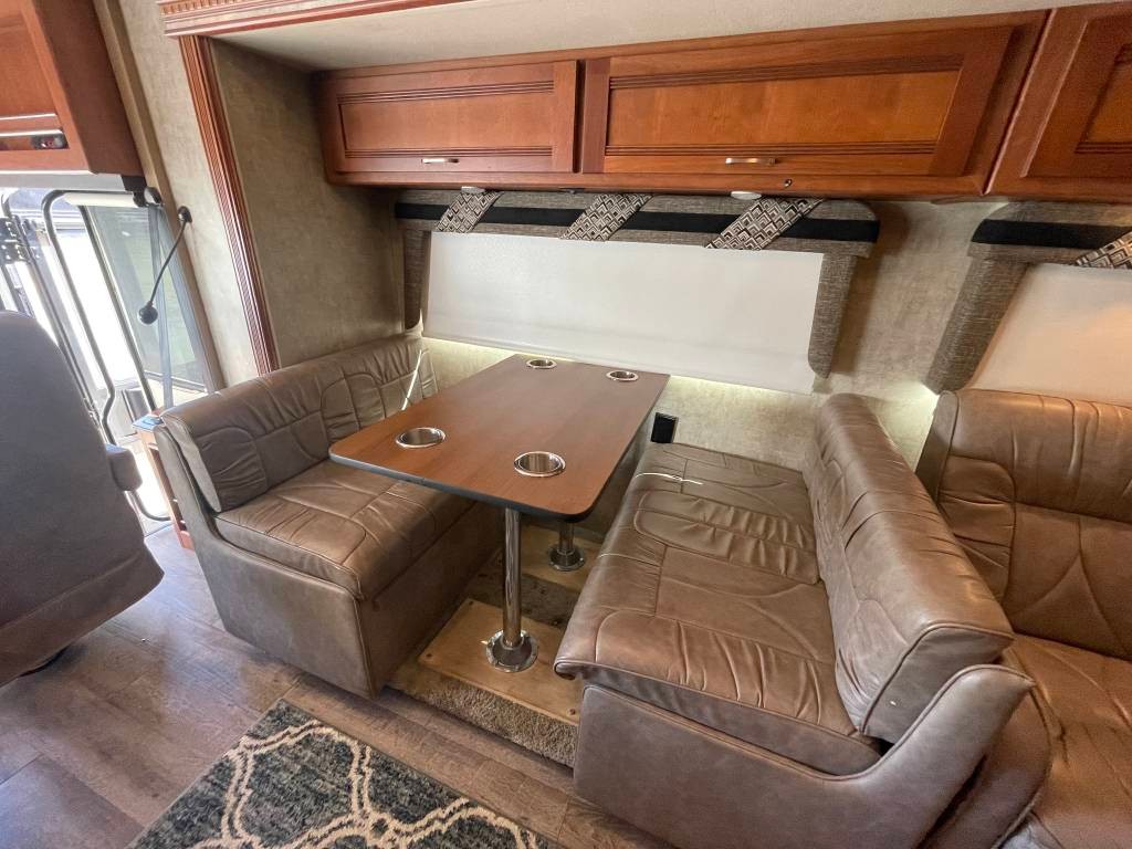 Queen bed in bedroom, mid coach dinette that converts to bunk beds, recliner couch, and main dinette that converts to a bed.