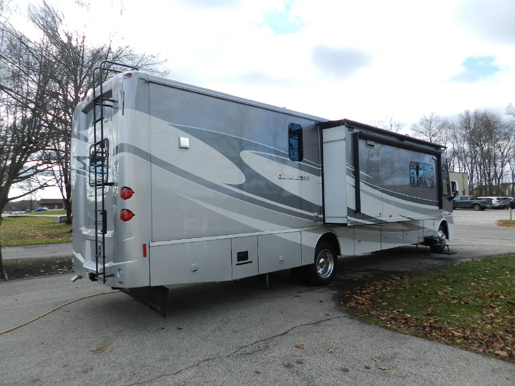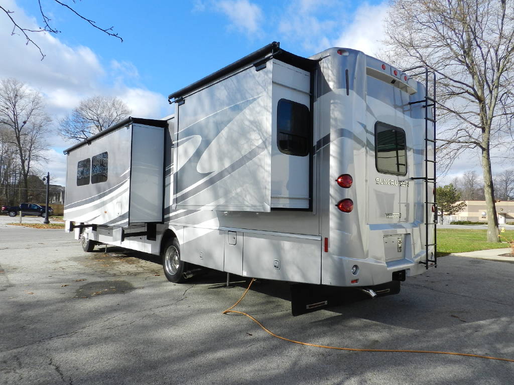 Industry leader in quality and comfort Winnebago Itasca Suncruiser 38Q Class A with 3 slides and only 5,000 miles per year of use. The Suncruiser 38Q is by far the nicest Gas Class A on the market. Premium features include; 1 piece fiberglass roof, full body paint, upgraded large power reclining L Sectional Sofa queen bed, large screen tv, in motion satellite, surround sound, fireplace, Corian solid surface counters throughout, solid wood cabinetry throughout, large fiberglass shower with glass doors, king size power adjustable bed, polished alloy wheels, huge amount of basement storage, towing package, slide awnings, power awning, rear camera with turn signal cameras, bluetooth, Kitchen Aid home refrigerator, stackable washer and dryer along with outside entertainment with TV and stereo. Fully inspected and serviced.
