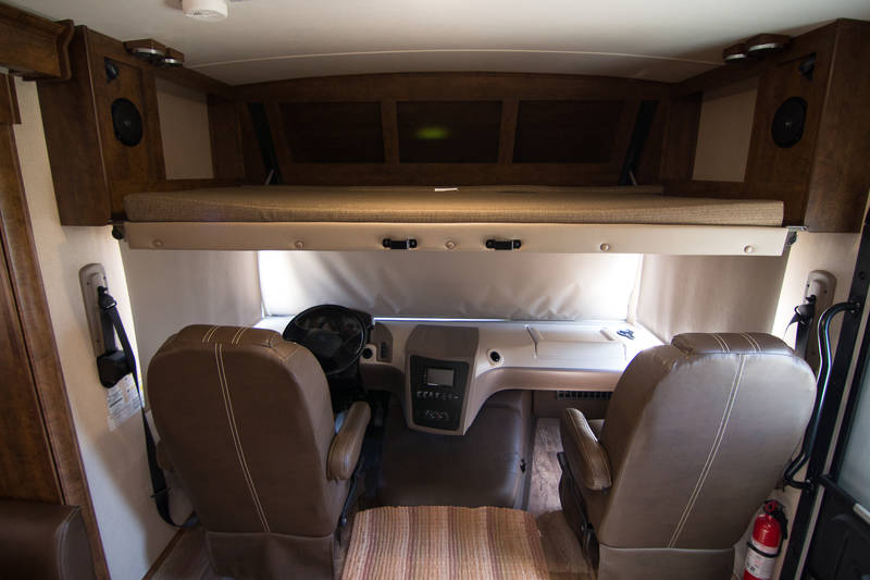 Power front fold-away bunk over driver area with ladder