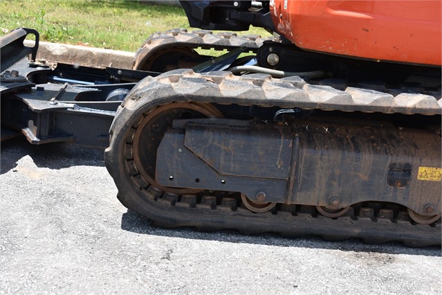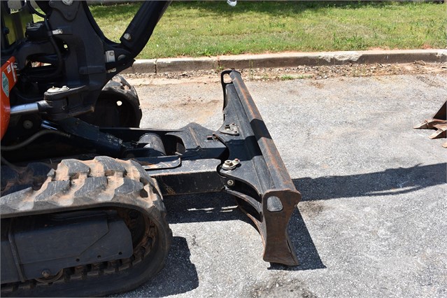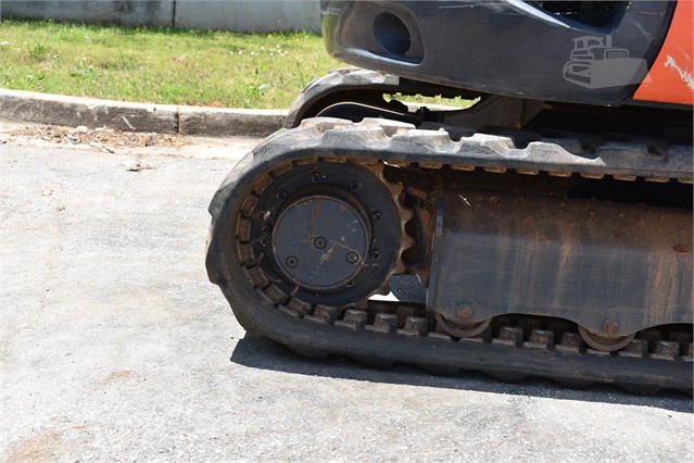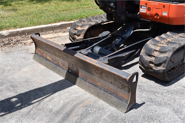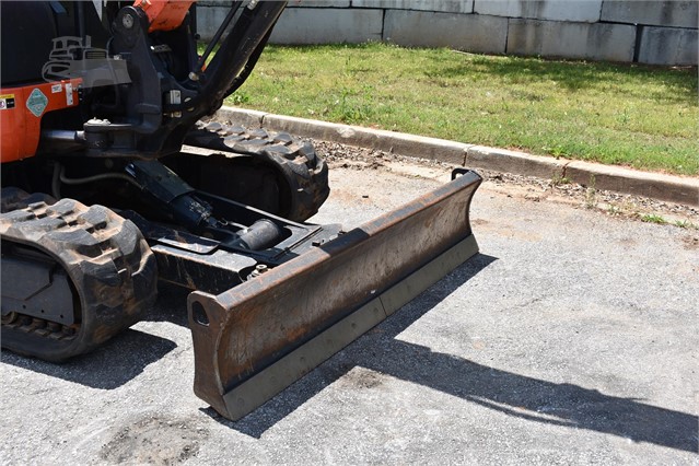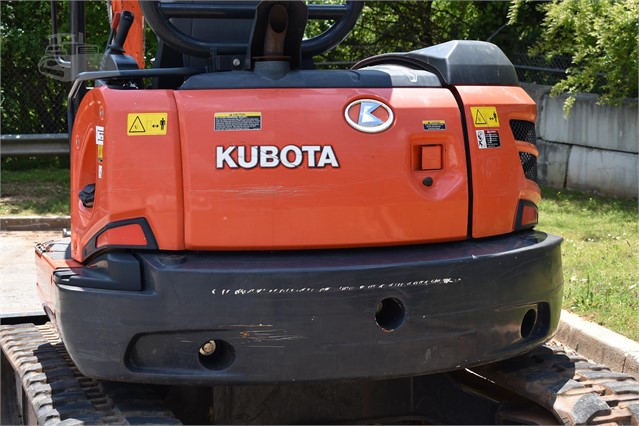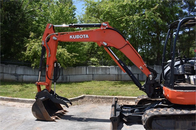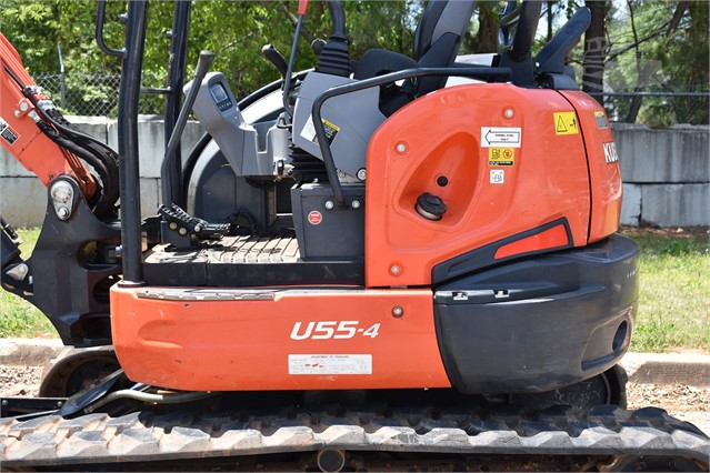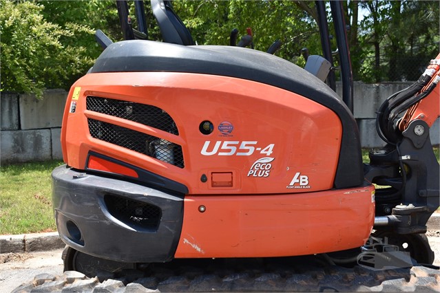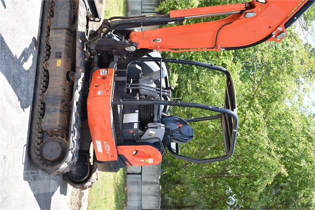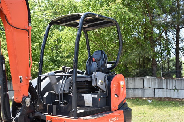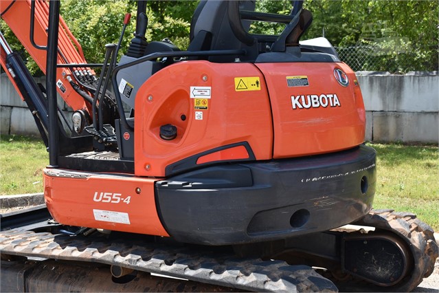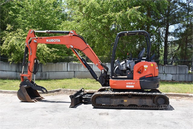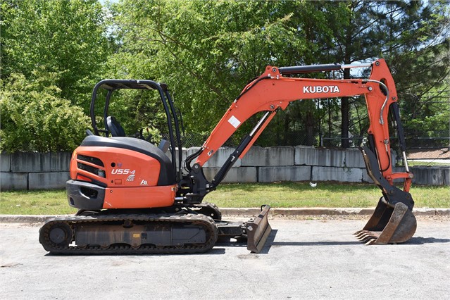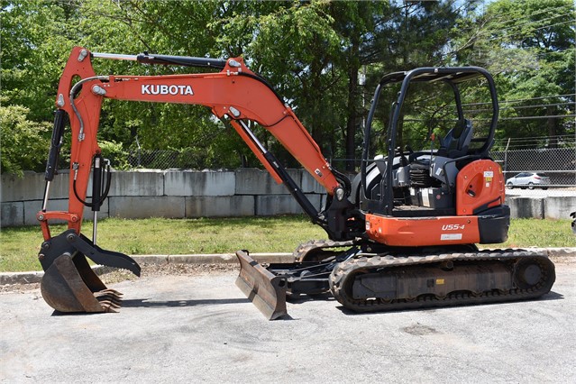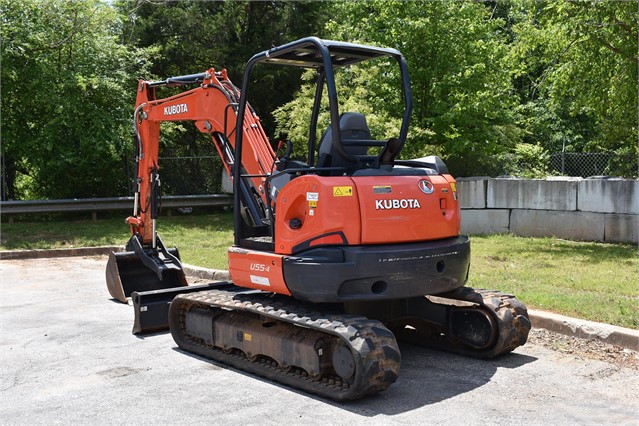 2016 Kubota U55-4 Mini Excavator. 894 hours. Open ROPS. Angle blade. Quick coupler. Hydraulic thumb. 24″ bucket. Kubota 47.6 hp (45.2 hp net) diesel engine 16″ rubber tracks 18” pin-on trenching bucket 6 ft. 5 in. Wide angle dozer blade thumb bracket 11,177 lb. Bucket breakout force 11 ft. 10 in. Maximum dig depth pump capacity gpm- 14.8 variable x 2 / 9.8 gear x 1 two travel speeds – 1.8/3.1 mph two-pattern selection system 18 gallon fuel capacity dimensions: 18’0”l x 6’5.2”w x 8’4.4”h. Operating weight: 12,280 lbs.