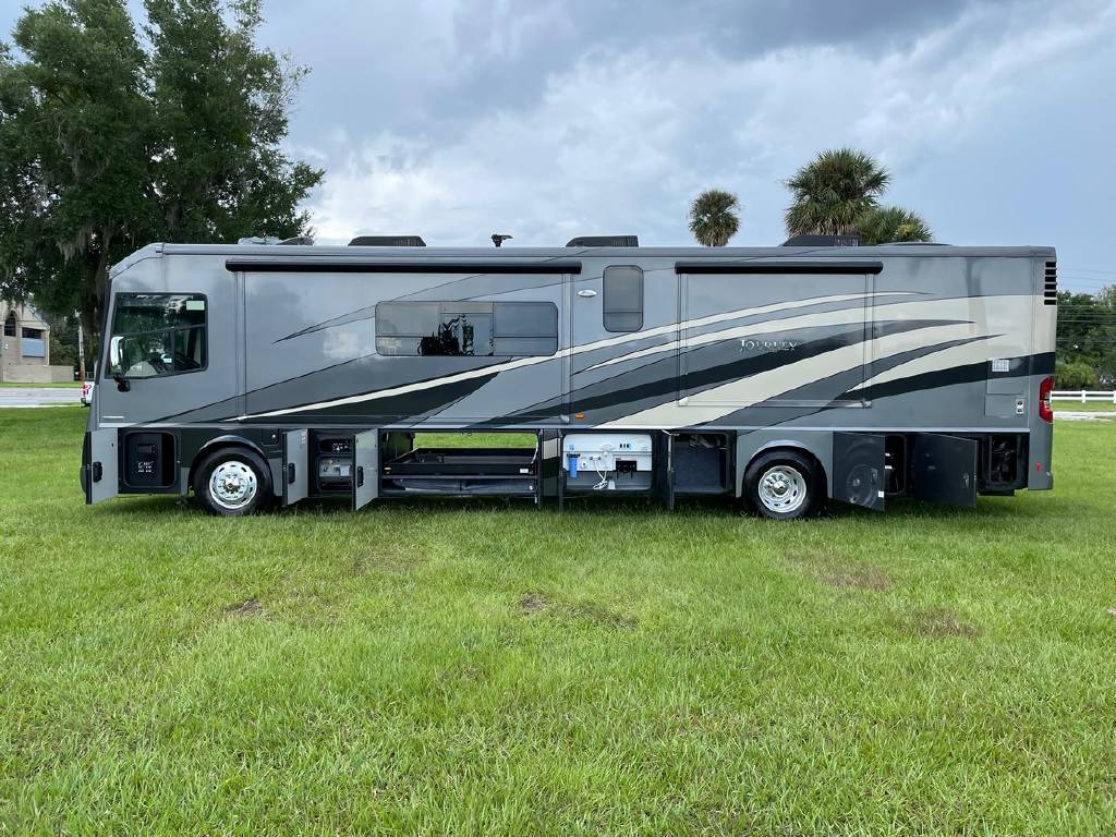 2016 Winnebago Journey 40R 3 slide motorhome with 53,223 miles. This couch is on a Maxum chassis powered by a 400-hp Cummins ISL 8.9L turbocharged diesel engine with Allison transmission. This coach has everything including Ultraleather ‘Rest Easy’ extendable sectional sofa, a massive HDTV with home theater soundbar, Glide & Dine dining table, fireplace, residential stainless steel French door refrigerator, microwave/convection oven, bath and a half, stackable washer/dryer, King size bed comfort control mattress, touch screen navigation and more!!!