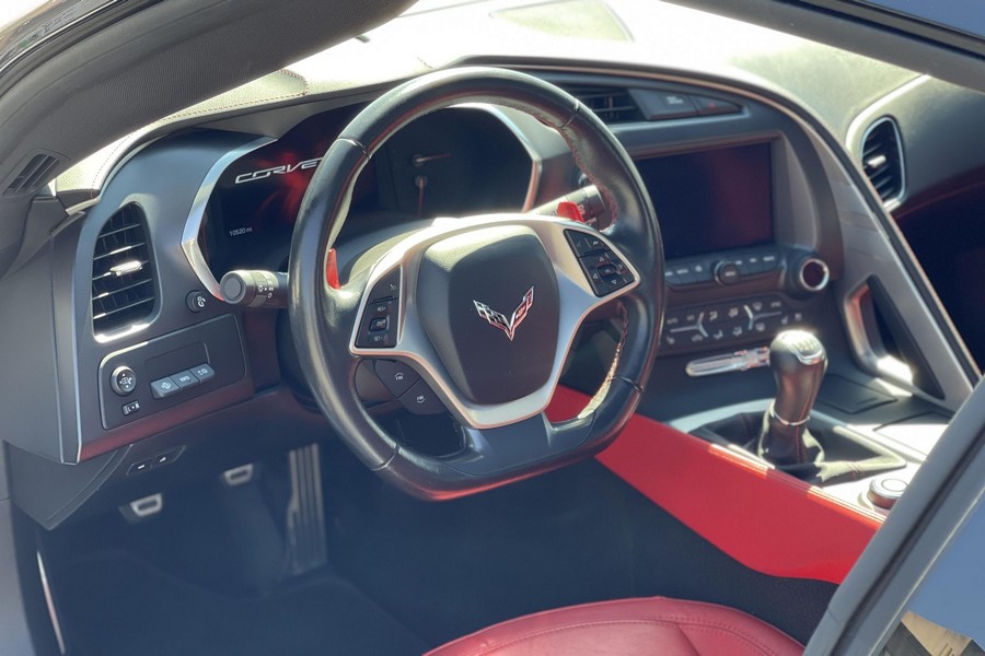 Factory equipment includes the Z07 Performance Package, the Body-Color Dual Roof Package, 19-inch front and 20-inch rear wheels, an electronic limited-slip differential, a performance exhaust system, a carbon fiber hood, Mulan leather upholstery, heated and ventilated Competition Sport bucket seats, a Bose 10-speaker audio system, and front curb view parking cameras.