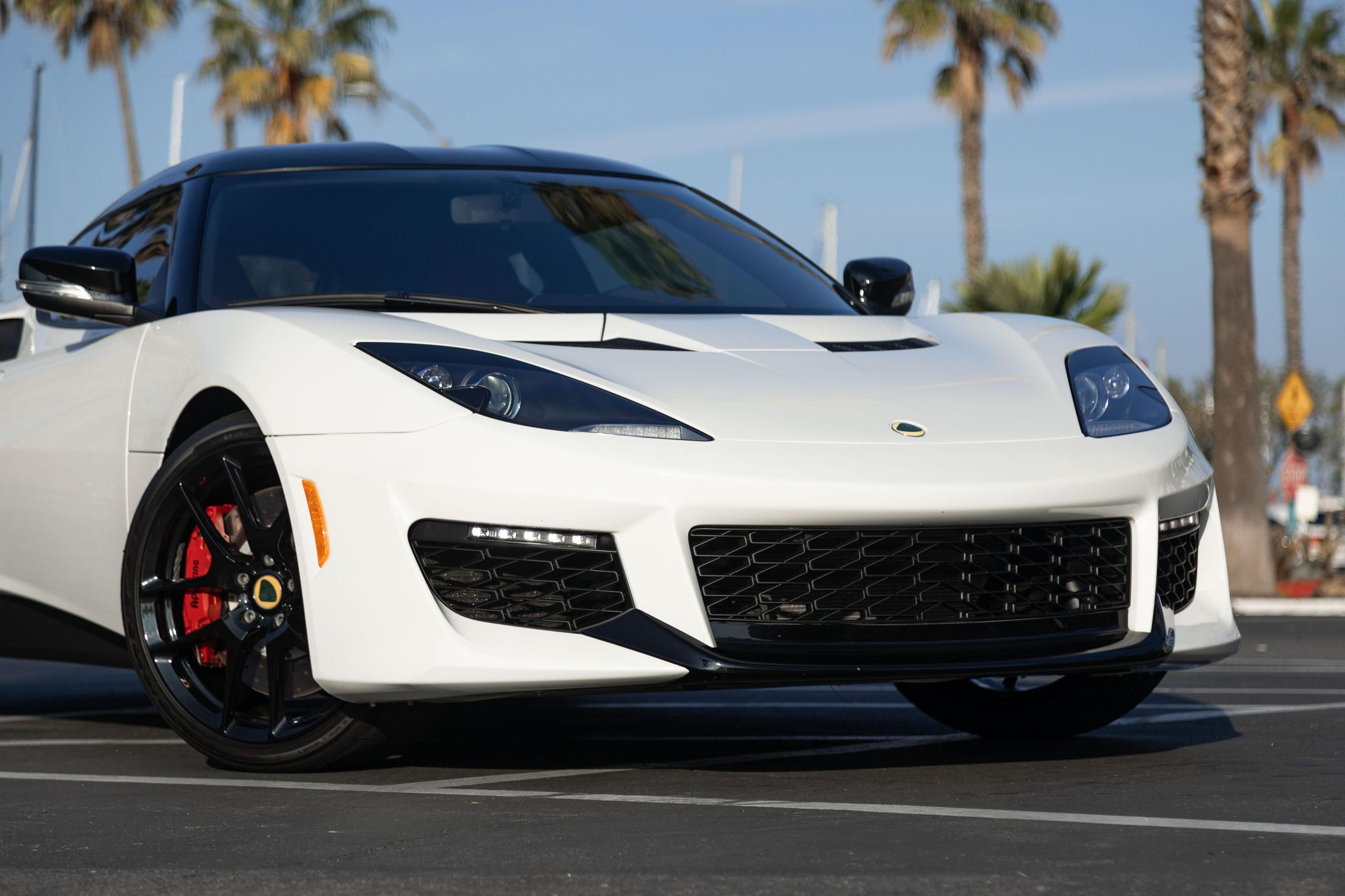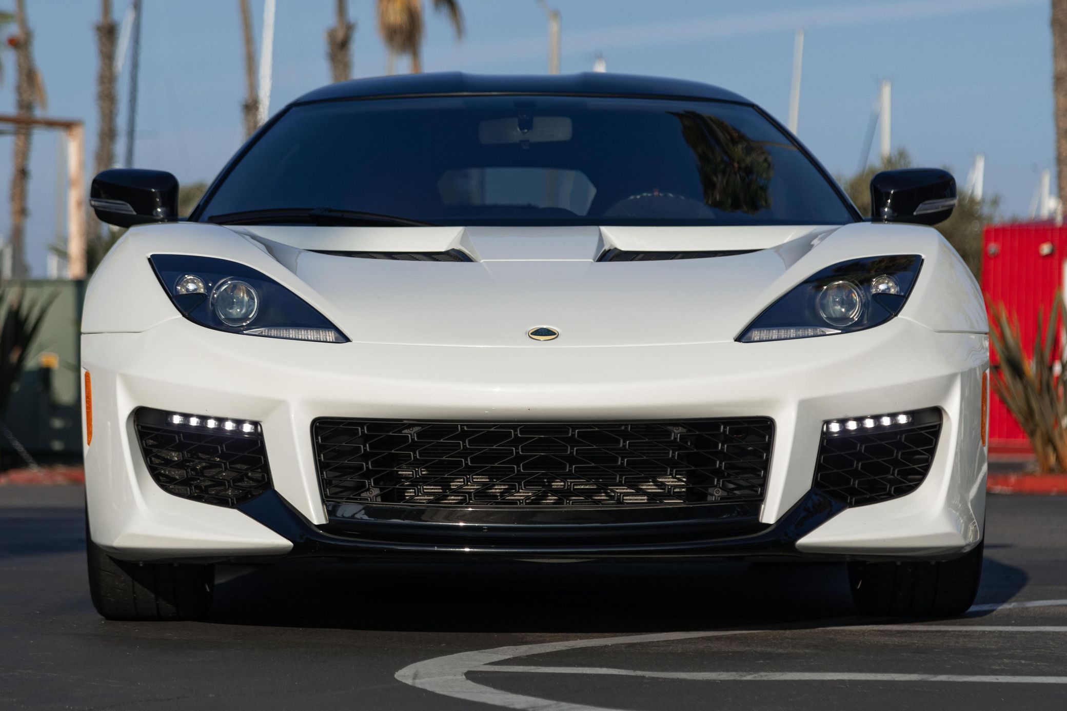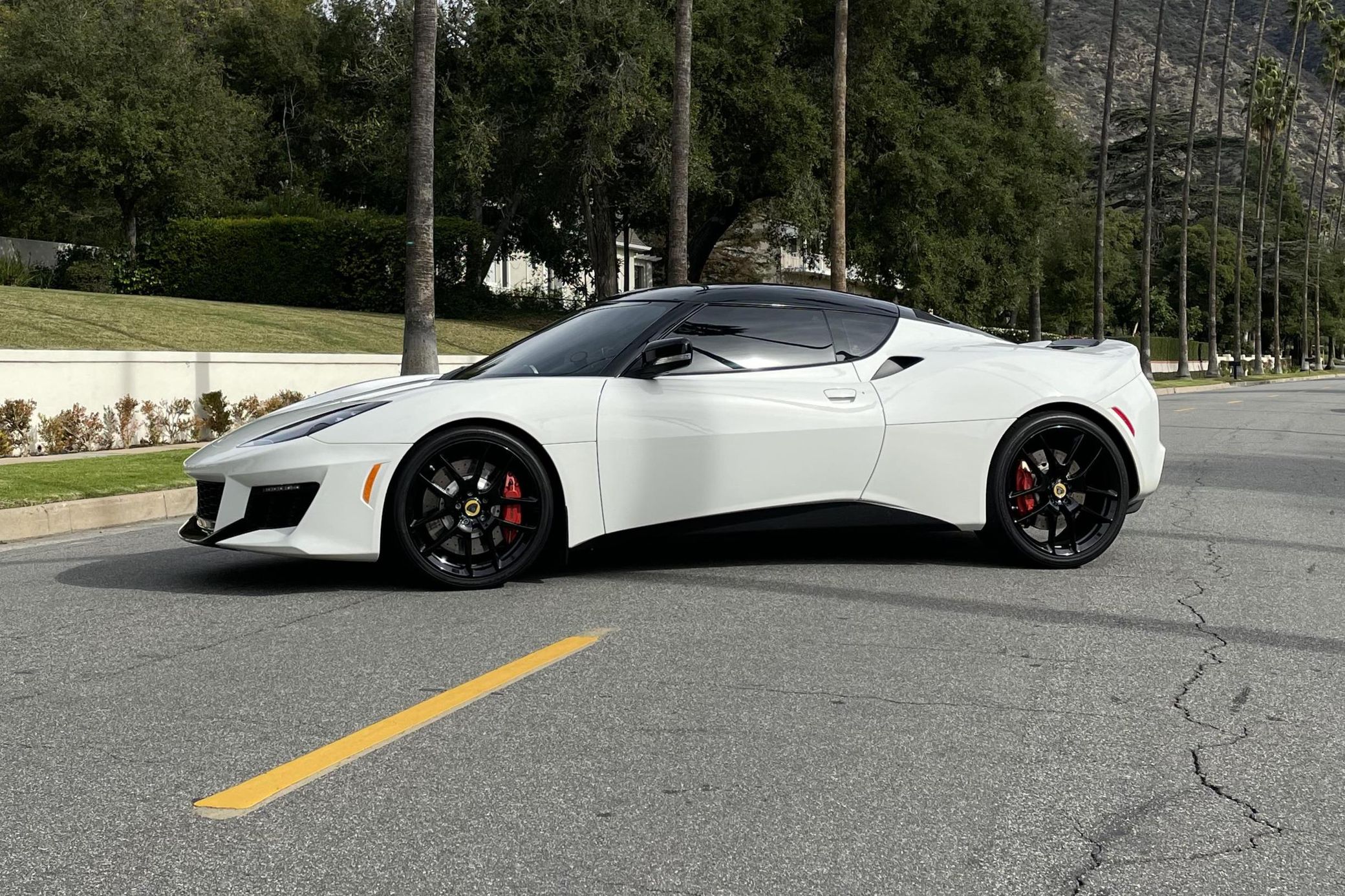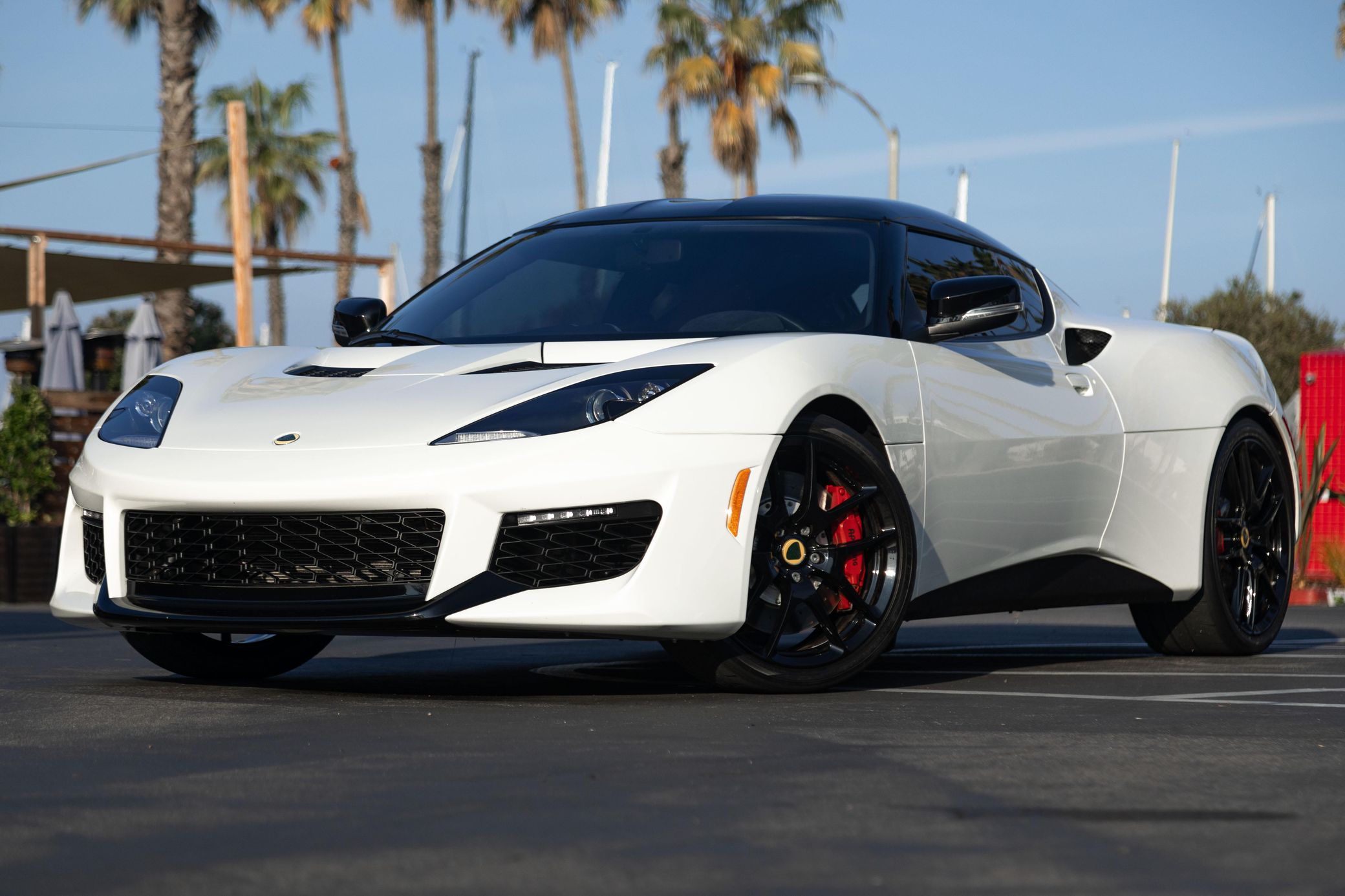 THIS… is a 2017 Lotus Evora 400, finished in Metallic White with a red interior.This Evora is equipped with the desirable 6-speed manual transmission. The attached Carfax vehicle history report lists no accidents. Equipment includes the Black Pack, Alcantara Pack, cruise control, 19-inch front and 20-inch rear forged alloy wheels, and Bluetooth connectivity. The seller reports that the third catalytic converter has been removed. When the mid-engine Lotus Evora came out for the 2010 model year, it was the first all-new vehicle platform for a Lotus since the Elise debuted in 1995. The intent was to create a straightforward design that emphasizes a pure driving experience with agile handling in a stylish, lightweight road car. Power comes from a Toyota-derived supercharged 3.5-liter Toyota “2GR-FE” V6, rated at 400 horsepower and 302 lb-ft of torque. Power is sent to the rear wheels via a 6-speed manual transmission and rear limited-slip differential.