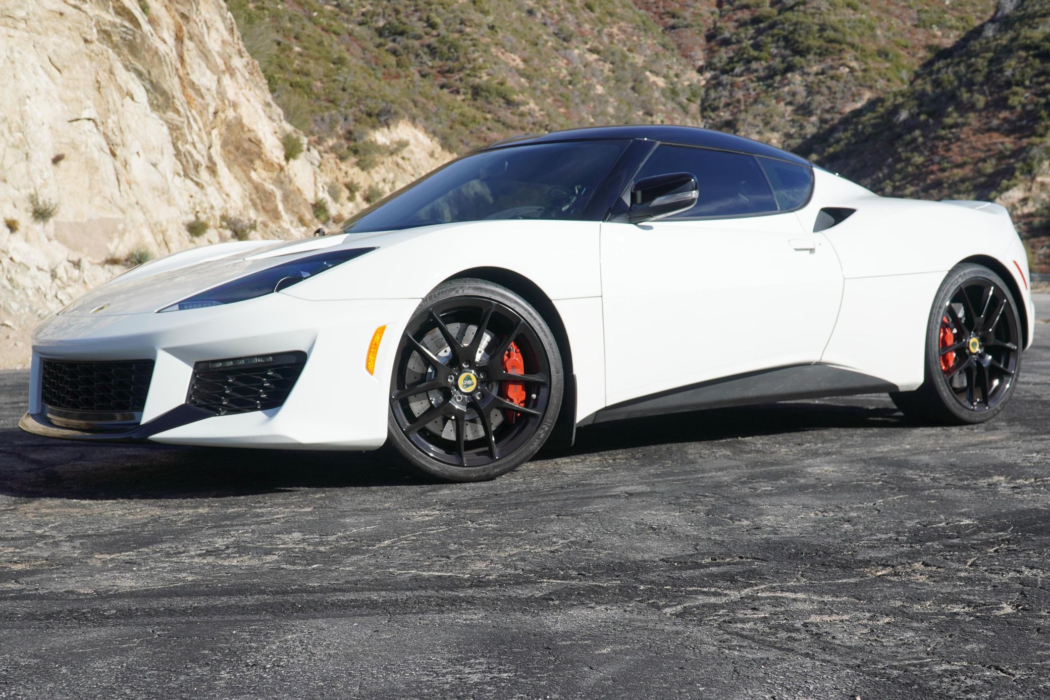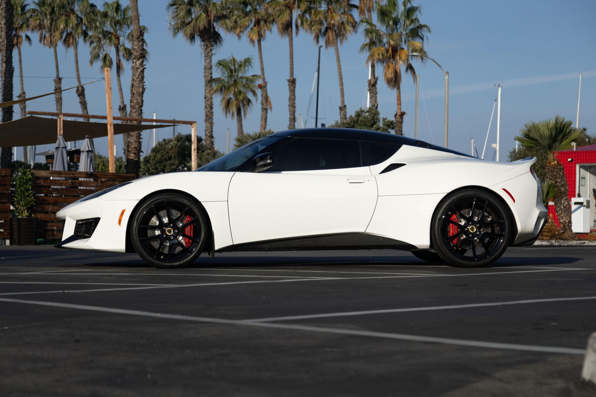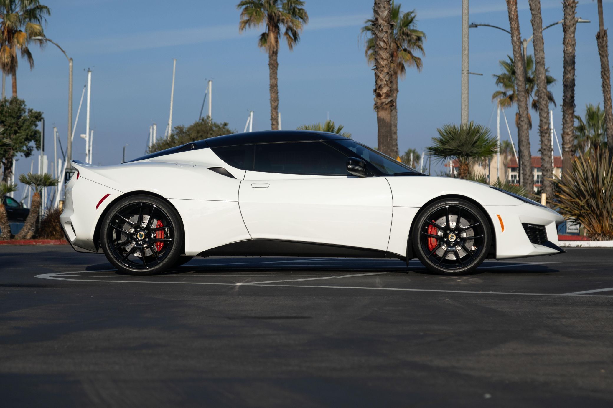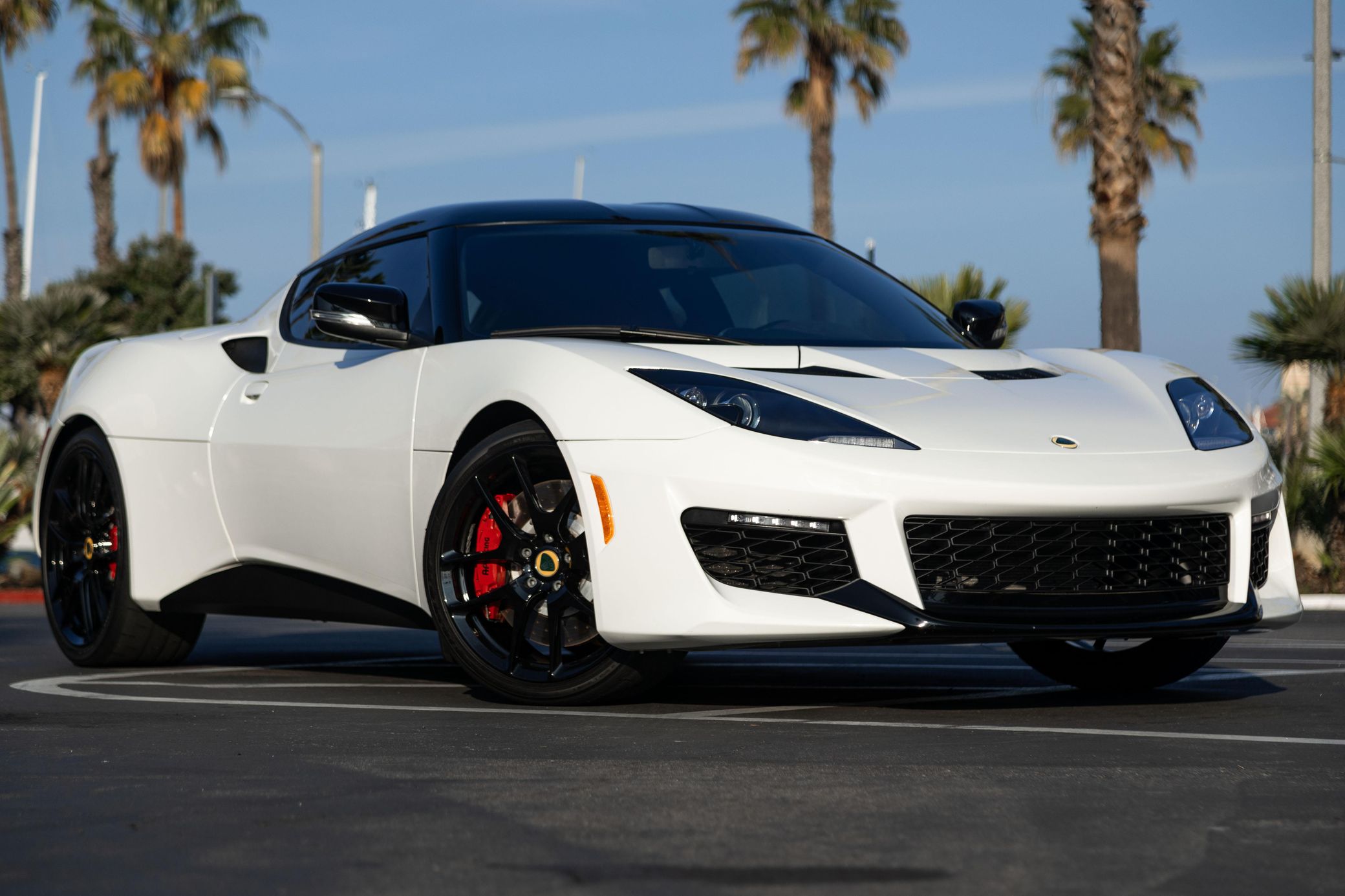 THIS… is a 2017 Lotus Evora 400, finished in Metallic White with a red interior.This Evora is equipped with the desirable 6-speed manual transmission. The attached Carfax vehicle history report lists no accidents. Equipment includes the Black Pack, Alcantara Pack, cruise control, 19-inch front and 20-inch rear forged alloy wheels, and Bluetooth connectivity. The seller reports that the third catalytic converter has been removed. When the mid-engine Lotus Evora came out for the 2010 model year, it was the first all-new vehicle platform for a Lotus since the Elise debuted in 1995. The intent was to create a straightforward design that emphasizes a pure driving experience with agile handling in a stylish, lightweight road car. Power comes from a Toyota-derived supercharged 3.5-liter Toyota “2GR-FE” V6, rated at 400 horsepower and 302 lb-ft of torque. Power is sent to the rear wheels via a 6-speed manual transmission and rear limited-slip differential.