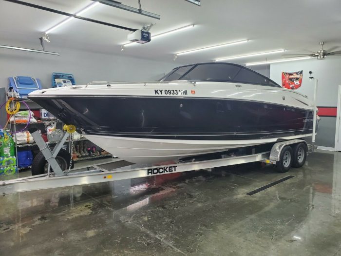 2017 Montery 264fs. 6.2 liter mercruiser v8 with 300hp, Bravo three outdrive with dual stainless propellers. Enclosed head with vacuum flush toilet wich goes to a holding tank that can either be sucked out or you can use the Maserator pump to send it directly into the water. It has an 80 gallon fuel tank and 15 gallon water tank. One sink in the bathroom and one in the bar console. Rear swim shower. The rear lounge pad has three different positions. Lots and lots of storage on this boat. It is yacht certified so it does not have a capacity limit. But it will hold 8 people very comfortably. More if you don’t mind being close. It has the sea fire automatic fire extinguishing system. Bluetooth stereo. Led interior lights that change colors. All of the compartments has lighting as well. The driver seat has a tear in the back do to rubbing the bar console. Minor sun fading on the driver and passenger seats. The rear pad also has minor sun fading. The rest of the seats are nearly perfect. The exterior of the boat is in great shape, minor scratches here and there. No bottom damage. There is a small Crack in the gel coat in the black area, It is not very bad. It is a large bow rider that handles rough water very well, and it will run 50mph. The trailer is new, was bought it in January. It has surge brakes with disc brakes on both axles and all led lighting.