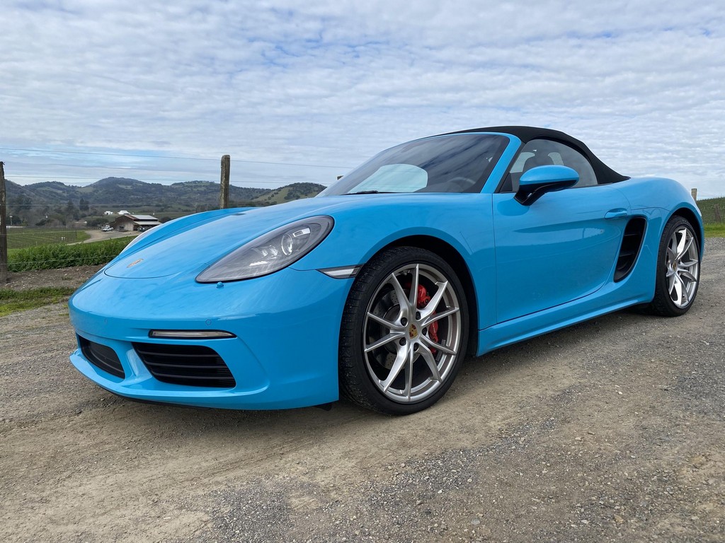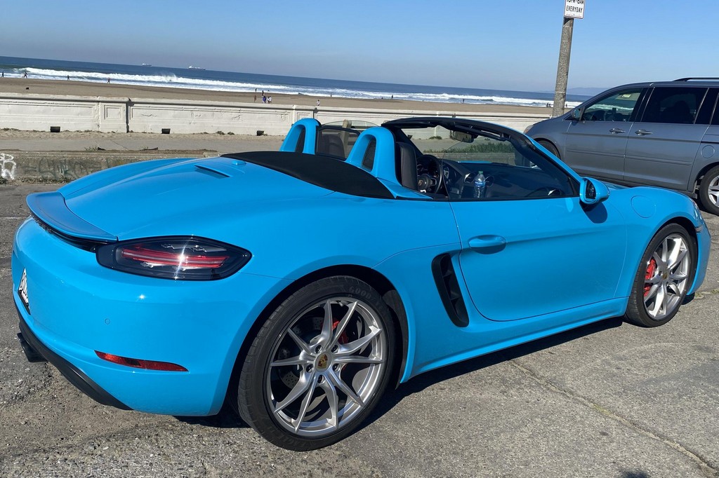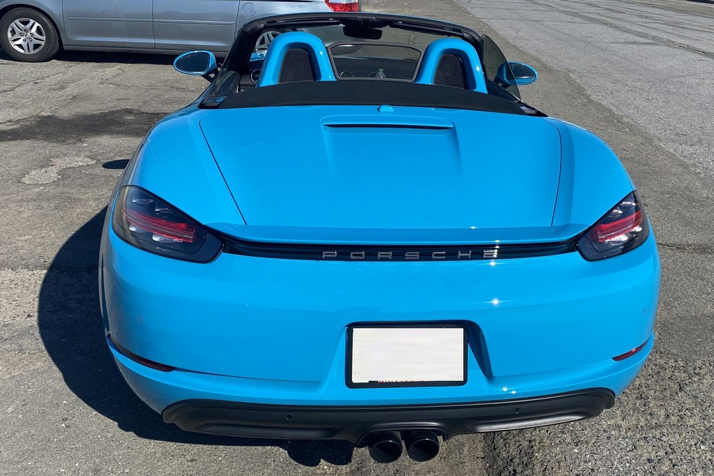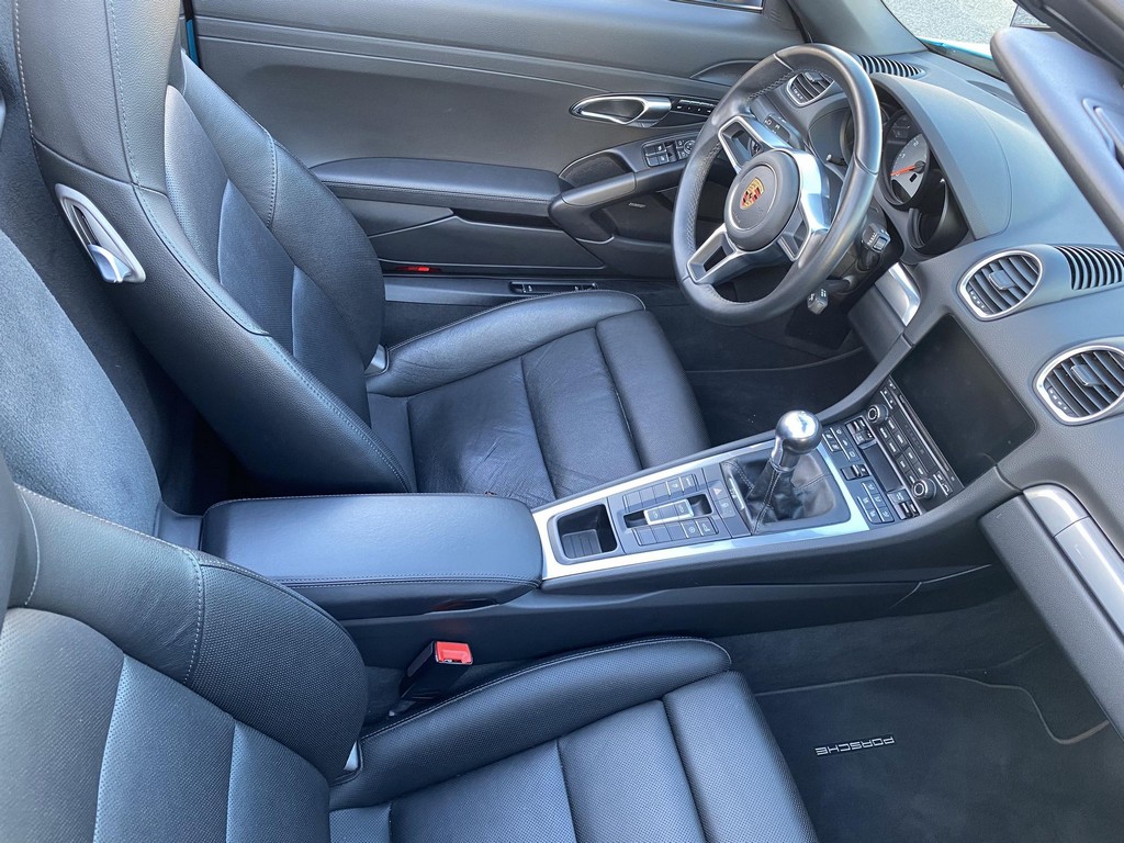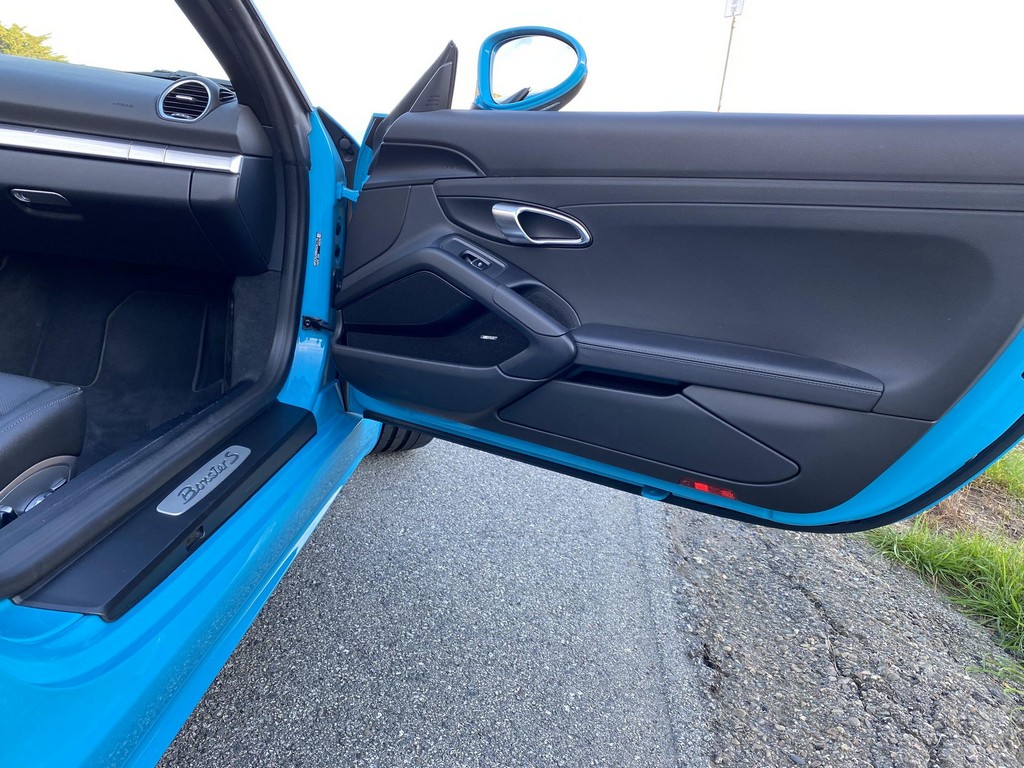 THIS… is a 2017 Porsche Boxster S, finished in Miami Blue with a black soft top and a black interior. The attached Carfax history report shows no accidents or mileage discrepancies in this Boxster’s past. Factory equipment includes the Premium Package Plus, which adds bi-xenon PDLS adaptive headlights, power-adjustable heated and ventilated sport seats with memory function, dual-zone automatic climate control, ambient lighting, rain-sensing wipers, and the Porsche Entry & Drive keyless system. Other notable equipment includes 20-inch Carrera S wheels, a body-colored roll bar, black sport tailpipes, and more as listed below. Modifications reported by the seller are limited to Euro-spec white side reflectors and a set of AlloyGator wheel curb protectors. The “982” generation of the mid-engine Porsche 718 Boxster introduced a new range of turbocharged 4-cylinder engines, replacing the 6-cylinder powerplants of previous Boxster models. The intent was to increase performance and efficiency but retain the nimble handling and distinct styling of past Boxsters. Power comes from a turbocharged 2.5-liter flat-4 engine, rated at 350 horsepower and 309 lb-ft of torque. Output is sent to the rear wheels via a 6-speed manual transmission.