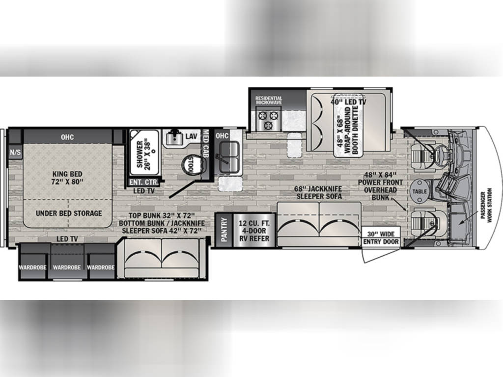 Sleep Options: 2 Bunk Beds, King Bed, Sofa, Overhead, Dinnette