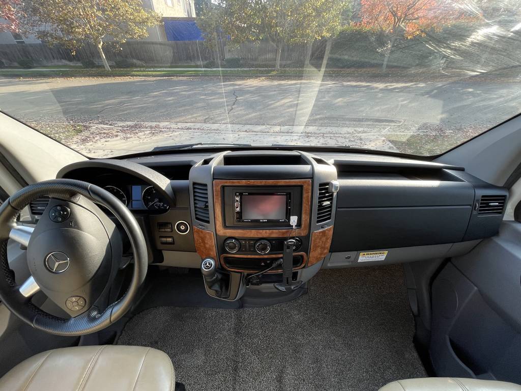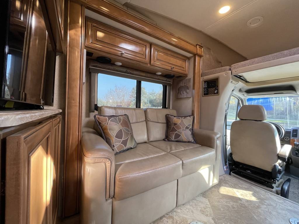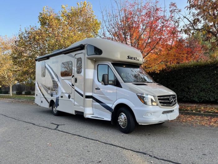 Beautiful 2018 Thor Motor Coach Siesta Sprinter 24SR Class C Diesel motorhome with only 16K miles. This fabulous little unit has two slides for a spacious interior, but with a total length of only 25 ft making it a breeze to drive and park. Gorgeous interior with high-gloss glazed Monterey Maple cabinetry with raised panel cabinet doors and hidden hinges, solid surface countertops, stainless steel refrigerator, stainless convection microwave, induction cooktop, stainless sinks in kitchen and bath, leatherette furniture, skylight, and roller privacy shades. The bedroom features a queen bed, 32″ flat screen TV, 12V attic fan and 2 closets. It also has a convenient over cab bunk bed on hydraulic struts with a detachable ladder, so that it easily lifts up out of the way when not in use. Entertainment system includes a Bluetooth Coach Radio System with DVD player, HDMI and App control, a power charging center for electronics with Safety Net. This unit is on a Mercedes Benz Sprinter chassis and is powered by a Mercedes-Benz 3.0L V6 turbo diesel engine with 188hp and an automatic transmission and equipped with a Cummins Onan 3.2KW generator, 13,500 BTU low-profile roof A/C unit, 30,000 BTU furnace, an instant tankless water heater, second auxiliary battery, and electric stabilizing system. It has an 11 ft power patio awning with integrated LED lighting, slide awnings, frameless windows, heated exterior mirrors, an exterior entertainment center with a flat screen TV and marine grade speakers, outside shower, exterior LP/BBQ connection, enclosed and heated holding tanks, with an abundance of exterior storage space including a large rear pass through compartment with three side access doors.