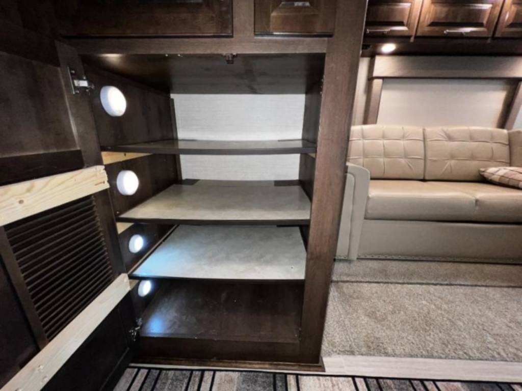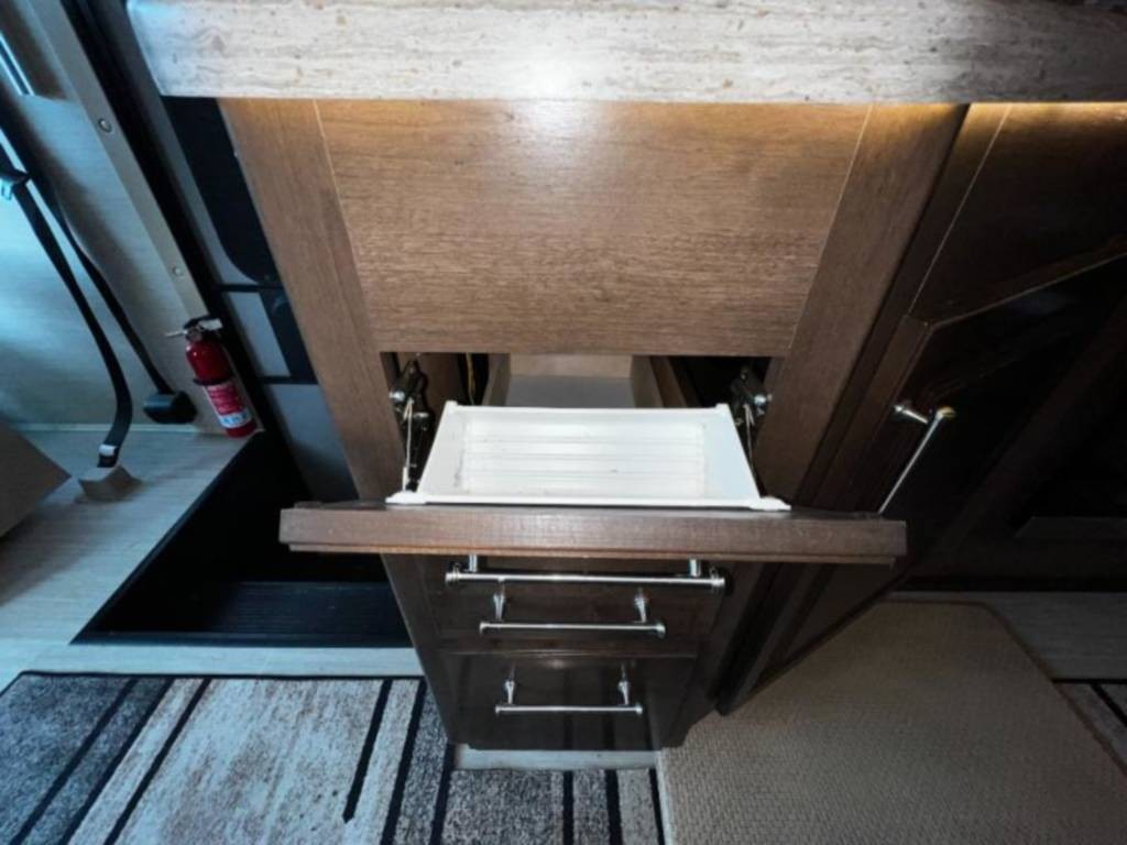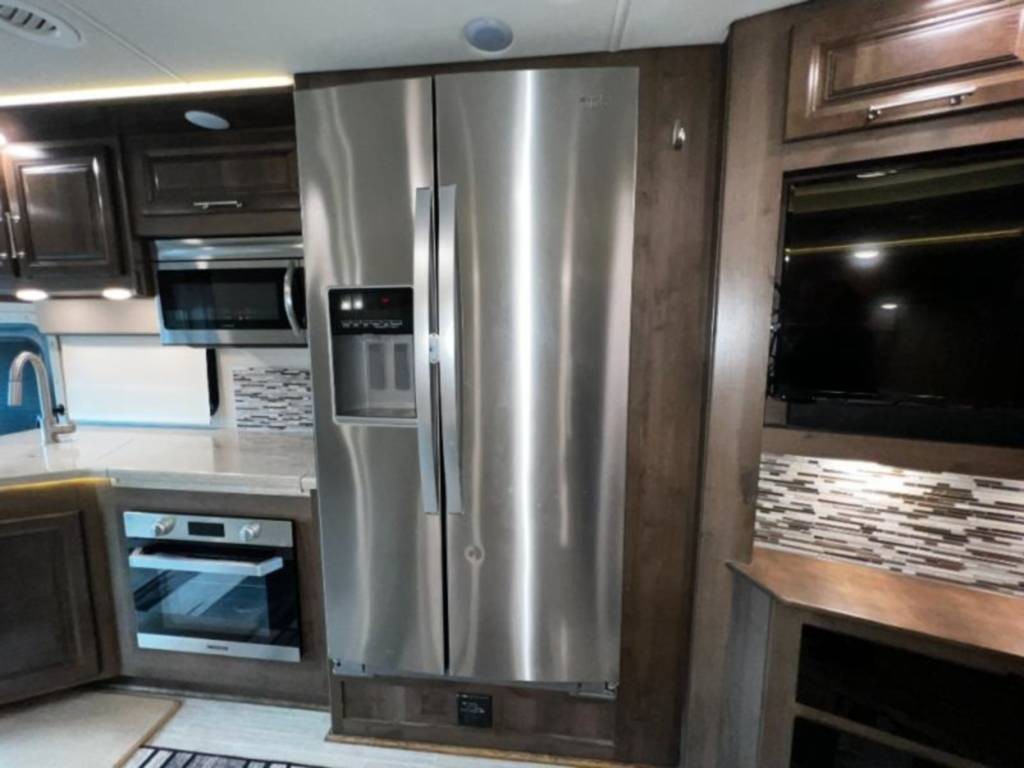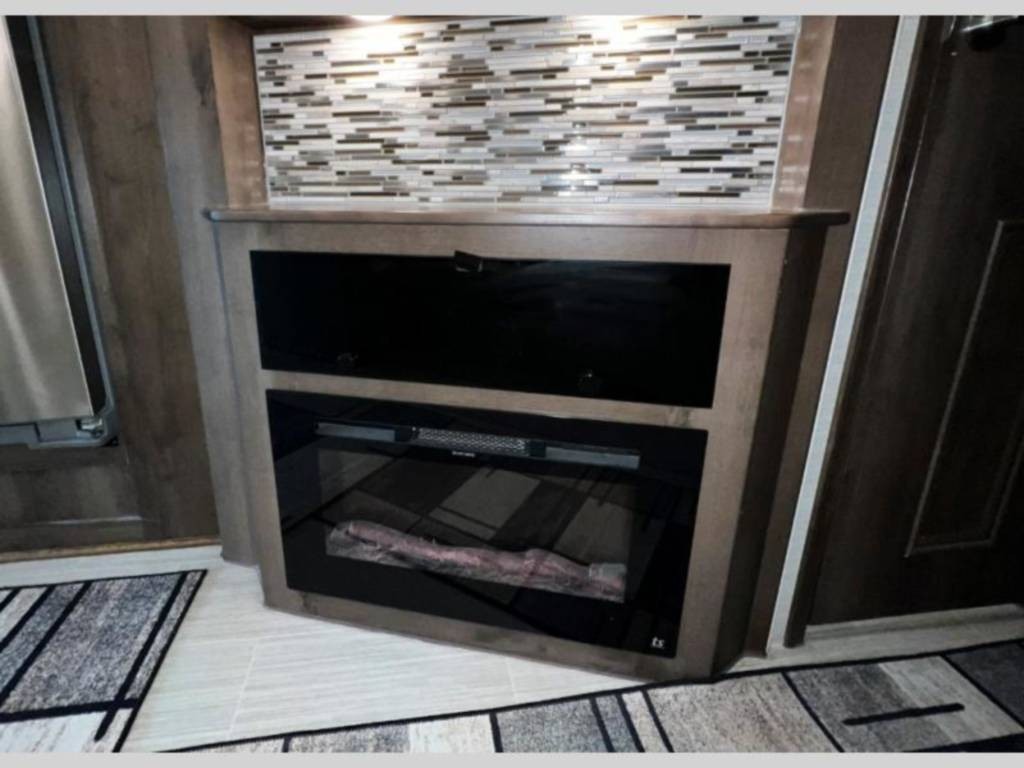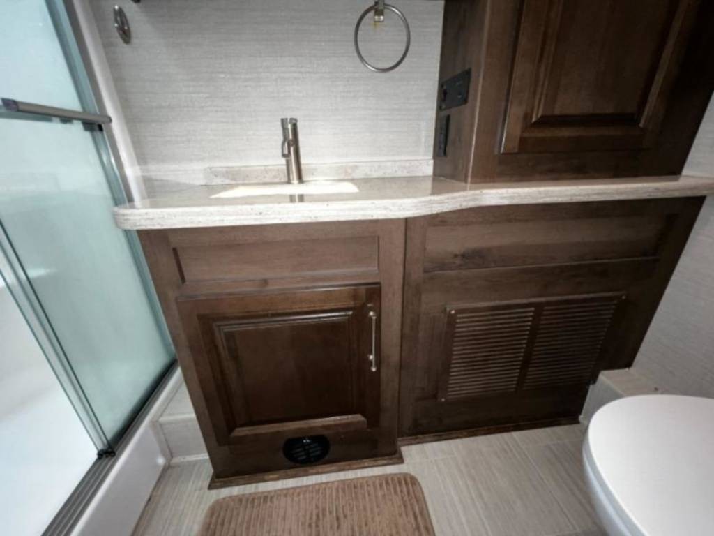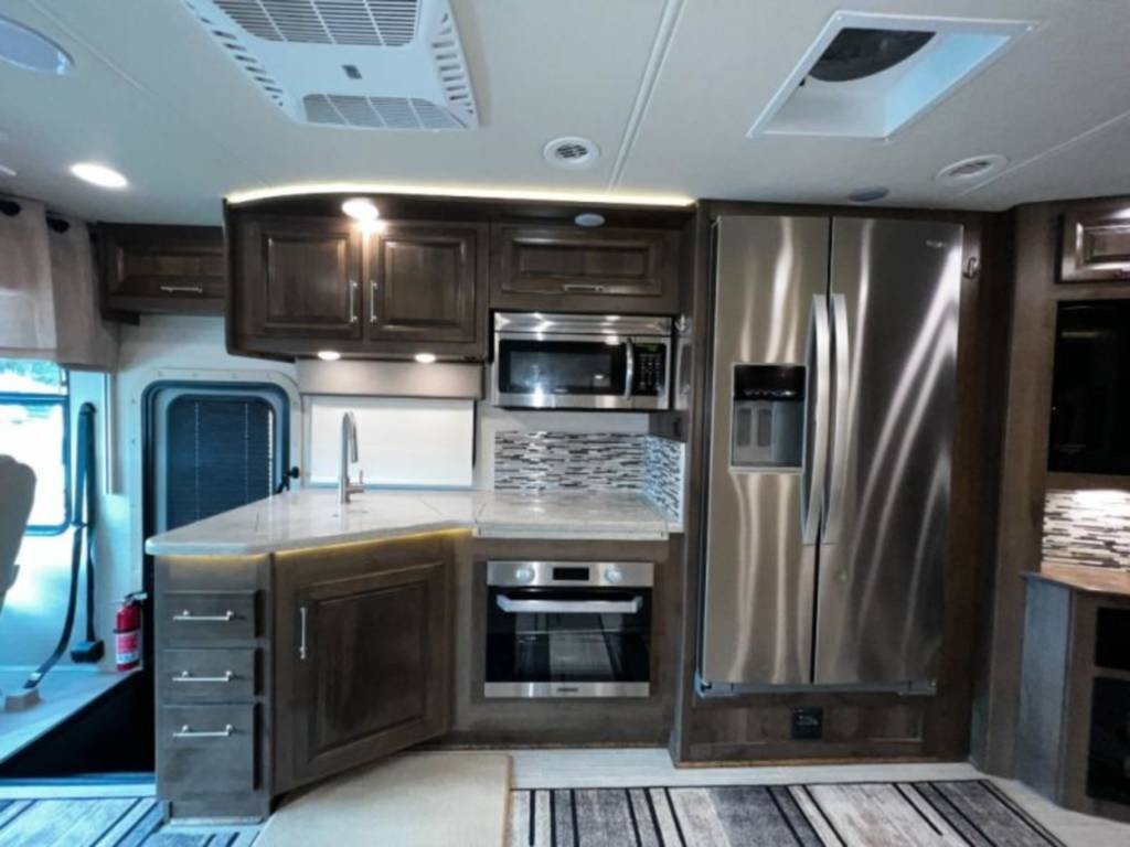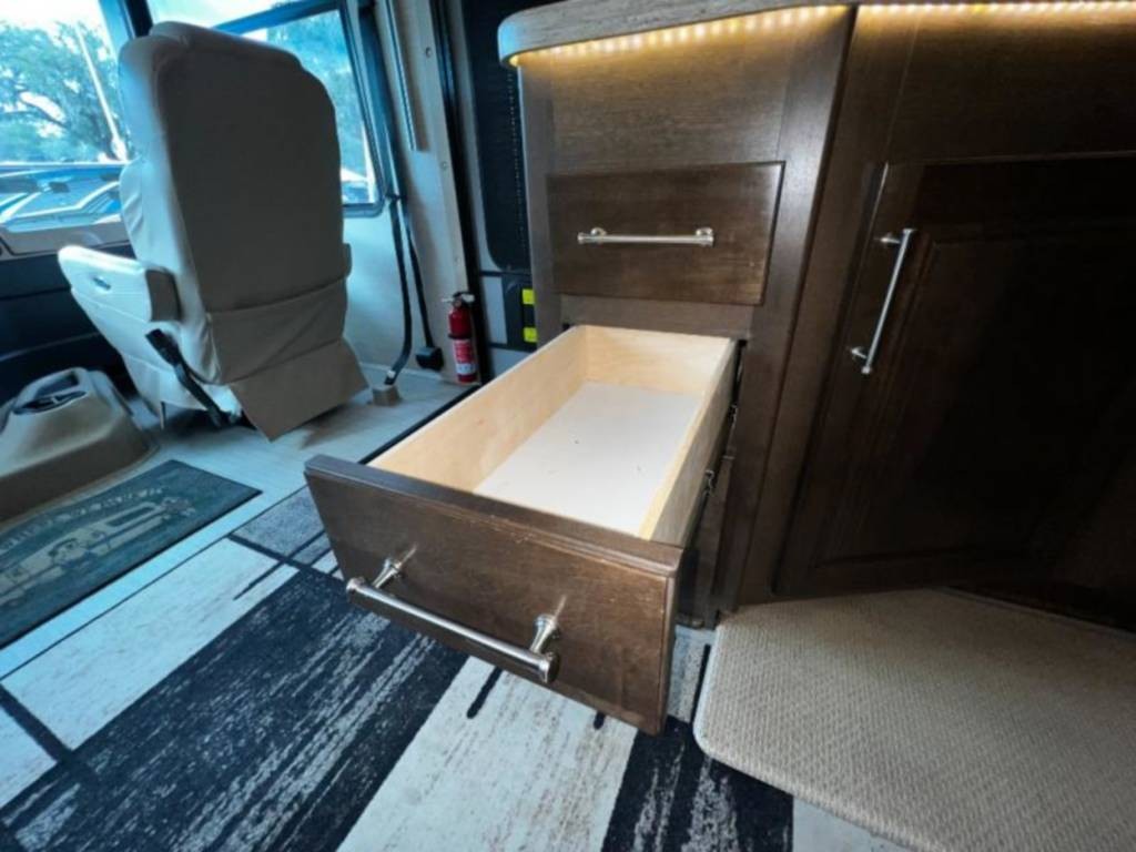The residential feel of this coach not only promises comforts and conveniences for your entire journey, but the look and feel once you step inside tells you that luxury living is going to be your new way of travel. You are going to enjoy the spacious interior thanks to two nice size slides. Once parked, and the slides are opened up, sink back into the extendable sofa and enjoy a cozy fire in the fireplace as you watch your favorite program on the 39″ LED TV provided. All of the residential appliances will make it easy to cook gourmet meals just like home. And, at bedtime, a king bed is waiting to whisk you off to dreamland! The rear bath offers privacy from the main living area up front, and there is also a half bath easily accessible during the day. Outside, you will find tons of storage space with a lockable pass-through compartment that makes packing and storing your outdoor gear easy, and the 17′ electric awning with outside entertainment center provides a place to hang out both day and night protected from the elements while enjoying a bit of fresh air. You also have the option of adding a drop-down overhead bunk for added guests that wish to spend the night, plus so much more.