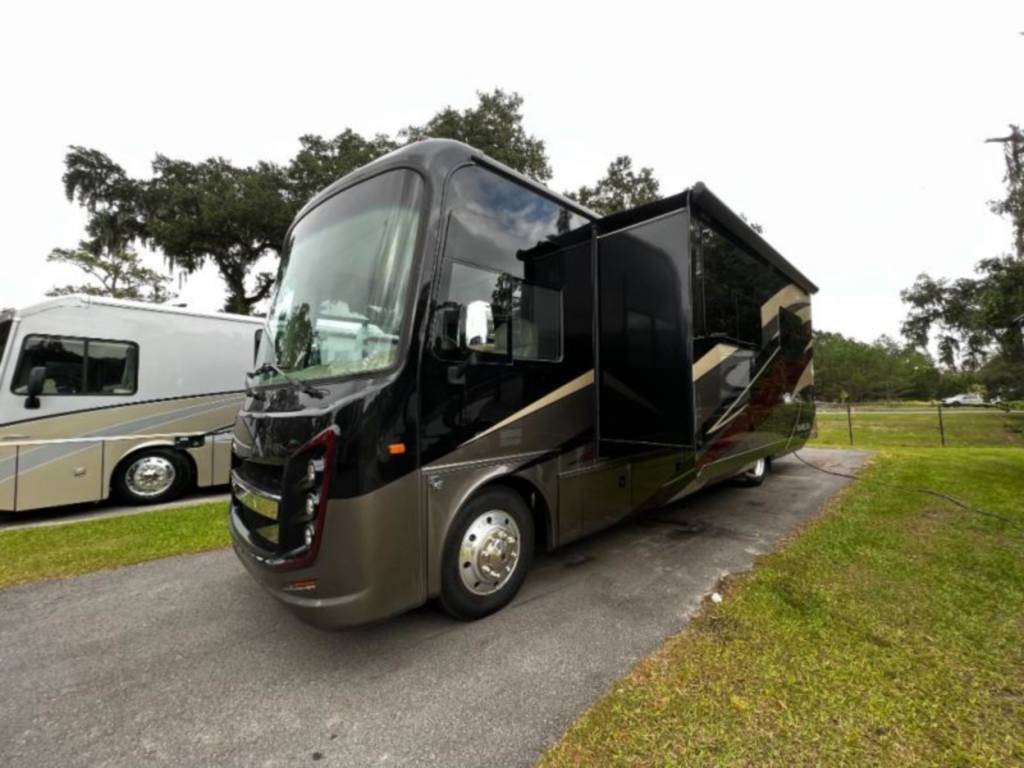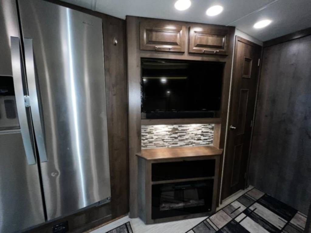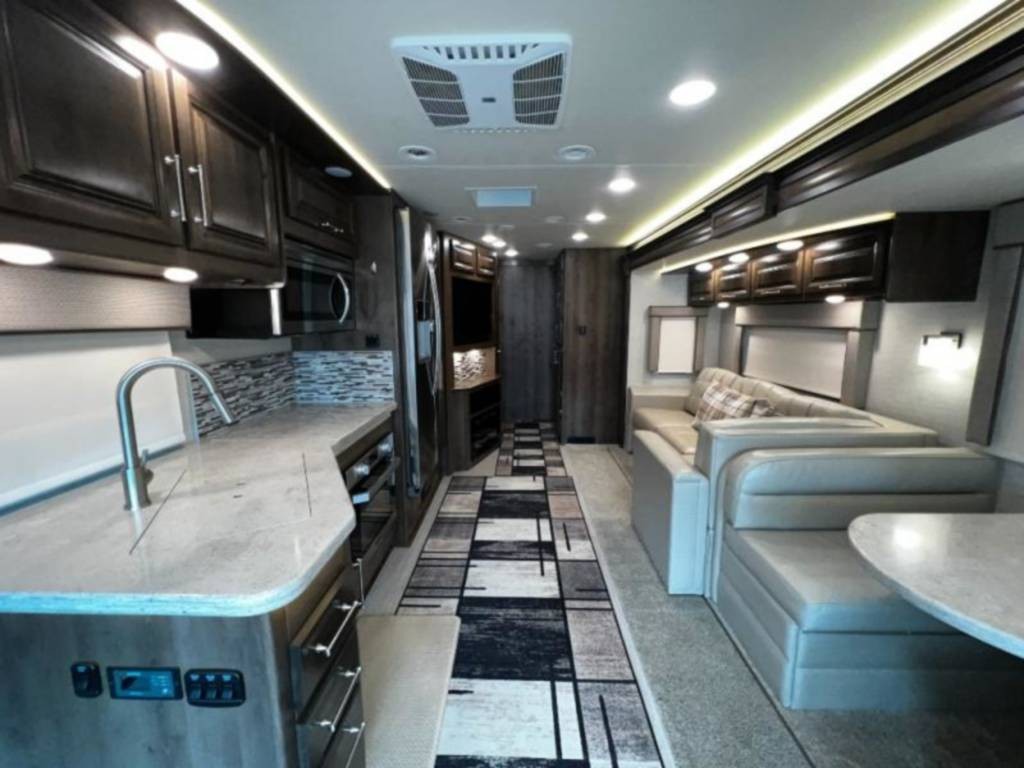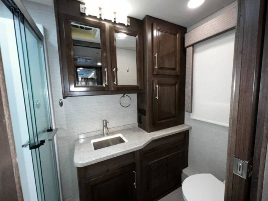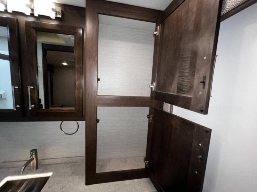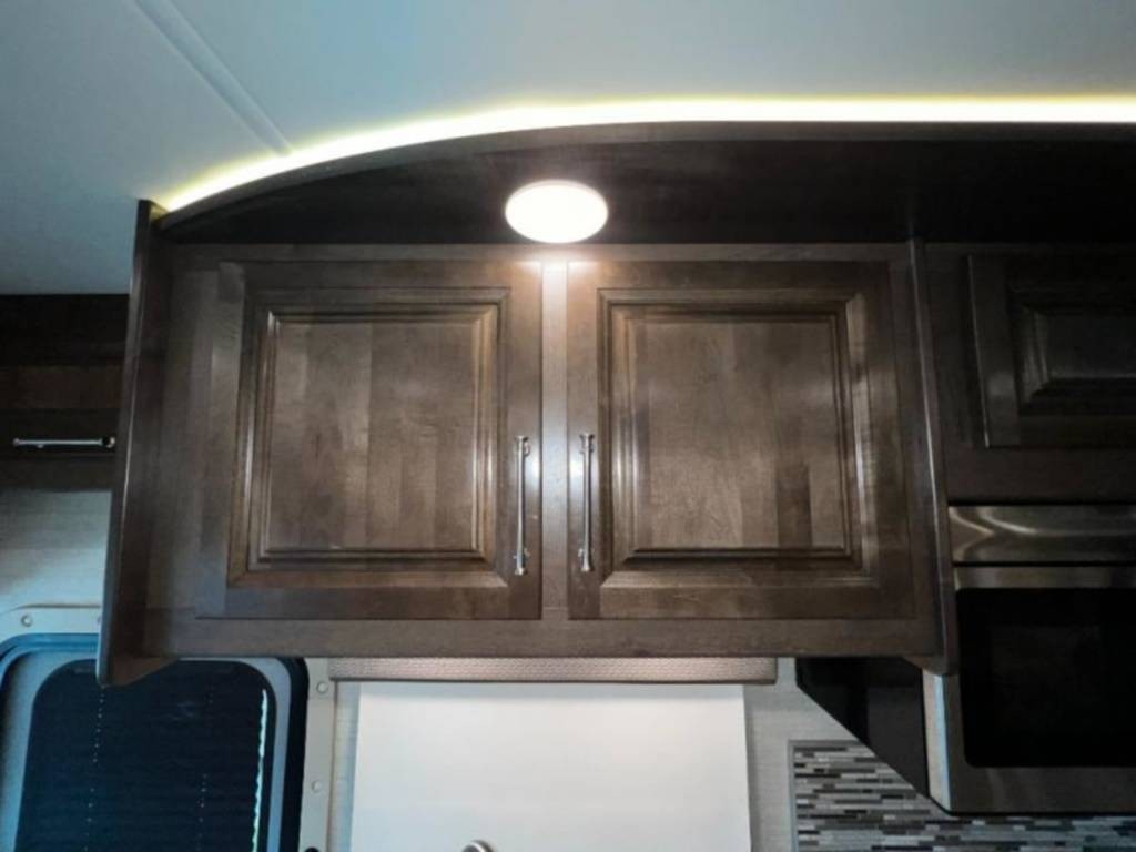 The residential feel of this coach not only promises comforts and conveniences for your entire journey, but the look and feel once you step inside tells you that luxury living is going to be your new way of travel. You are going to enjoy the spacious interior thanks to two nice size slides. Once parked, and the slides are opened up, sink back into the extendable sofa and enjoy a cozy fire in the fireplace as you watch your favorite program on the 39″ LED TV provided. All of the residential appliances will make it easy to cook gourmet meals just like home. And, at bedtime, a king bed is waiting to whisk you off to dreamland! The rear bath offers privacy from the main living area up front, and there is also a half bath easily accessible during the day. Outside, you will find tons of storage space with a lockable pass-through compartment that makes packing and storing your outdoor gear easy, and the 17′ electric awning with outside entertainment center provides a place to hang out both day and night protected from the elements while enjoying a bit of fresh air. You also have the option of adding a drop-down overhead bunk for added guests that wish to spend the night, plus so much more.
