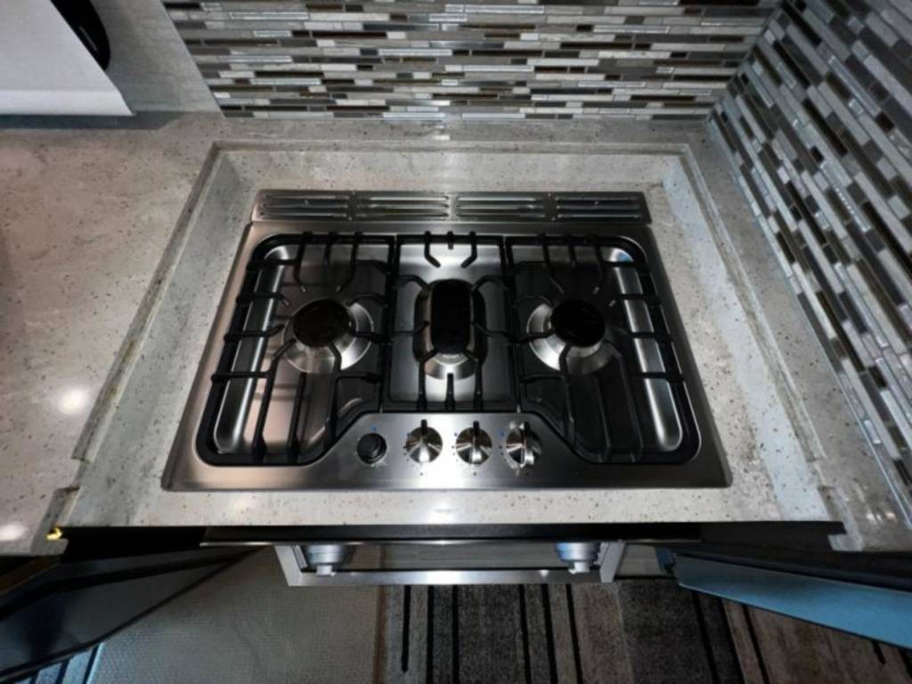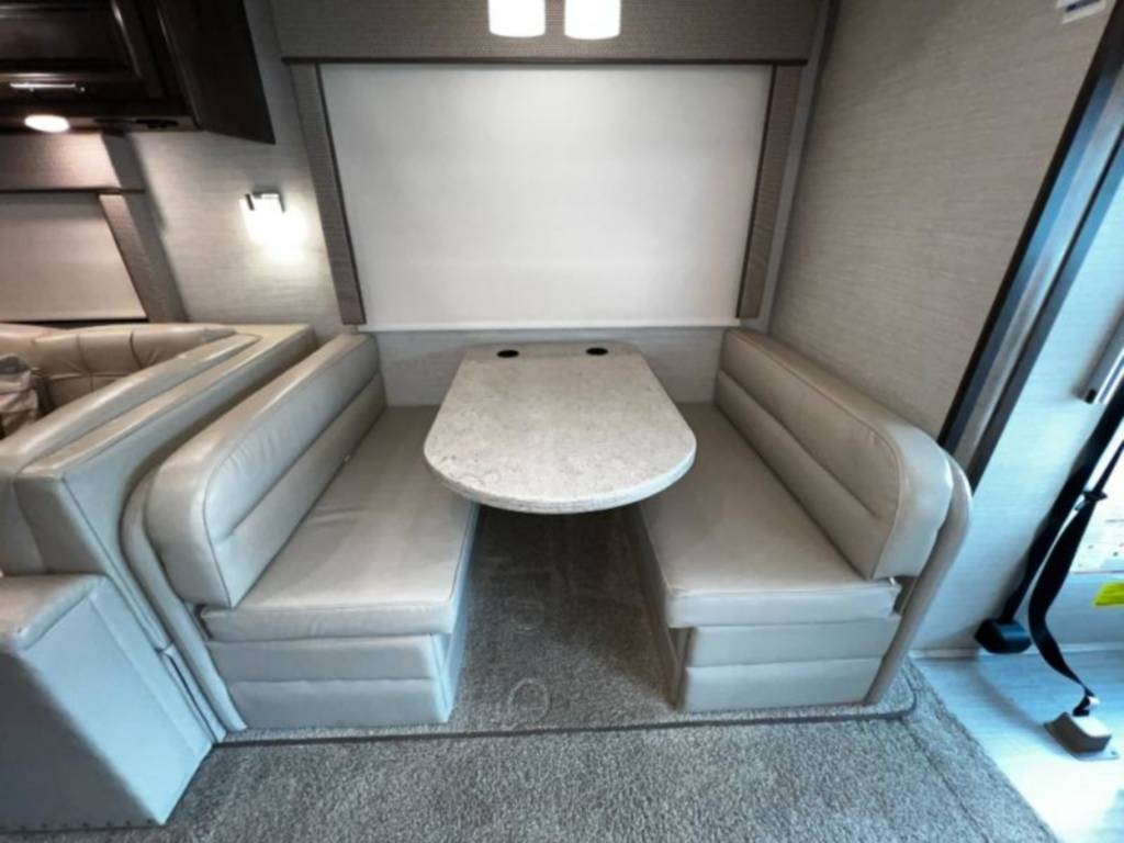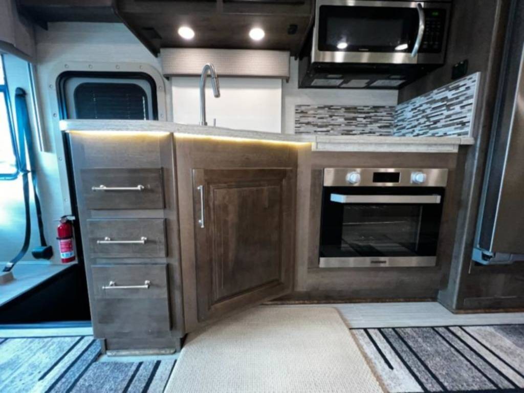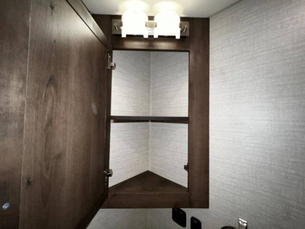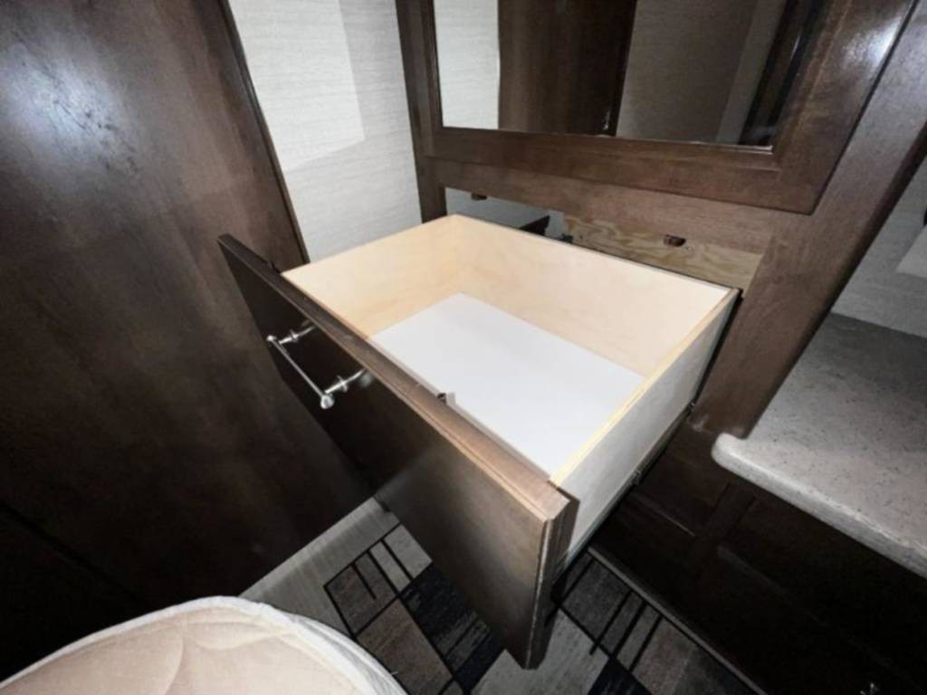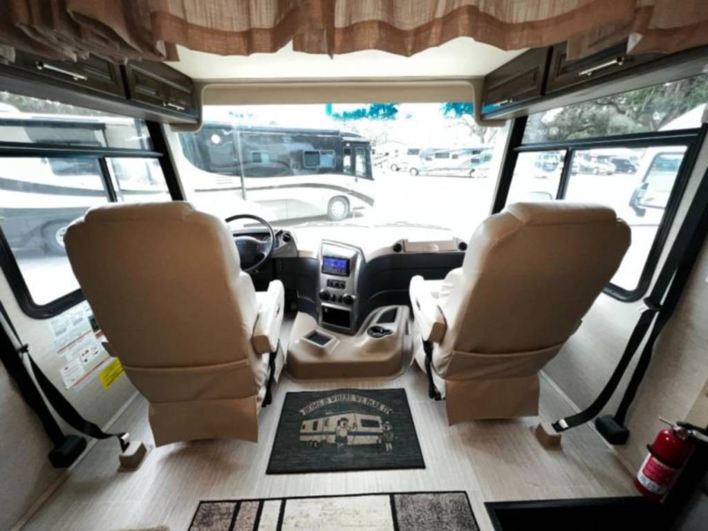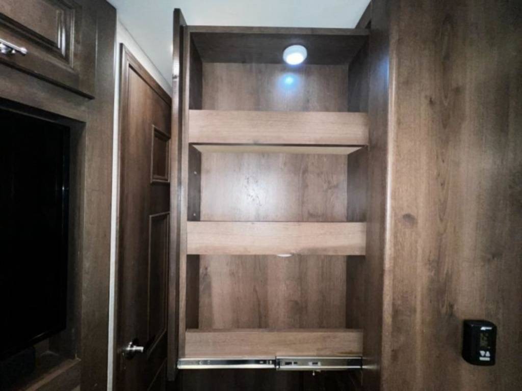 The residential feel of this coach not only promises comforts and conveniences for your entire journey, but the look and feel once you step inside tells you that luxury living is going to be your new way of travel. You are going to enjoy the spacious interior thanks to two nice size slides. Once parked, and the slides are opened up, sink back into the extendable sofa and enjoy a cozy fire in the fireplace as you watch your favorite program on the 39″ LED TV provided. All of the residential appliances will make it easy to cook gourmet meals just like home. And, at bedtime, a king bed is waiting to whisk you off to dreamland! The rear bath offers privacy from the main living area up front, and there is also a half bath easily accessible during the day. Outside, you will find tons of storage space with a lockable pass-through compartment that makes packing and storing your outdoor gear easy, and the 17′ electric awning with outside entertainment center provides a place to hang out both day and night protected from the elements while enjoying a bit of fresh air. You also have the option of adding a drop-down overhead bunk for added guests that wish to spend the night, plus so much more.