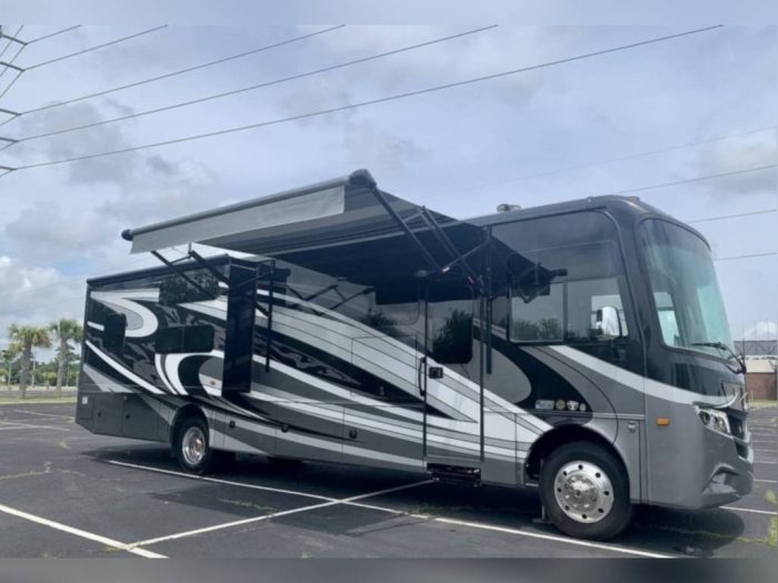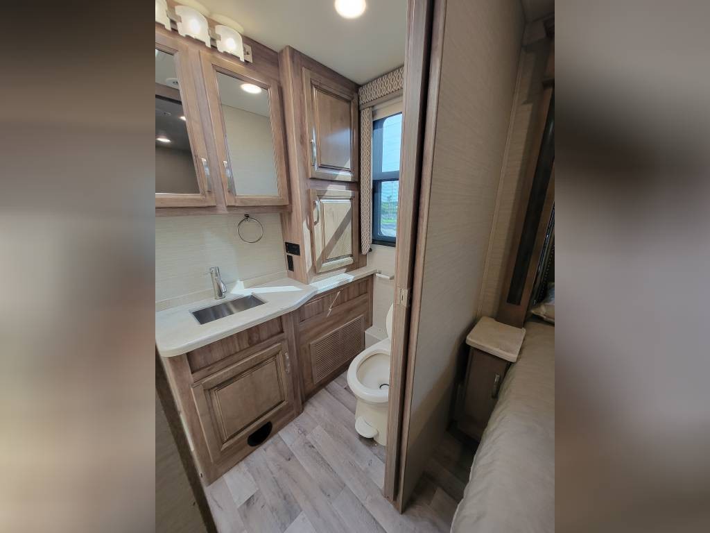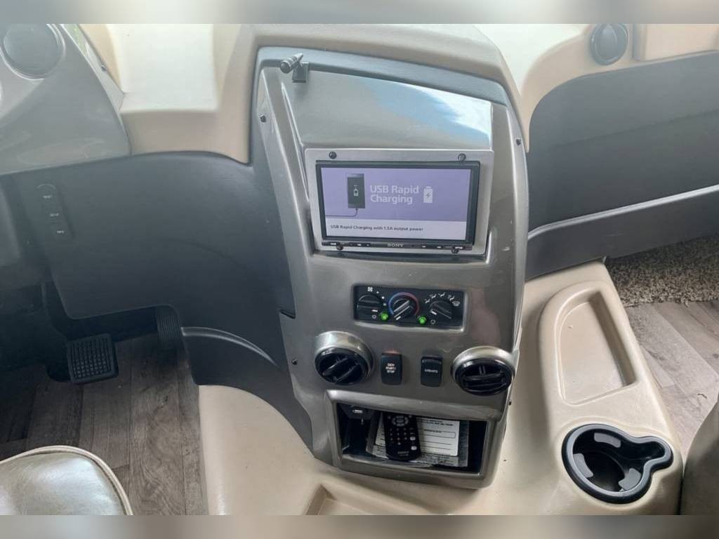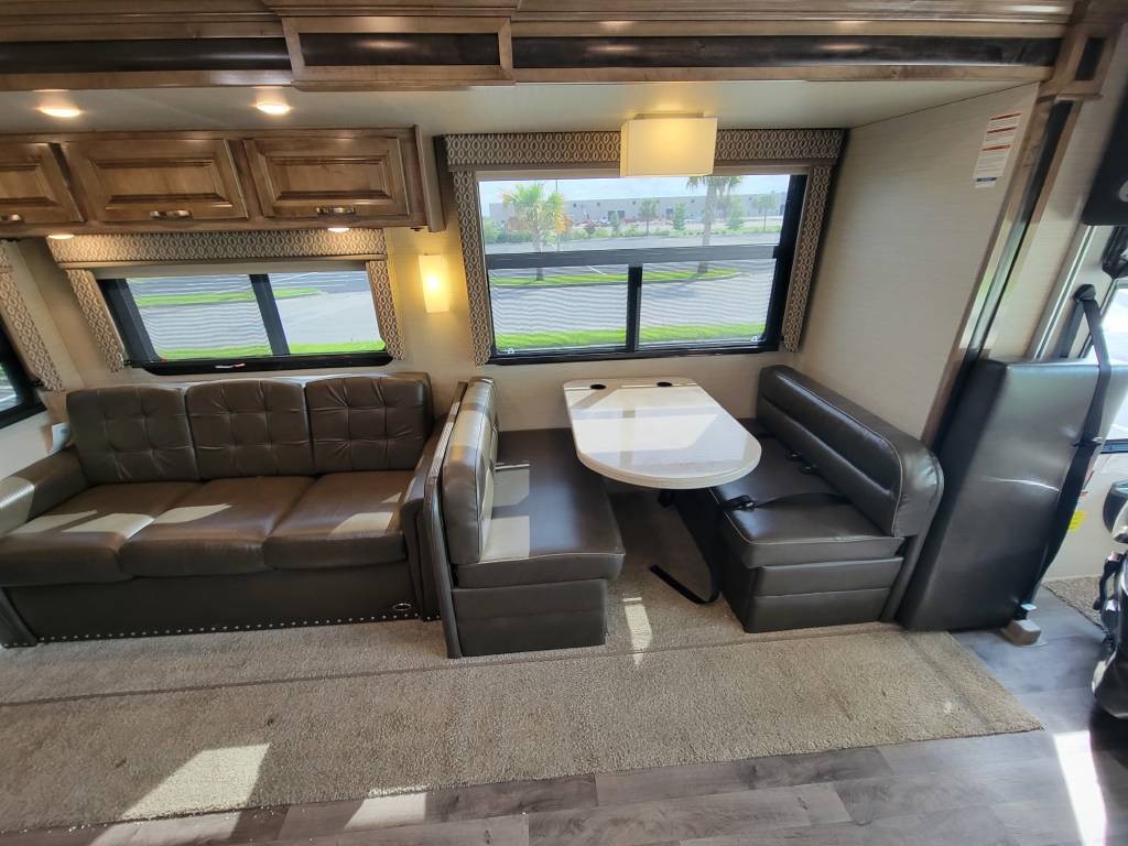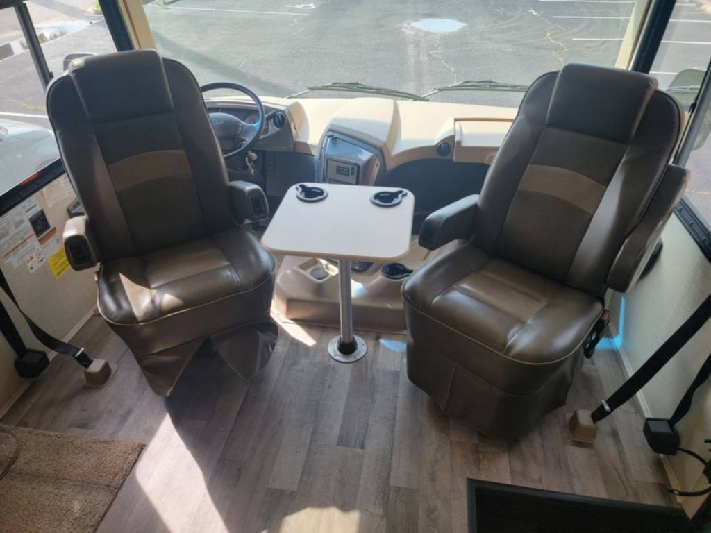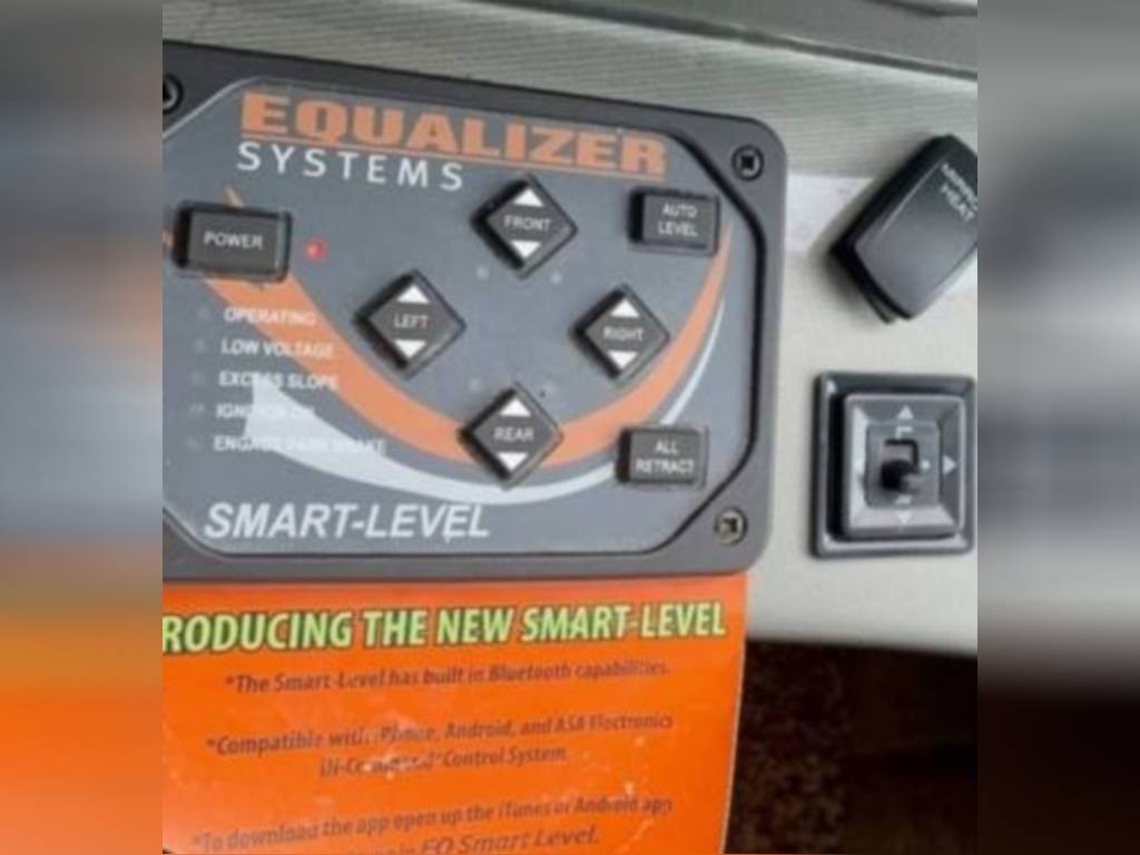 Great for entertaining everyone with a total of 5 televisions, two TV’s for each bunk bed, King master bedroom and main living area and an exterior entertainment center. This one comes with a bath and a half with a much desired large walk-in shower. The kitchen offers the comforts of home including an over sized full refrigerator and freezer that cools in an instant. It comes with gas oven and stove and double sink. Easy access slide out pantry with lots of elegant countertop space. Two AC units and Auto Level system! The fireplace makes an added bonus on cooler evenings. Lots of sleeping option with over the cab bed with ladder, dinette sleeper, King master and two bunk beds plenty of room for everyone. The spacious and well thought out Floorplan makes entertaining easy. This RV has only been used once! The previous owner ran it into a fence and caused cosmetic damage to the front cab and windshield.