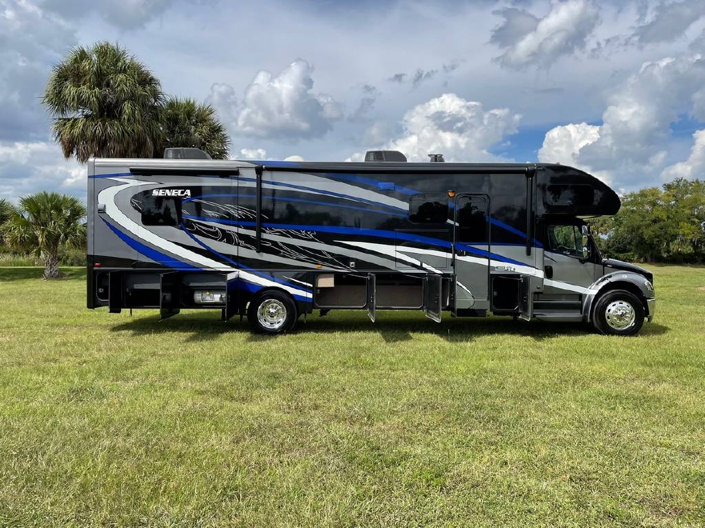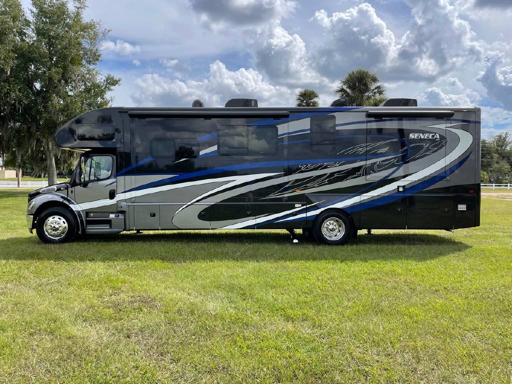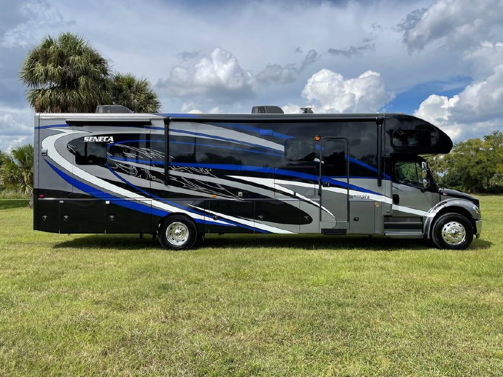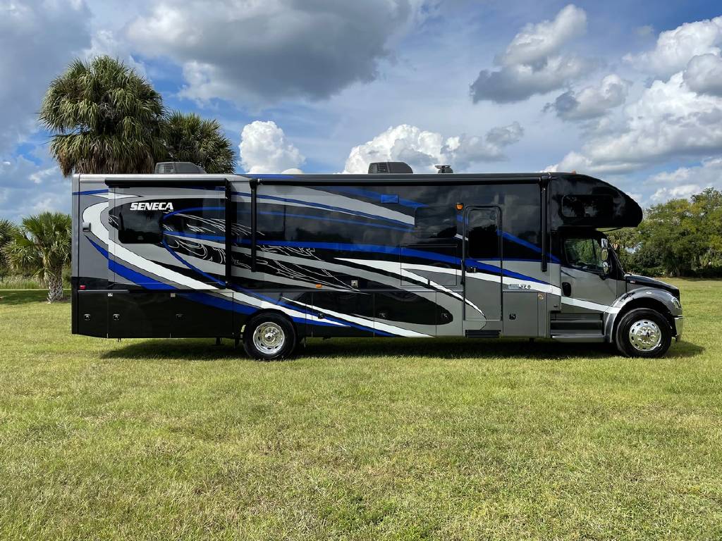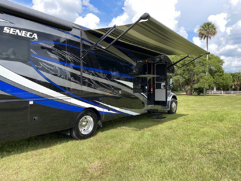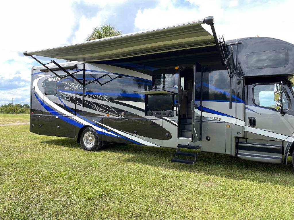 2019 Jayco Seneca 37HJ 3 slide motorhome with 13,166 miles. This coach is on a Freightliner S2RV chassis powered by a Cummins ISB 6.7L 360HP Diesel engine with Allison Transmission. This coach includes cab-over bunk, Fireplace w/ 39″ TV, Hide-A-Bed, Dinette, Residential Fridge, King Bed, Outdoor Entertainment & more !!!