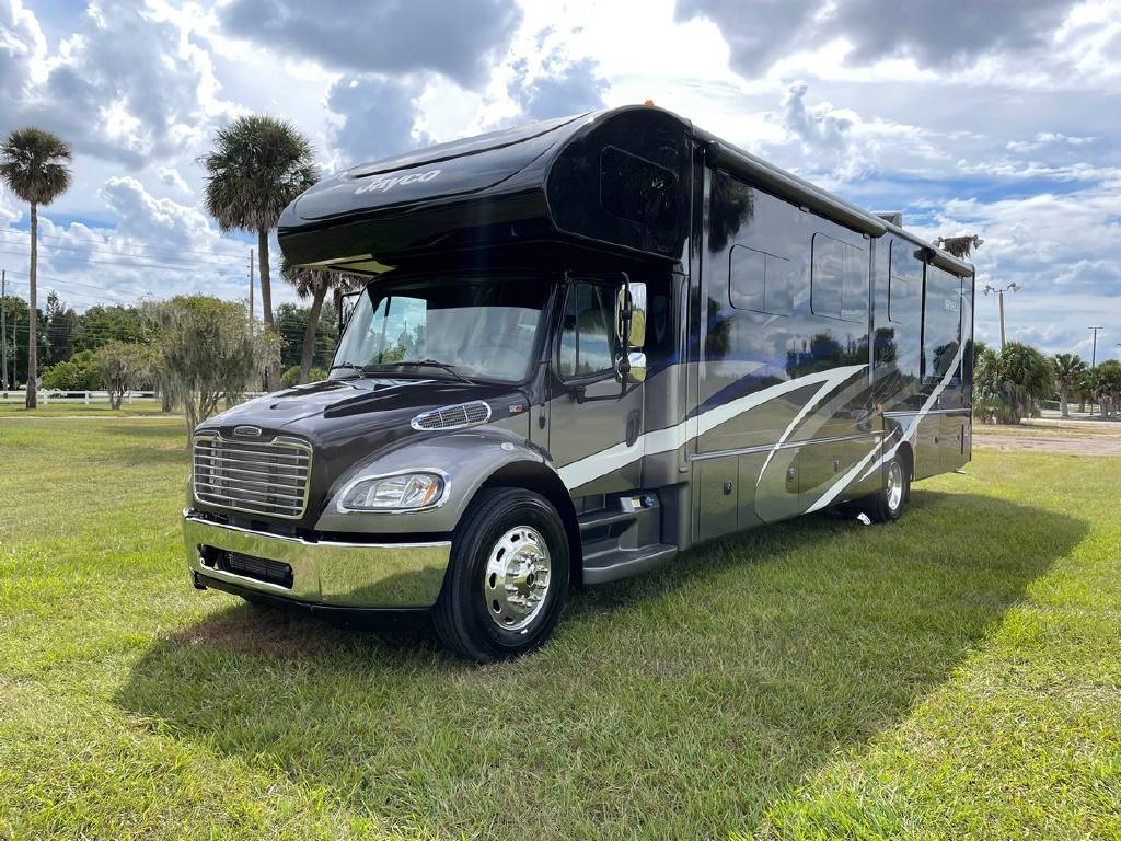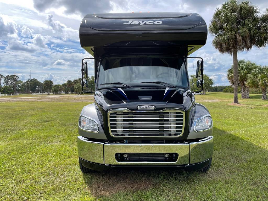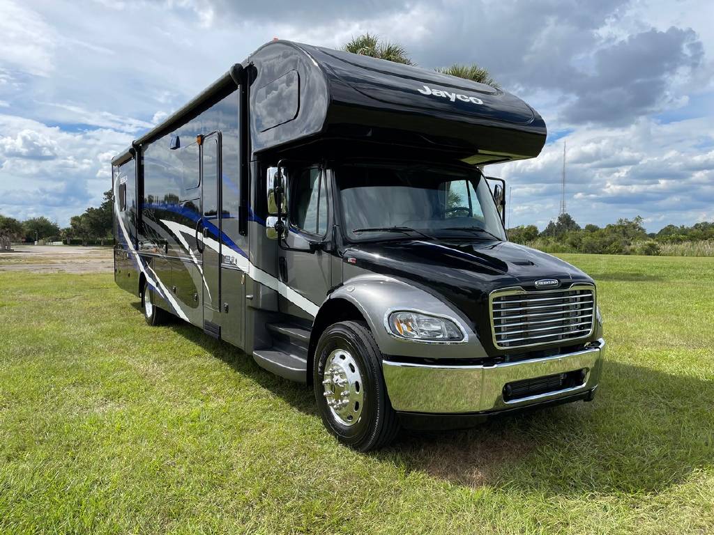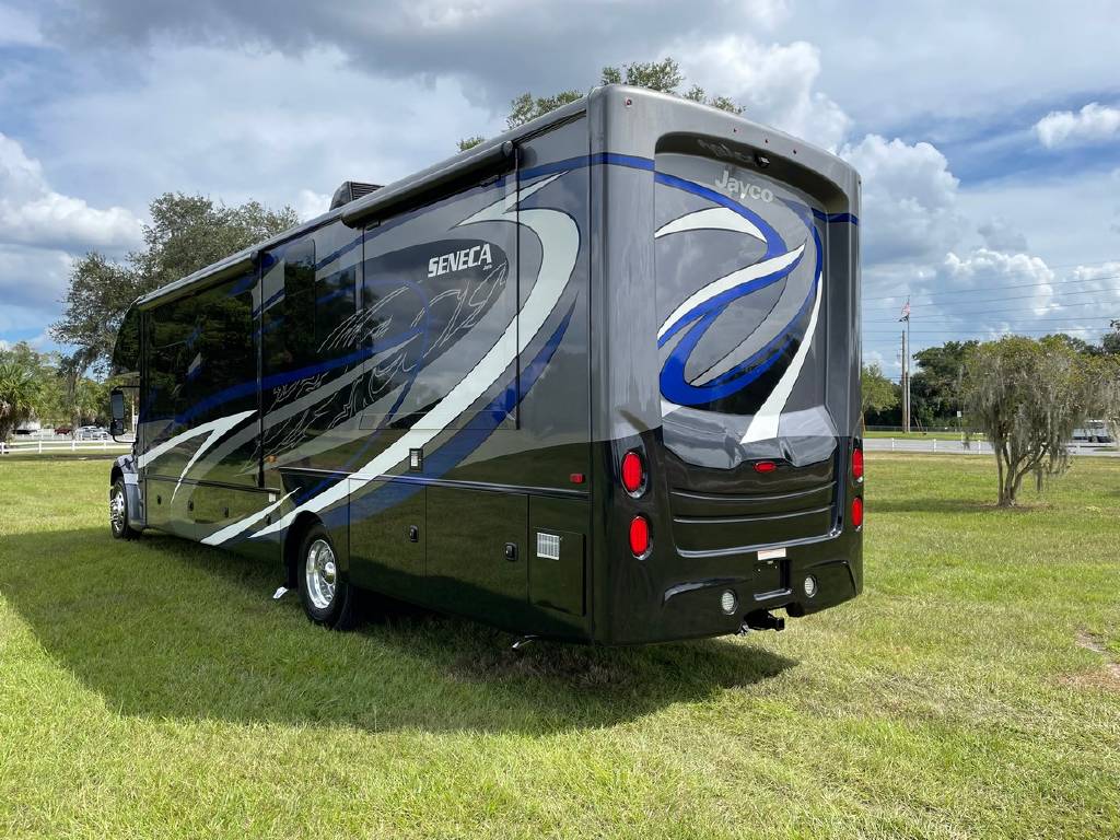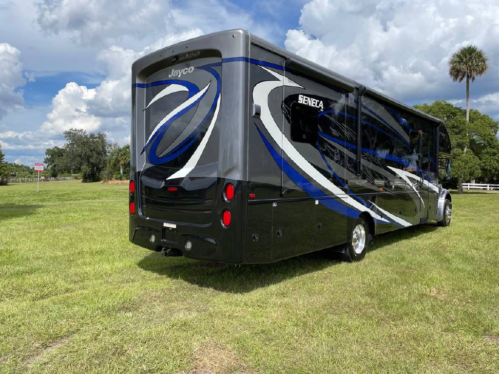 2019 Jayco Seneca 37HJ 3 slide motorhome with 13,166 miles. This coach is on a Freightliner S2RV chassis powered by a Cummins ISB 6.7L 360HP Diesel engine with Allison Transmission. This coach includes cab-over bunk, Fireplace w/ 39″ TV, Hide-A-Bed, Dinette, Residential Fridge, King Bed, Outdoor Entertainment & more !!!