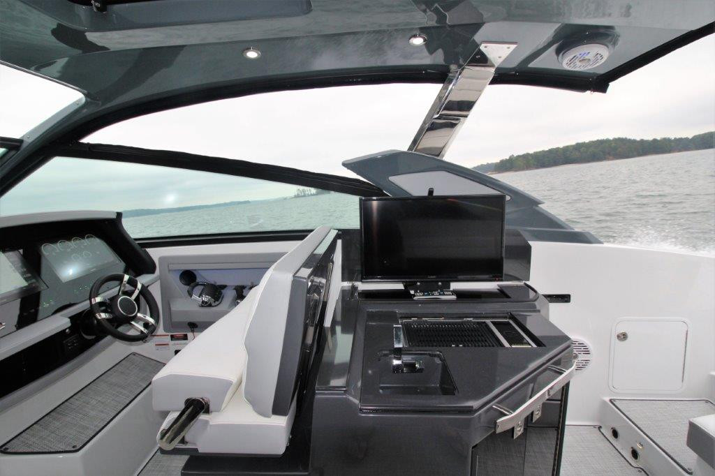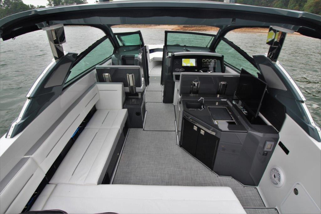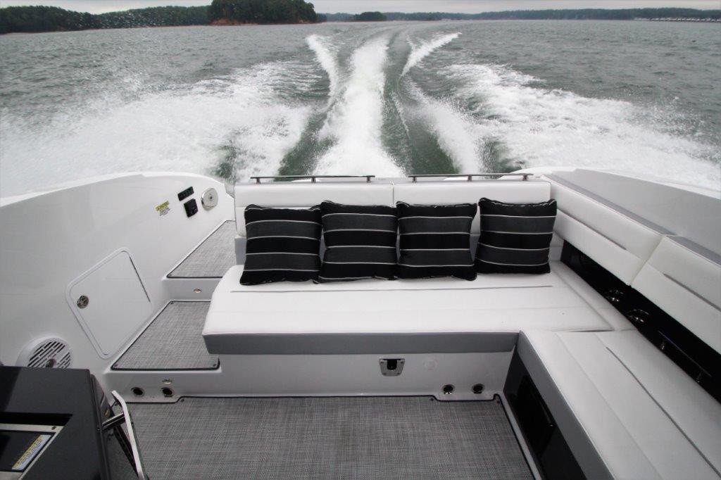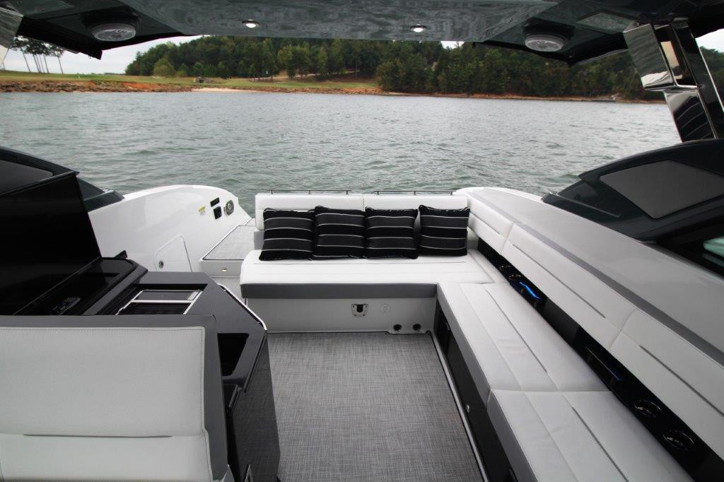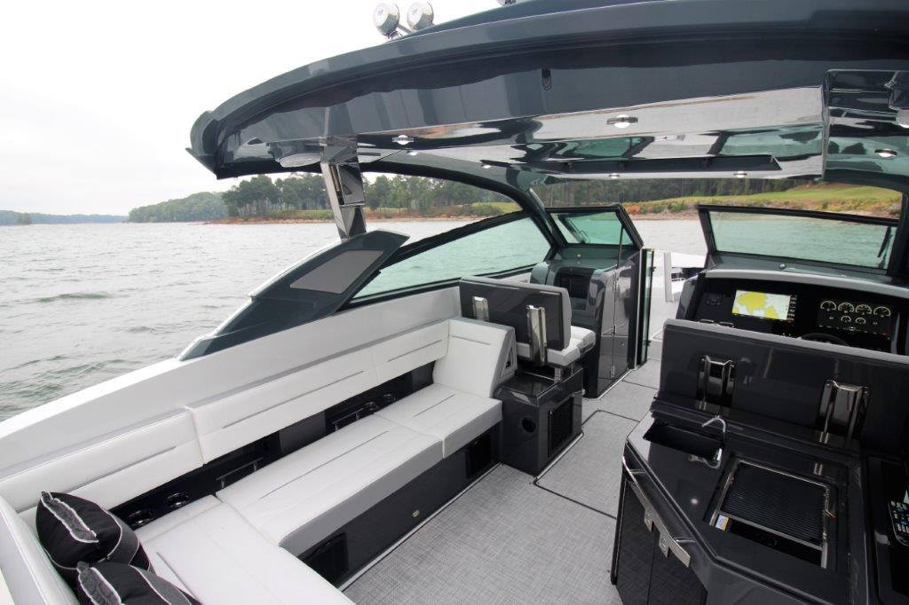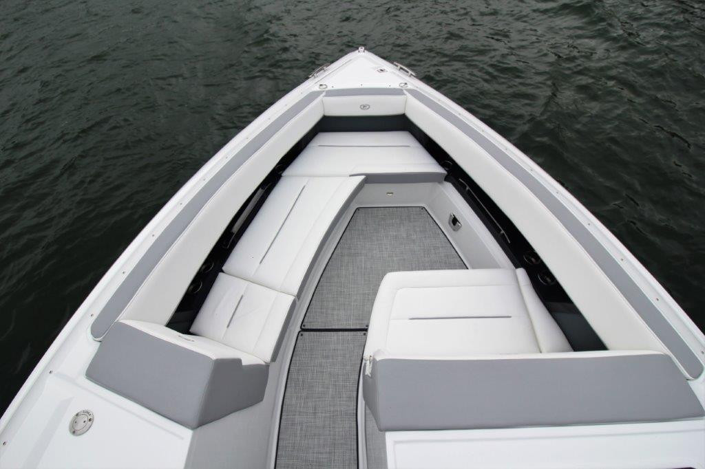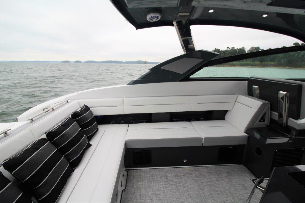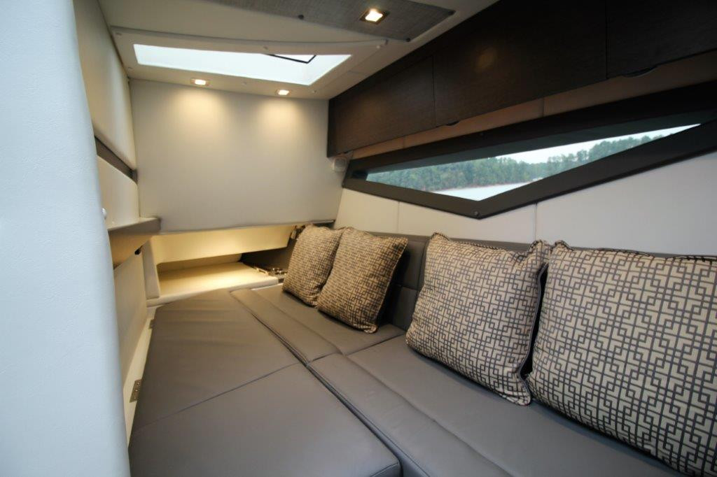 With deeper, more spacious bow seating than ever before, the all new A36BR combines the coupe-top design and popular appearance of the A-Series, but adds additional seating and a more ergonomical cockpit. The A36BR maintains its high-end, roomy feel with a cabin featuring a hidden filler cushion that folds down to create a sleeping surface for two, just another way Cobalt is once again extending the luxury boating experience.