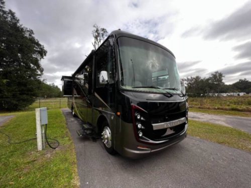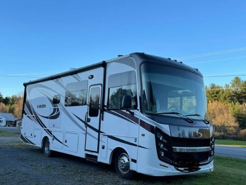One-owner 2021 Coachman Encore ERA325SSF! This Class A beauty is paired with a Ford F53 Chassis and the 7.3L V8 Godzilla Gas engine with 350 HP and 468 lb ft. of torque. This RV has high definition back up and side cameras, automatic leveling jacks, outdoor kitchen with sink & mini fridge, exterior TV with Bluetooth Audio Speakers in the awning, roof-mounted 100-watt solar panel, frameless tinted windows, exterior heated bus mirrors, 20% angled dash, 40″ LED living room TV, fiberglass front and rear caps, ***1-piece laminated pebbled fiberglass roof with AZDEL composite (walkable)***, electric 5,000 BTU fireplace, stackable washer and dryer, ***Safe T Plus Front Stabilizer***.
