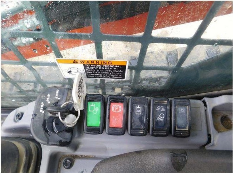 cab, heat, air, 325 hours, quick coupler, aux hyd, bucket positioning, 74″ bucket, Warranty