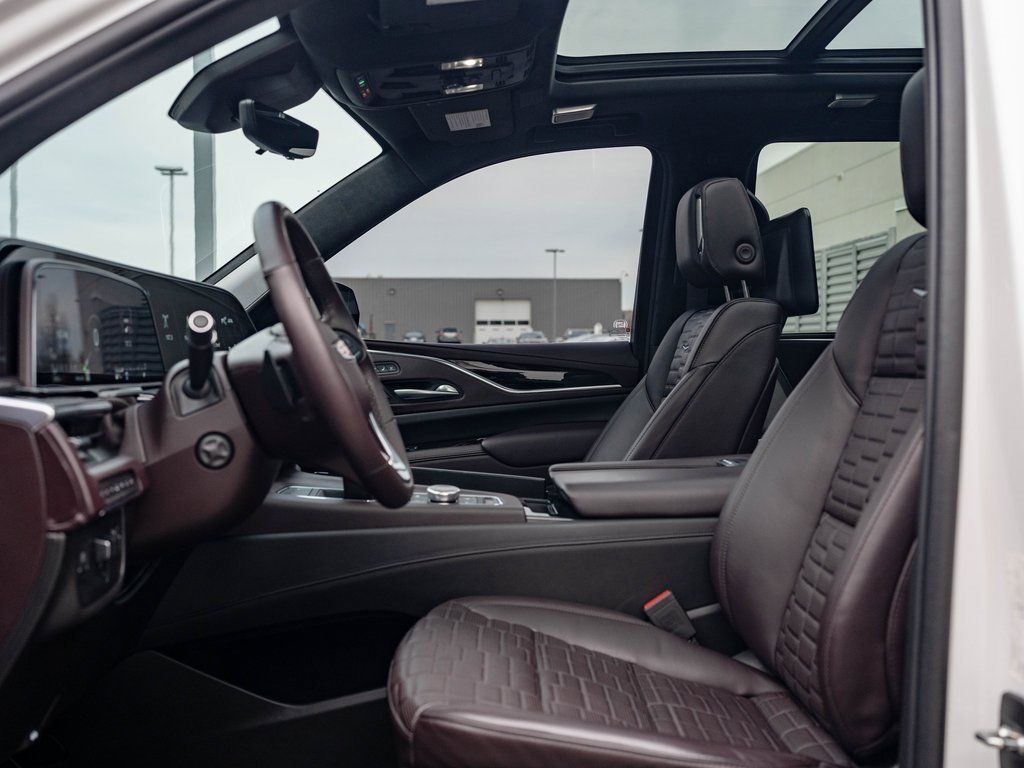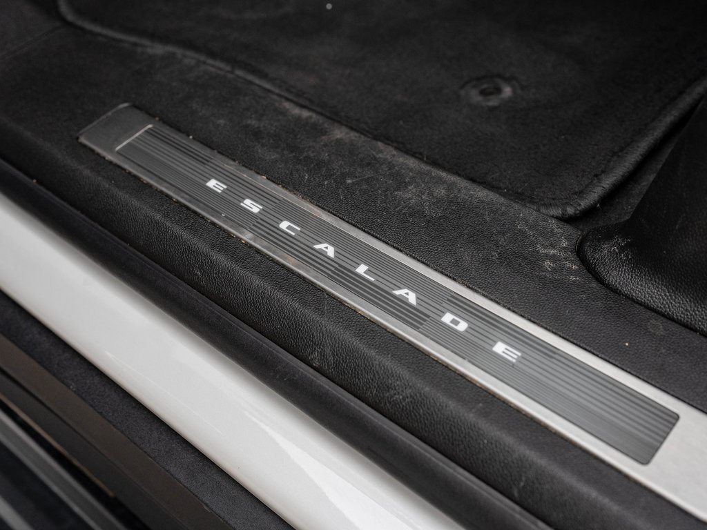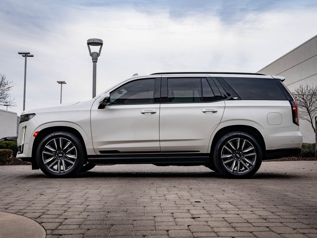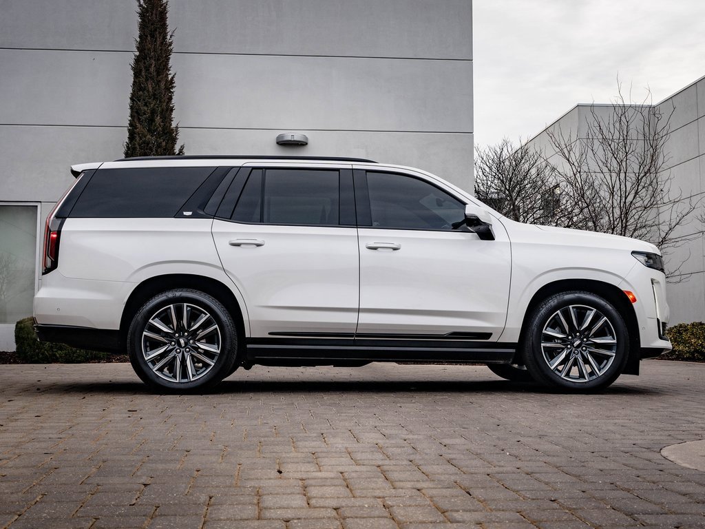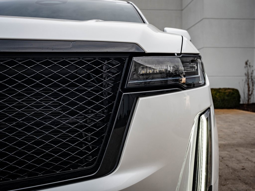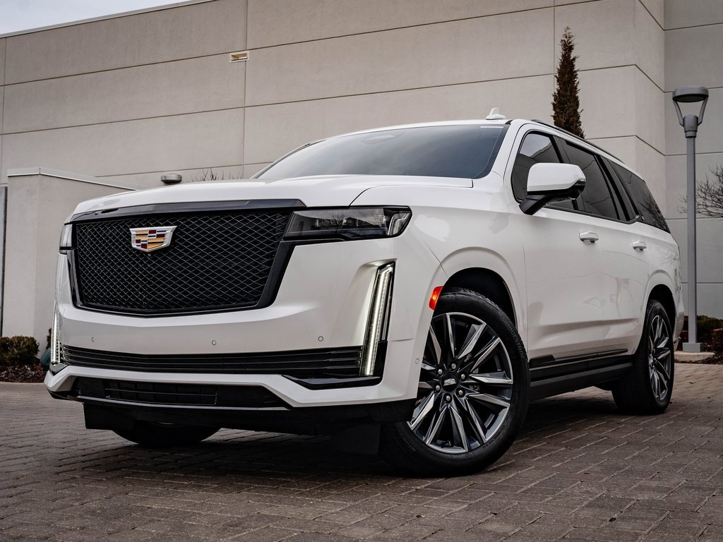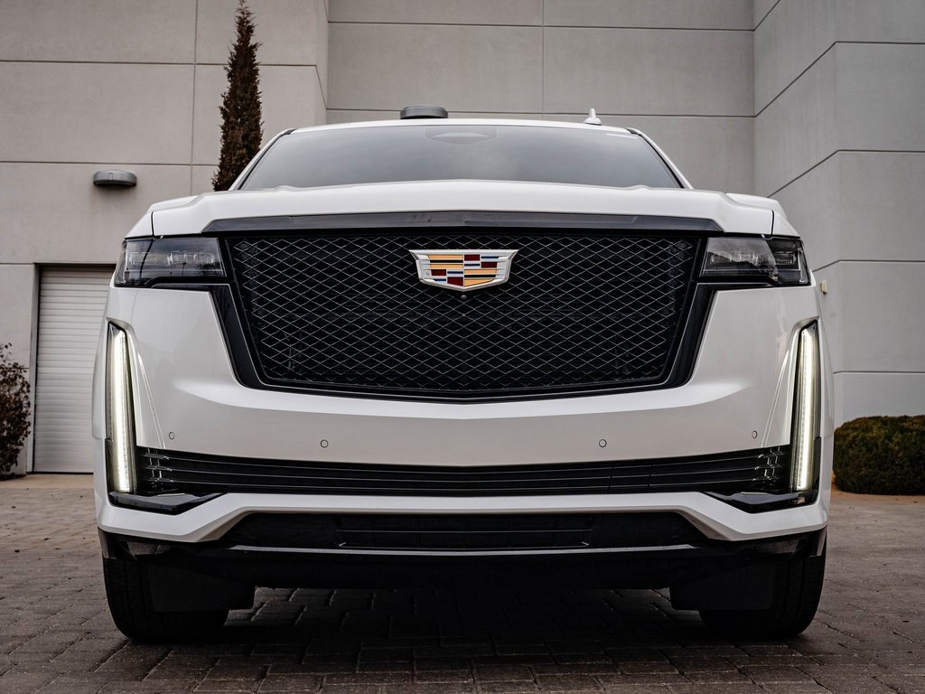 2023 Cadillac Escalade Sport Platinum, located at Jaguar Land Rover of Wichita. Original MSRP Crystal White Tricoat with Dark Auburn/Black Leather interior . This Escalade is equipped with the Driver Assist Tech Package. Package options and additional features consist of Adaptive cruise control, Front collision warning, Rear cross traffic warning, Park assist, Navigation with Surround view camera, Head-up display, Remote start system, Apple CarPlay, Android Auto, Sunroof, Heated and Ventilated front seats, Heated steering wheel, Heated 2nd row seats, and SiriusXM (subscription required).